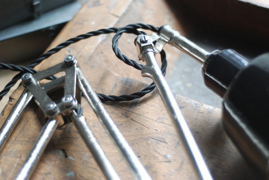 After the thorough dismantling cleaning of all elements, the lamp was nickel plated and rebuilt again. All the small parts have been cleaned, polished, oiled.