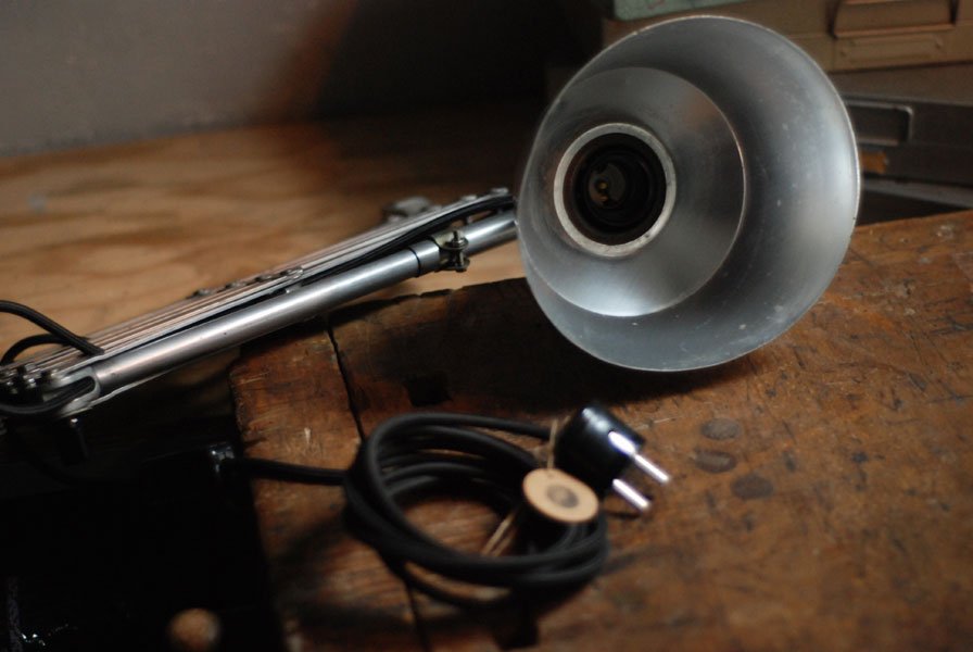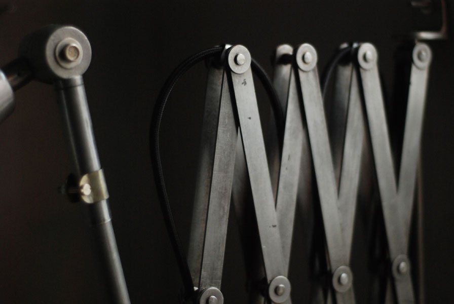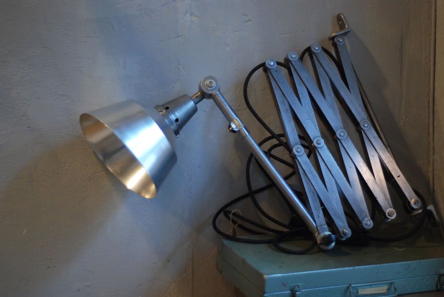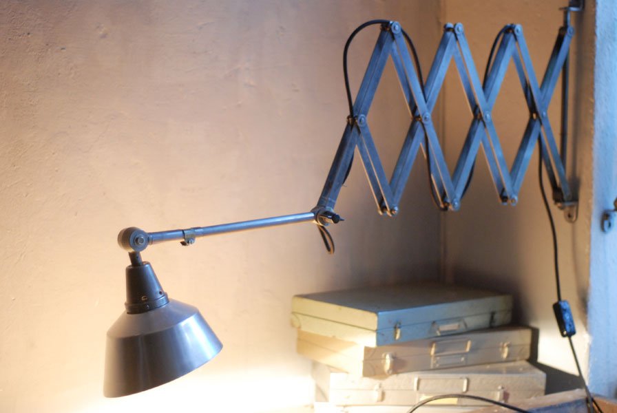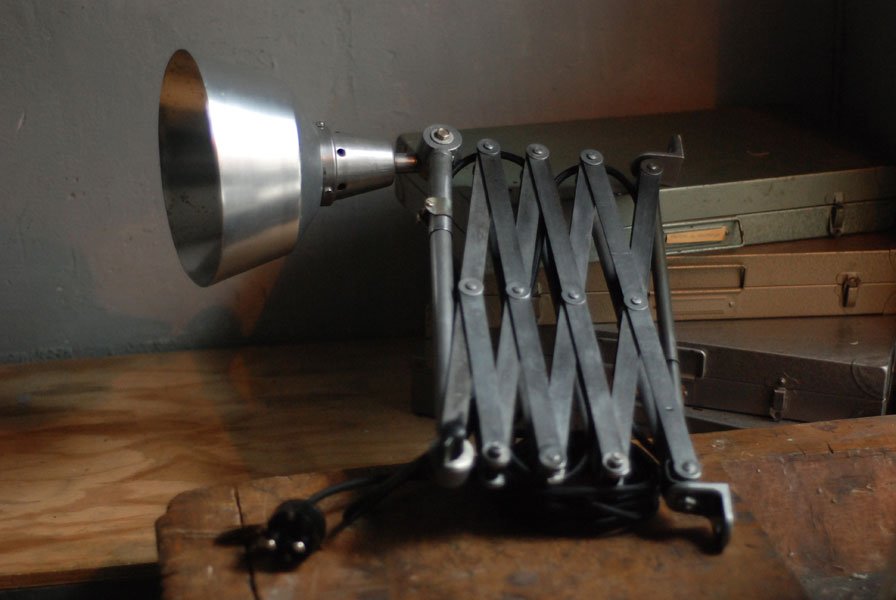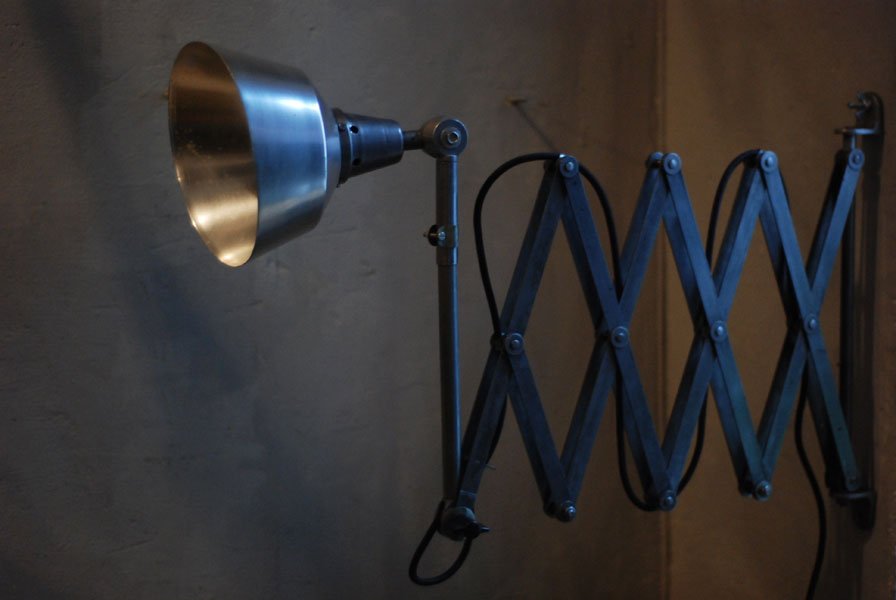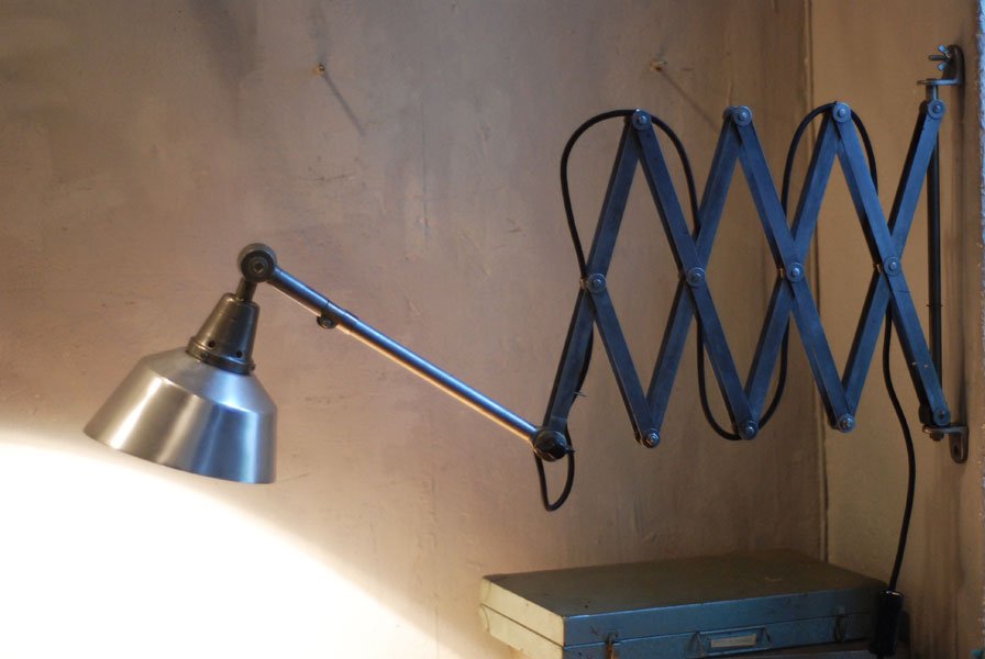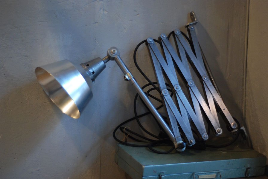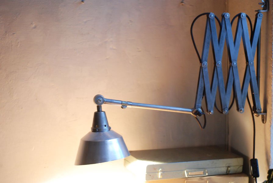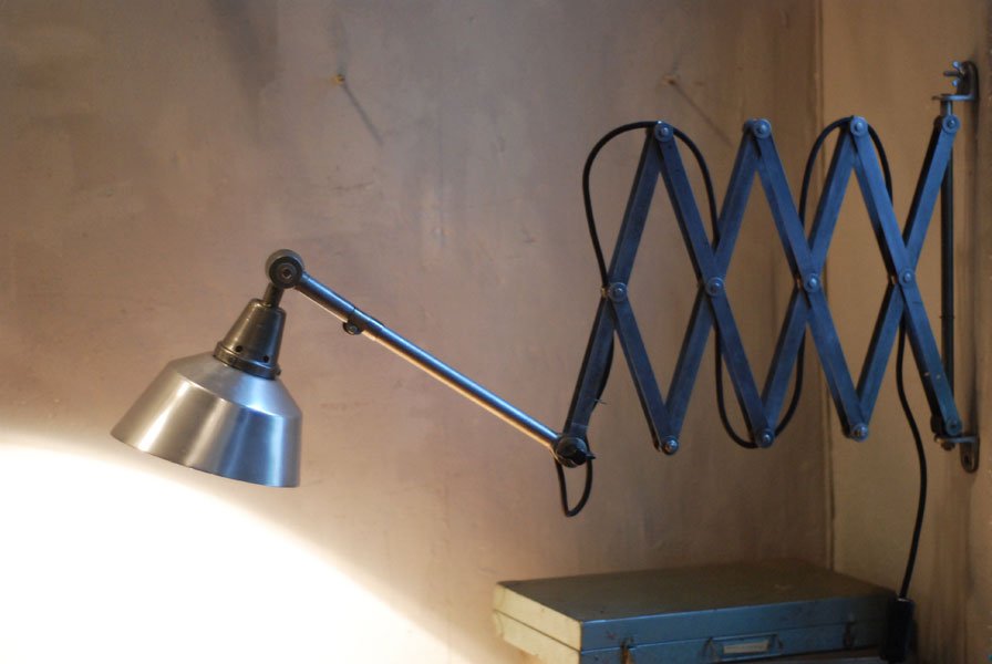 The design of this vintage scissor lamp was developed by Curt Fischer, who worked on the idea of the ‘steerable light’ from approx. 1920 on. Even before the well known designs by Christian Dell or Marianne Brandt, Curt Fischer realized the idea of the so-called ‘steerable light’ with the all-round movable work lamp. The metal workshop at the Weimar Bauhaus was lit with Midgard lights, serving as an example to Bauhaus students, and was used later in Ilse and Walter Gropius’ master house livingroom at the Dessau Bauhaus.