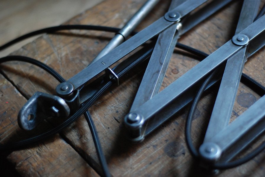 Biggest Midgard from the DDR upcycled scissor lamp in steel look with shade made of aluminium