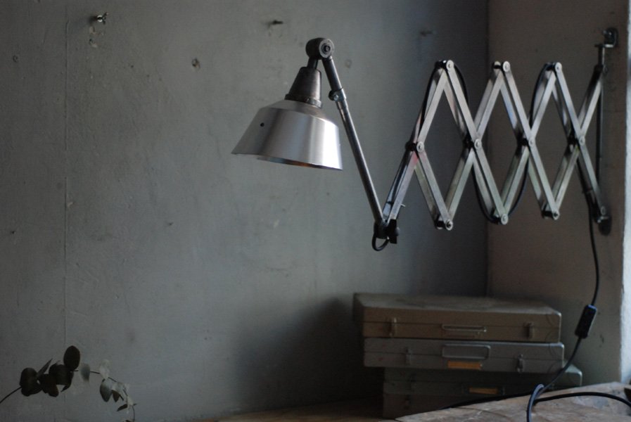 The design of this vintage scissor lamp was developed by Curt Fischer, who worked on the idea of the ‘steerable light’ from approx. 1920 on. Even before the well known designs by Christian Dell or Marianne Brandt, Curt Fischer realized the idea of the so-called ‘steerable light’ with the all-round movable work lamp. The metal workshop at the Weimar Bauhaus was lit with Midgard lights, serving as an example to Bauhaus students, and was used later in Ilse and Walter Gropius’ master house livingroom at the Dessau Bauhaus.