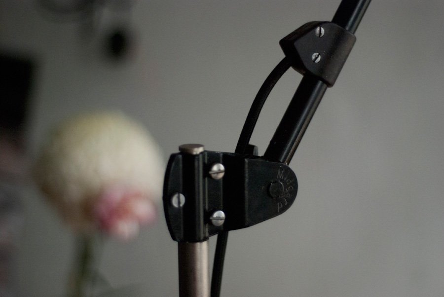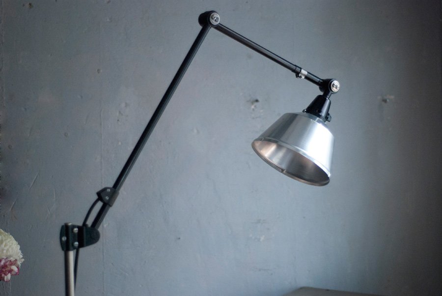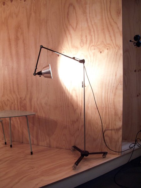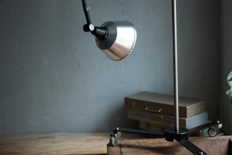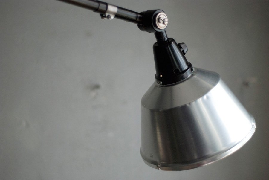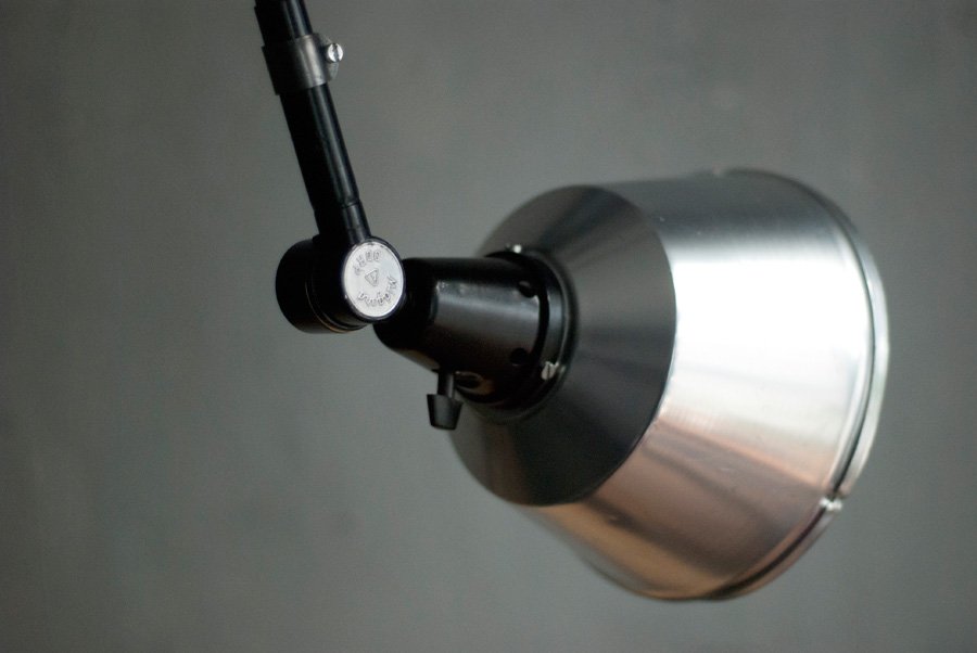The design of this unique rollable floor lamp with double joint comes from the Curt Fischer, CA 1920 has worked on the idea of “steerable light”. Before the well-known designs by Christian Dell, or Marianne Brandt, Curt Fischer with the all-round mobile workstation lighting implemented the idea of so-called ‘steerable light’. The metal workshop at the Bauhaus in Weimar was lit with Midgard lights and the Bauhaus students and served as inspiration, and is verifiable in the living room furniture by Ilse and Walter Gropius in their house at the Dessau Bauhaus.