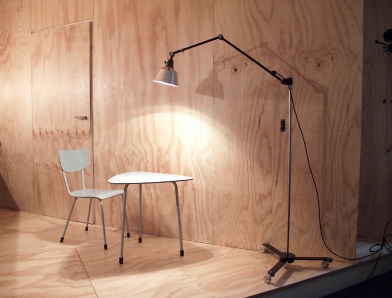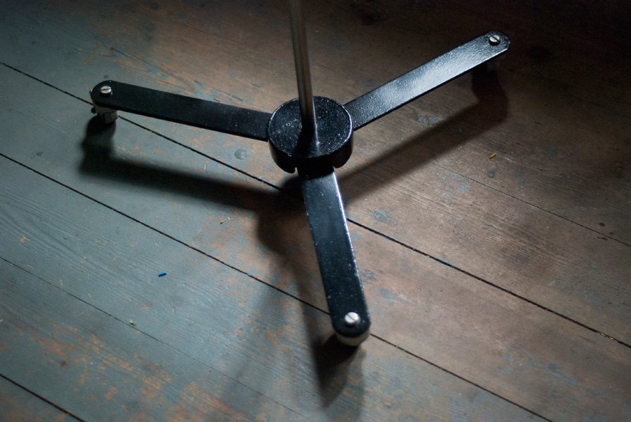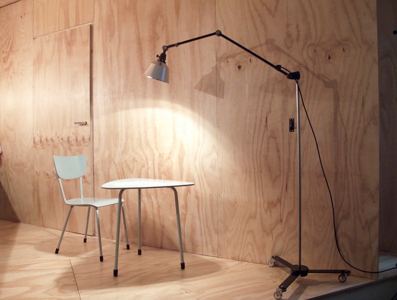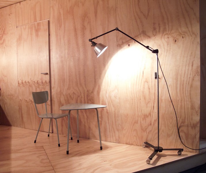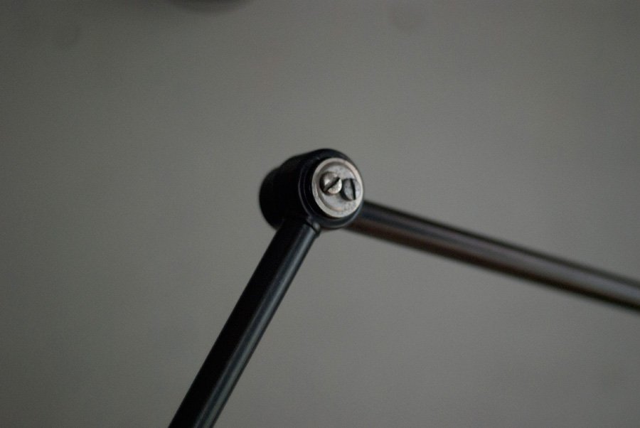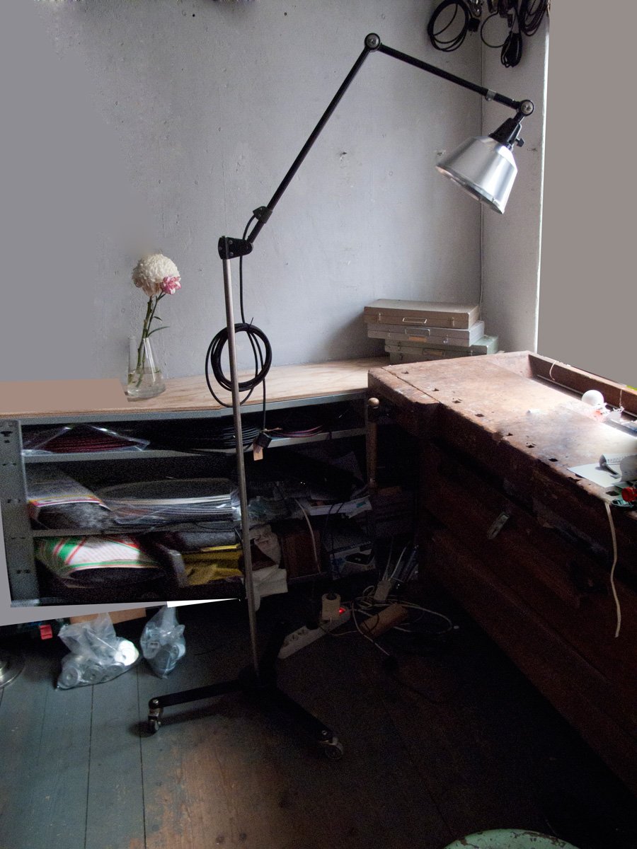The design of this unique rollable floor lamp with double joint comes from the Curt Fischer, CA 1920 has worked on the idea of “steerable light”. Before the well-known designs by Christian Dell, or Marianne Brandt, Curt Fischer with the all-round mobile workstation lighting implemented the idea of so-called ‘steerable light’. The metal workshop at the Bauhaus in Weimar was lit with Midgard lights and the Bauhaus students and served as inspiration, and is verifiable in the living room furniture by Ilse and Walter Gropius in their house at the Dessau Bauhaus.