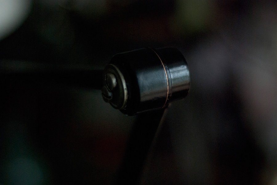 The light is operated by the original rotary switch made of bakelite at the head. The technology of the light works fine. The electrical system has been renewed with a three-wire  black cord.