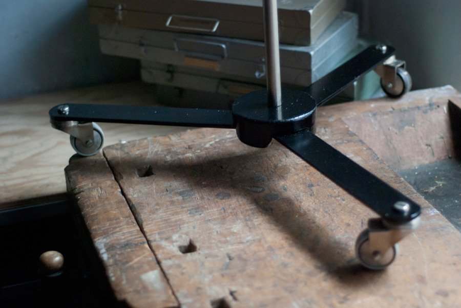 Black hinged lamp Midgard with aluminium shade on rollable three star base.