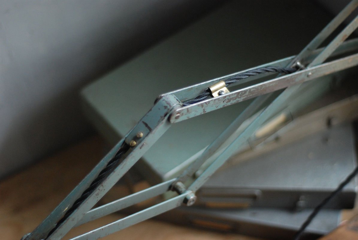 The design of this vintage scissor lamp manufactured around 1925-1930 was developed by Curt Fischer, who worked on the idea of the ‘steerable light’ from approx. 1920 on. Even before the well known designs by Christian Dell or Marianne Brandt, Curt Fischer realized the idea of the so-called ‘steerable light’ with the all-round movable work lamp. The metal workshop at the Weimar Bauhaus was lit with Midgard lights, serving as an example to Bauhaus students, and was used later in Ilse and Walter Gropius’ master house livingroom at the Dessau Bauhaus.