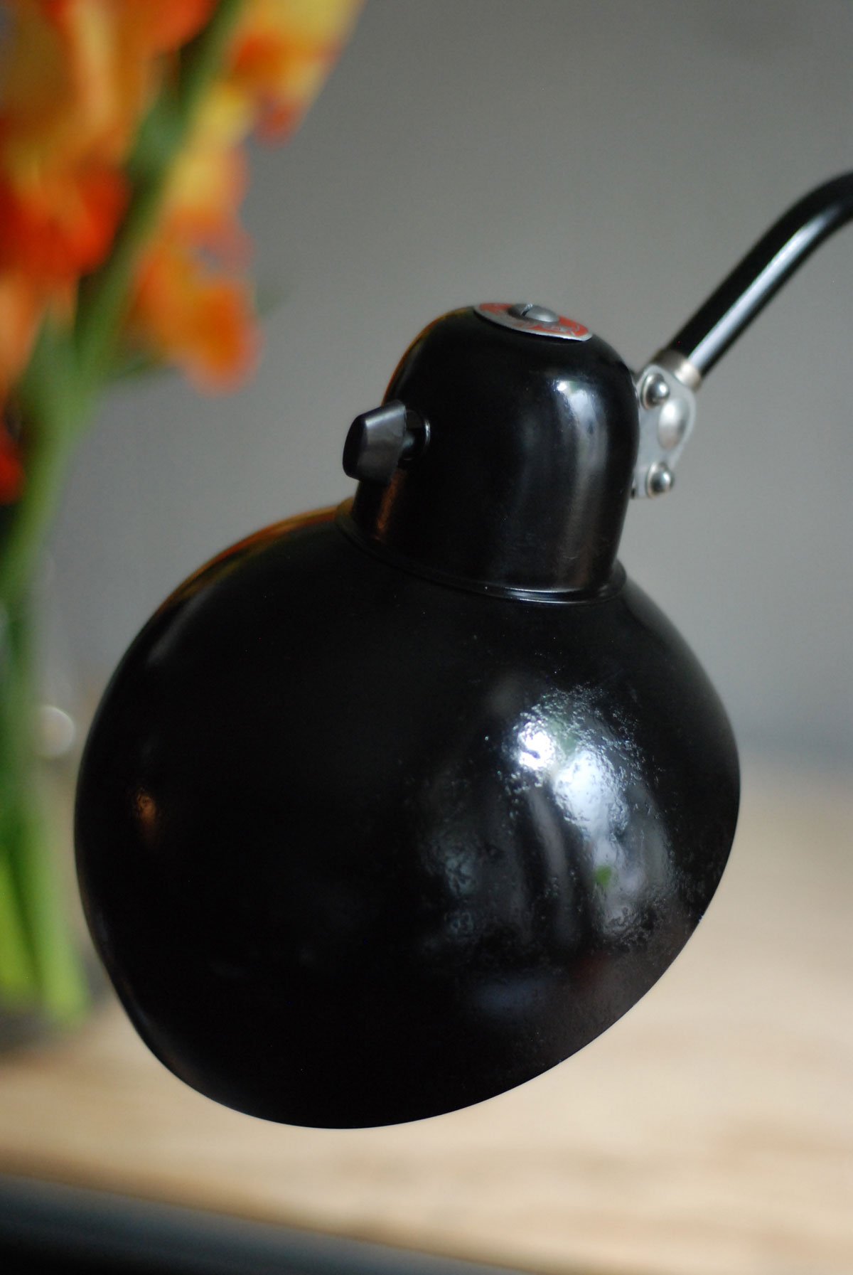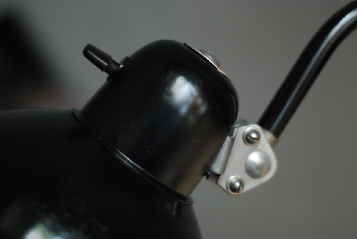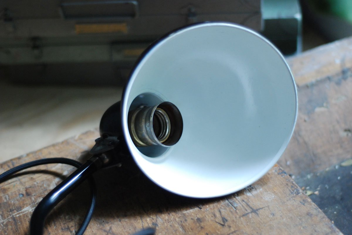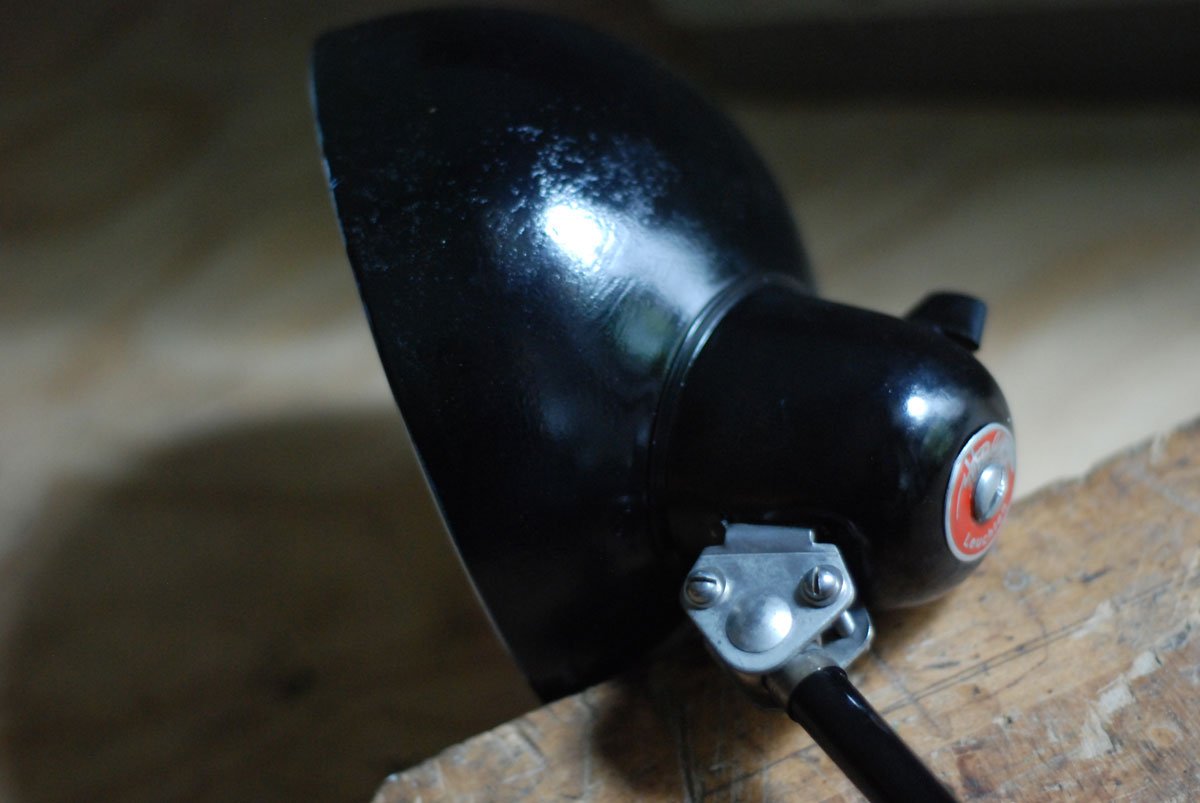 Its restored condition is very good. The lamp has a few signs of wear consistent with its age and use. The shade has a nice patina and the back side is a bit distorted, what doesn’t disturb the function.