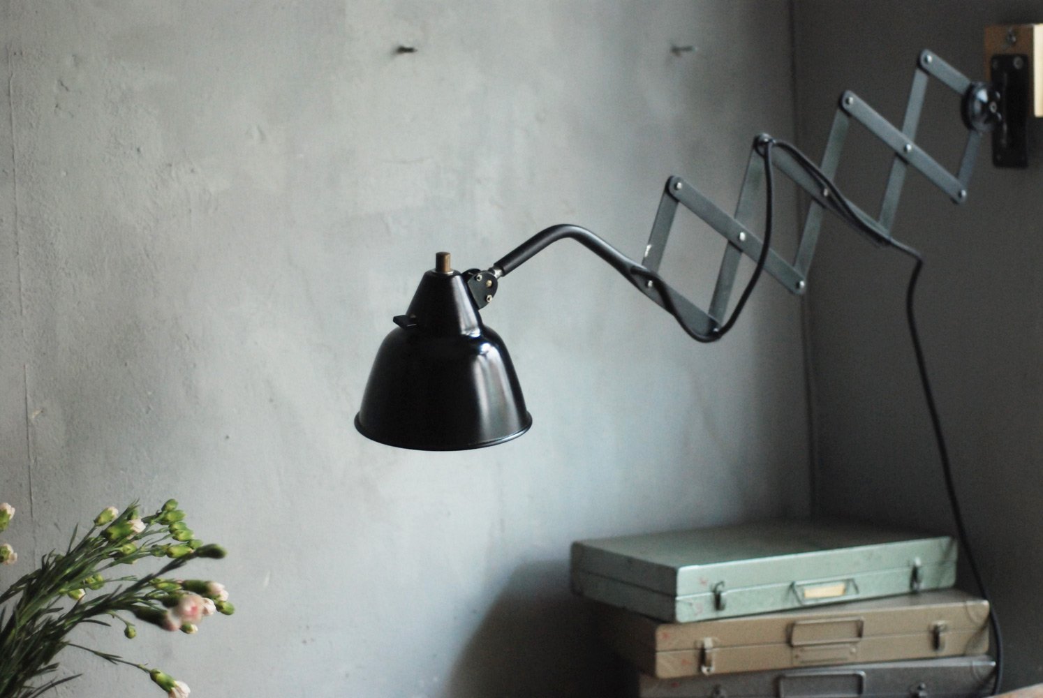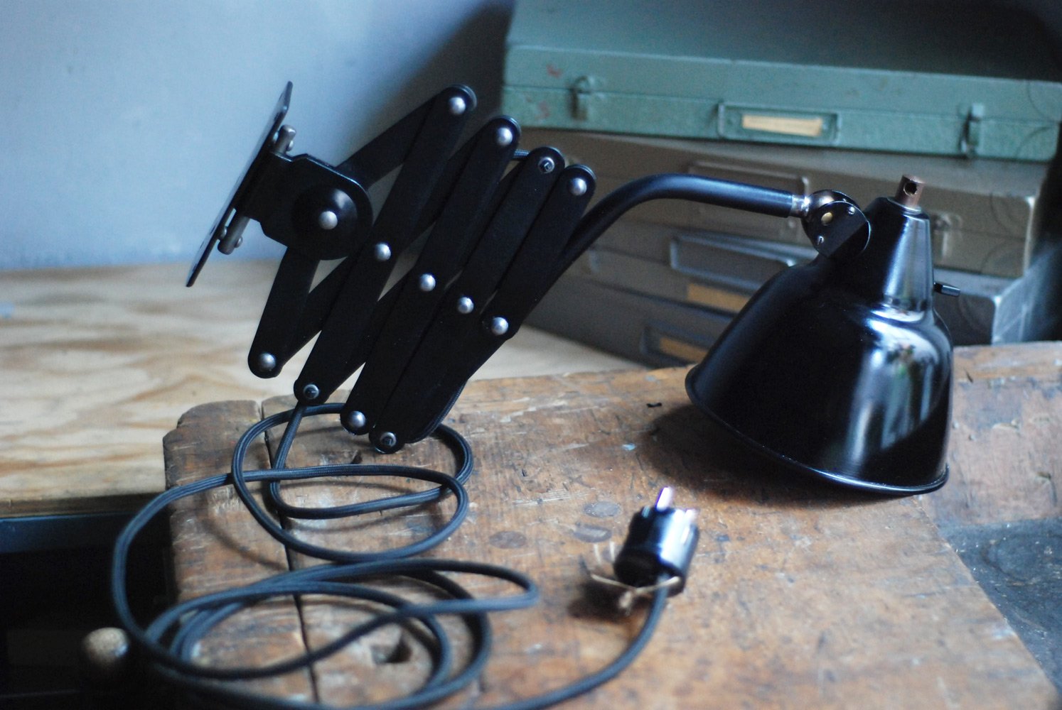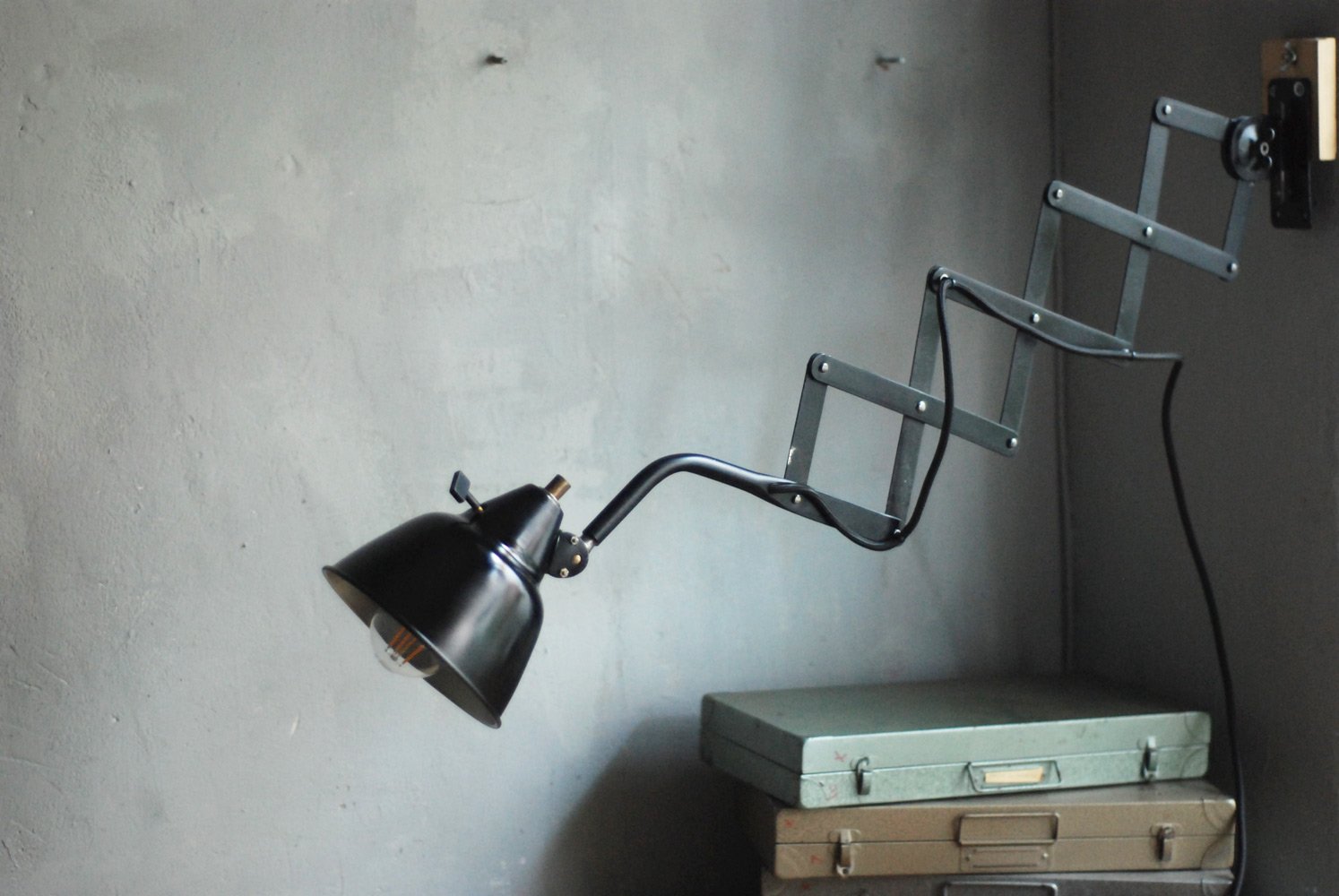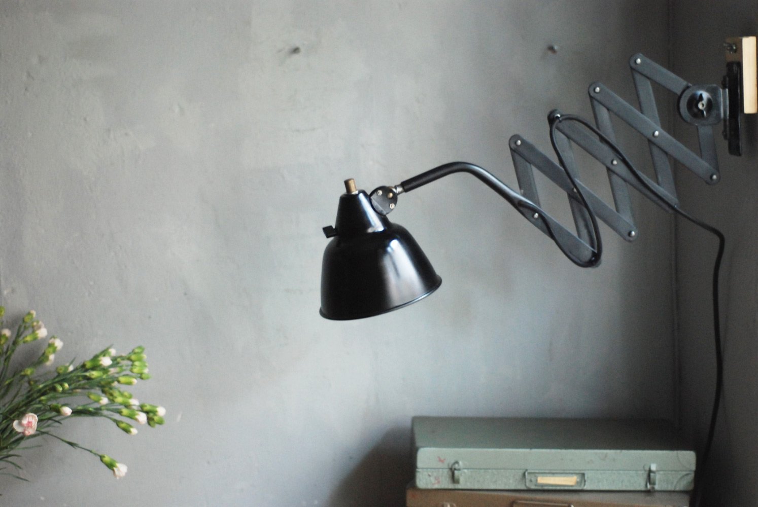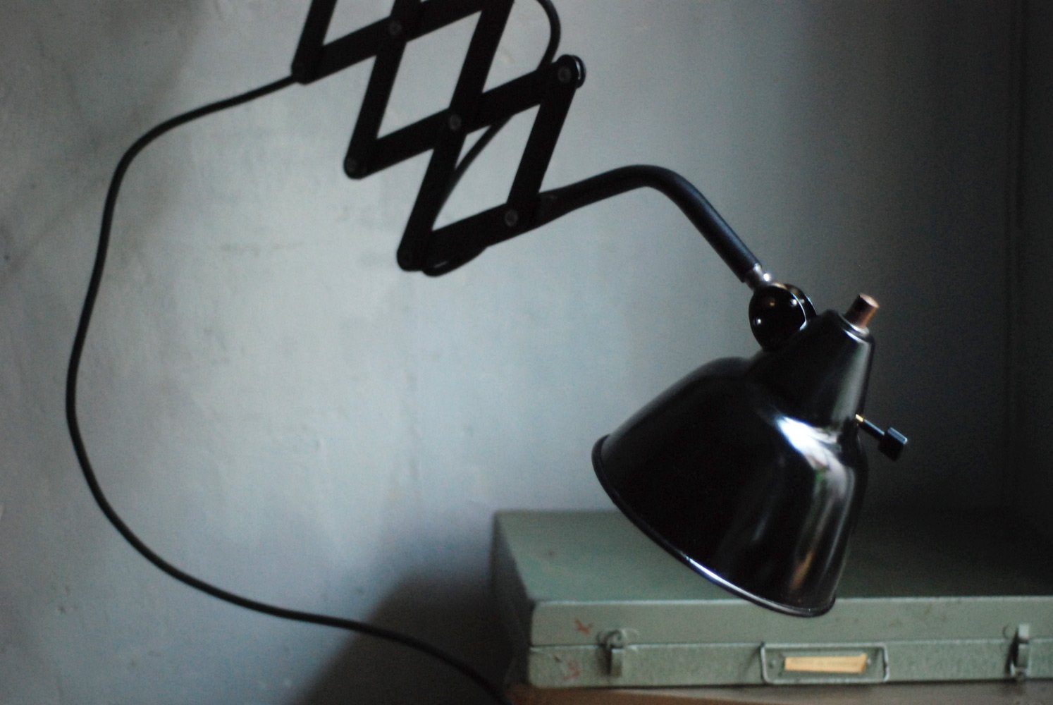 Helo black scissor lamp HELO Leuchten is a trademark of the Kaiser & Co. Leuchten KG company, for which Christian Dell designed an extensive series of lamps from 1933. After the thorough dismantling and cleaning of all elements, the lamp was painted and rebuilt again. The lamp has signs of wear consistent with its age…
