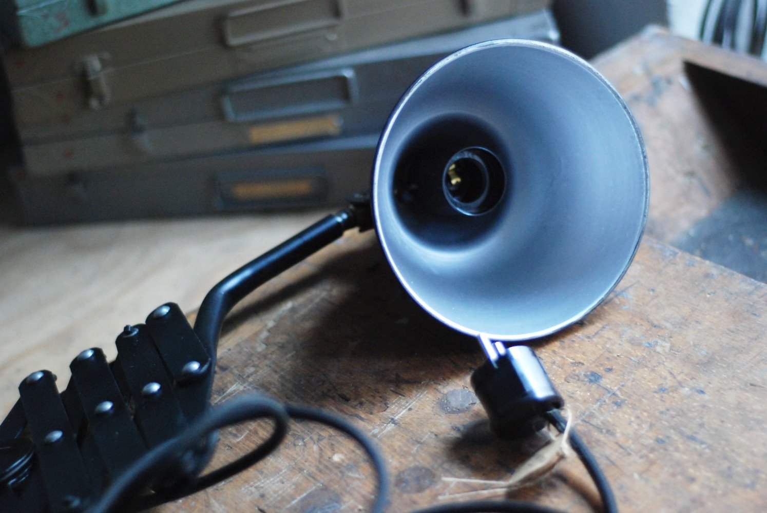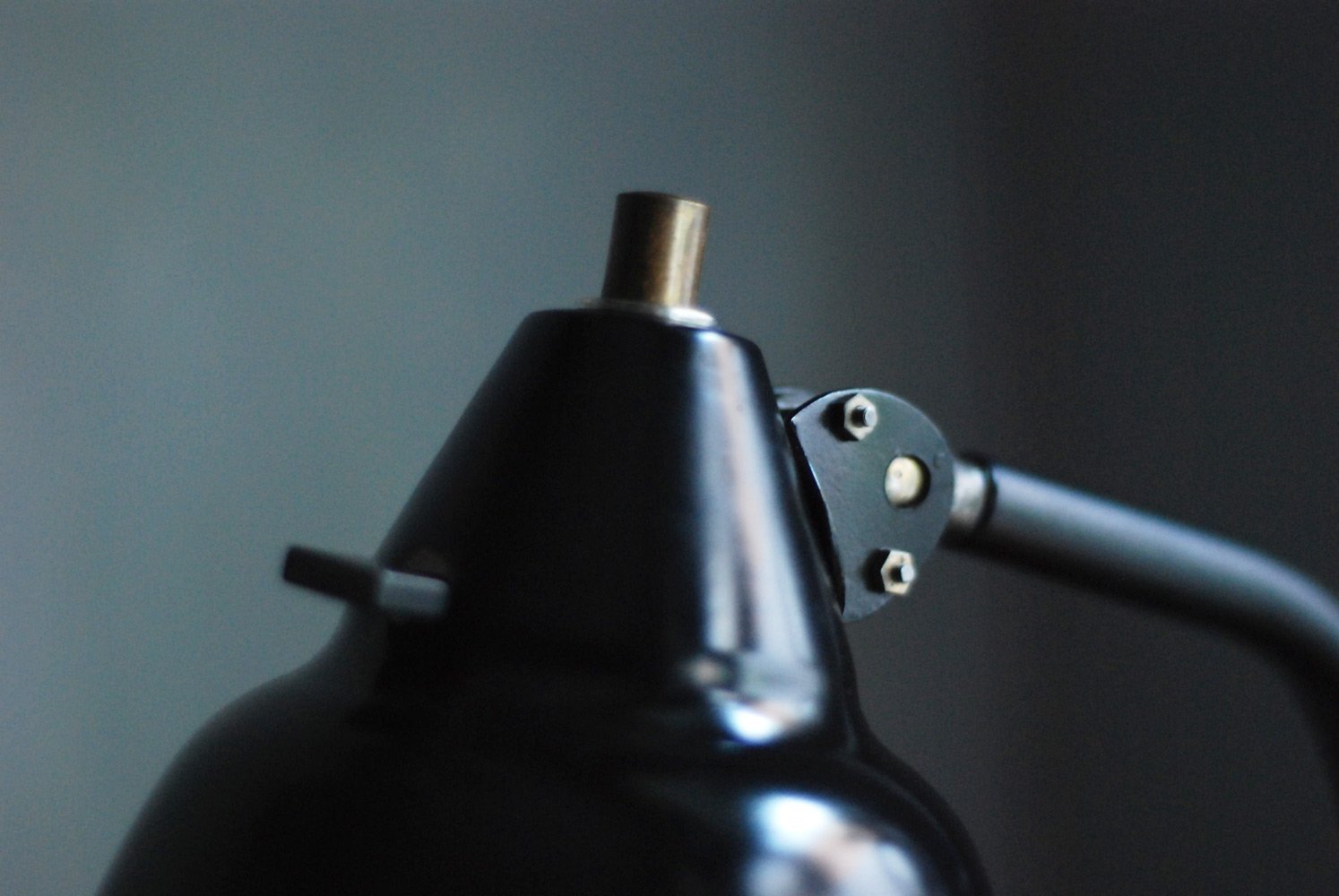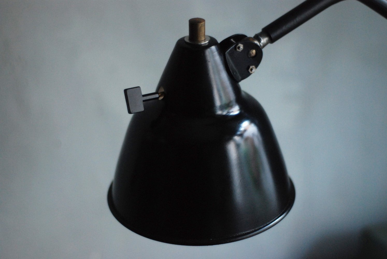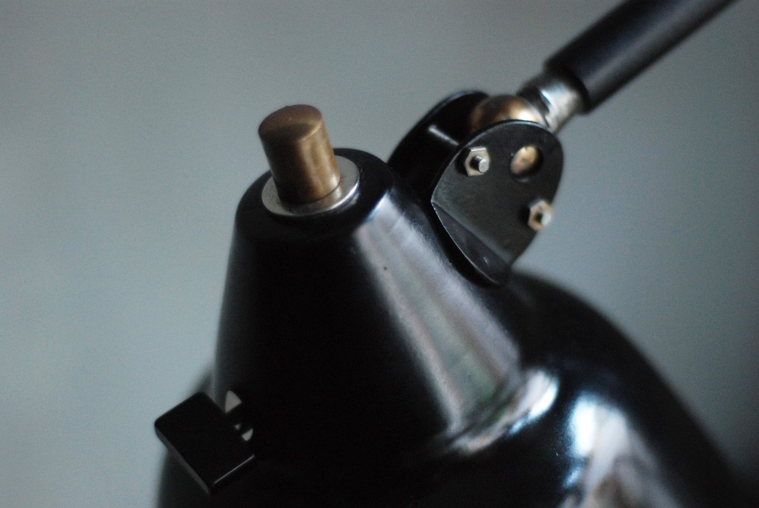 Helo black scissor lamp HELO Leuchten is a trademark of the Kaiser & Co. Leuchten KG company, for which Christian Dell designed an extensive series of lamps from 1933. After the thorough dismantling and cleaning of all elements, the lamp was painted and rebuilt again. The lamp has signs of wear consistent with its age…