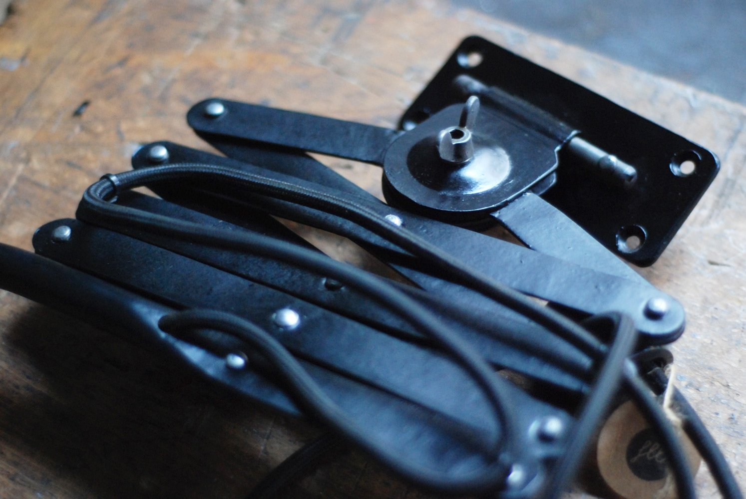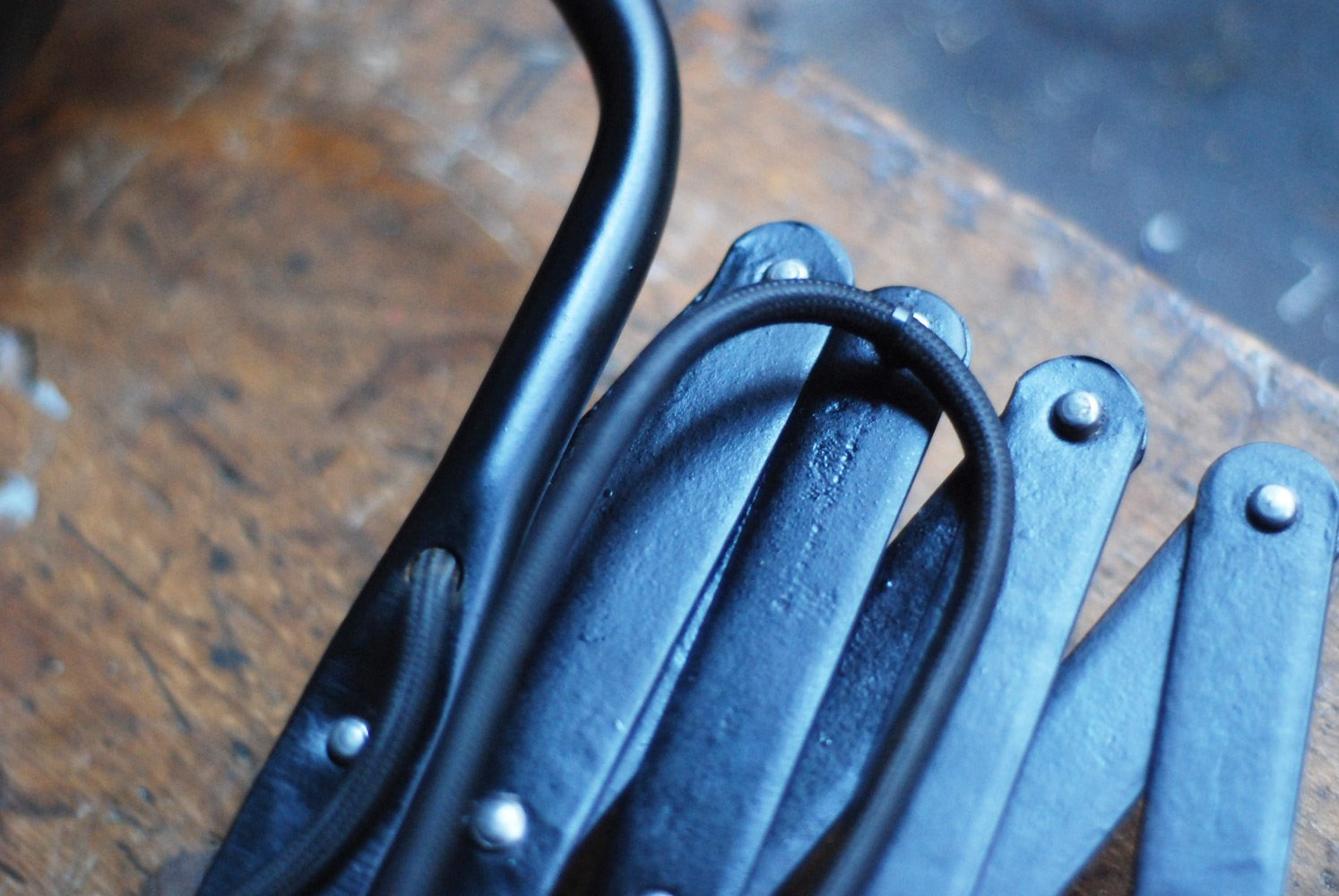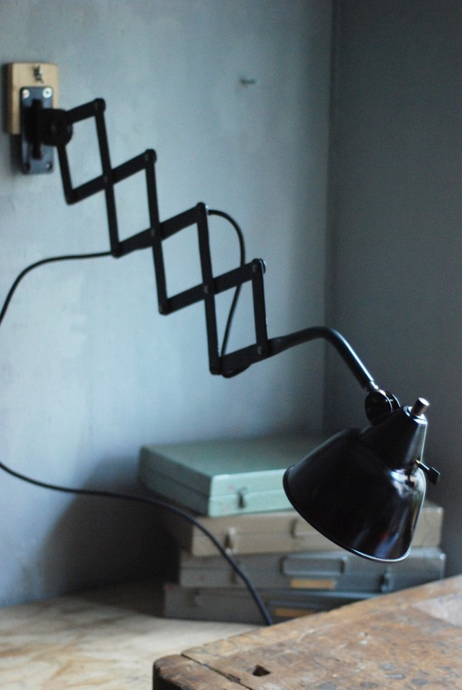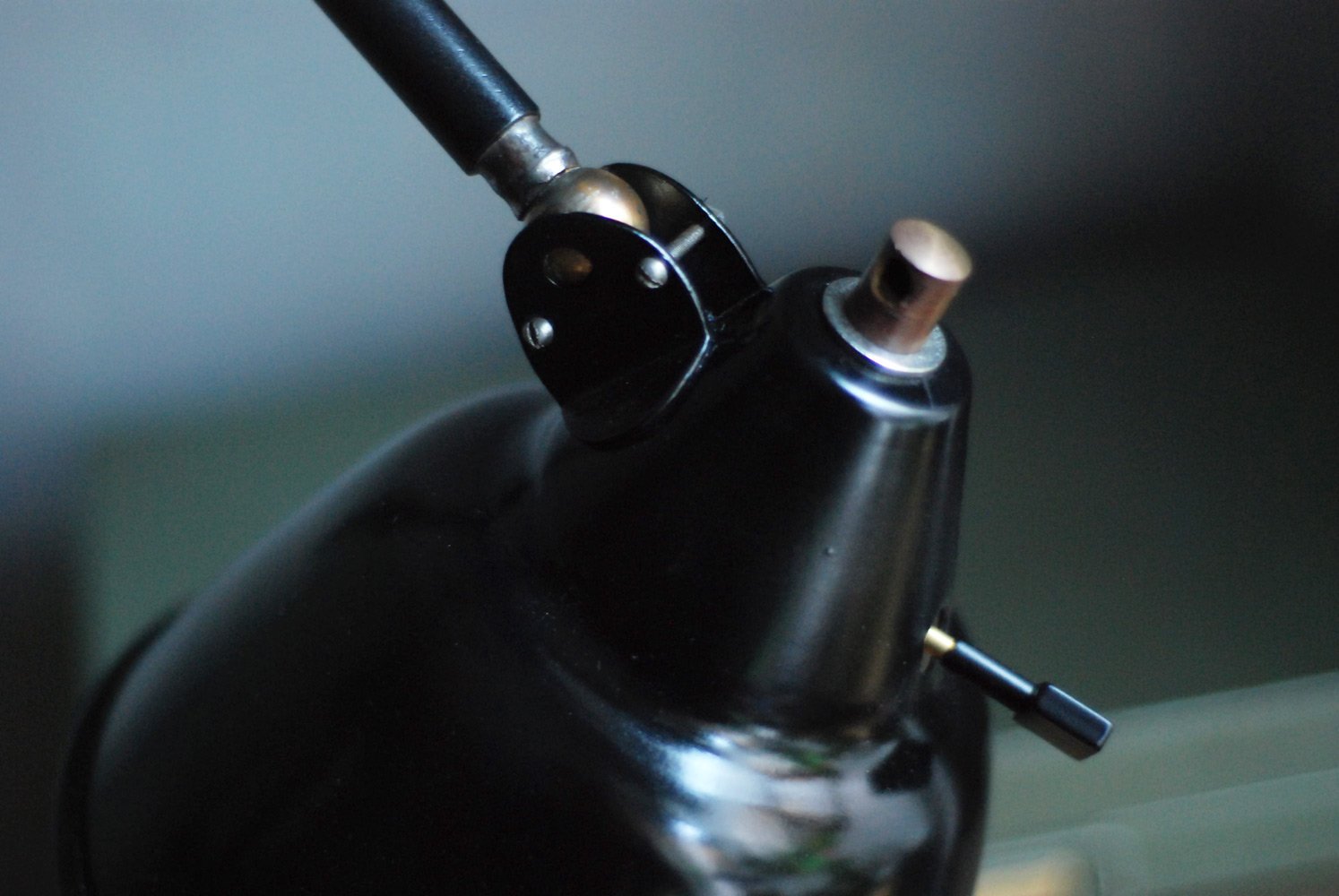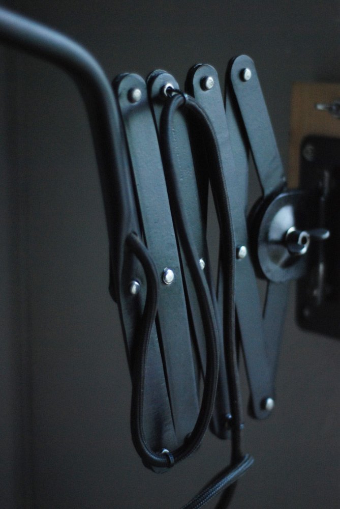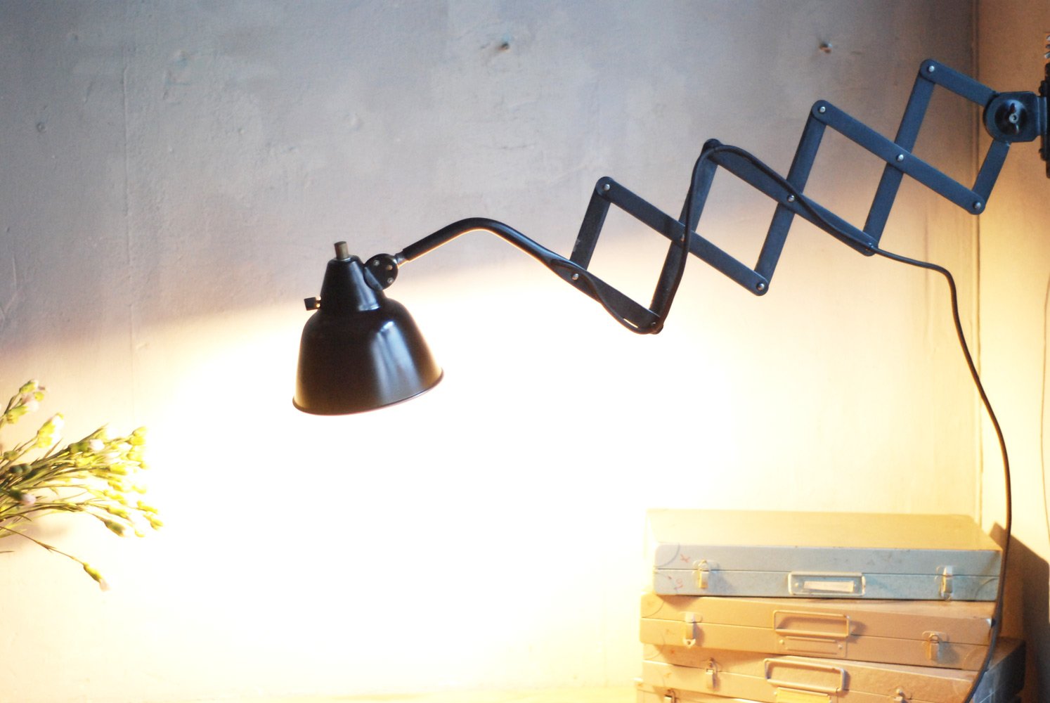 Helo black scissor lamp HELO Leuchten is a trademark of the Kaiser & Co. Leuchten KG company, for which Christian Dell designed an extensive series of lamps from 1933. After the thorough dismantling and cleaning of all elements, the lamp was painted and rebuilt again. The lamp has signs of wear consistent with its age…