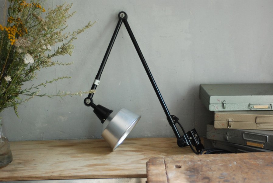 This vintage articulated double joint lamp from the DDR Time was designed by Curt Fischer, who worked on the idea of ‘steerable light’ from approx. 1920 on. Even before the well known designs by Christian Dell or Marianne Brandt, Curt Fischer realized the idea of the so-called ‘steerable light’ with the all-round movable work lamp. The metal workshop at the Weimar Bauhaus was lighted up with Midgard lights, serving as an example to Bauhaus students, and was also later in Ilse and Walter Gropius’ master house living room at the Dessau Bauhaus.