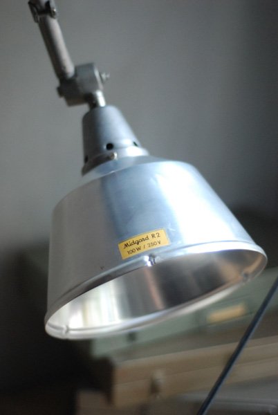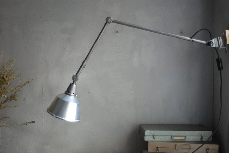 This vintage articulated double jointed lamp from the ddr time was designed by Curt Fischer, who worked on the idea of ‘steerable light’ from approx. 1920 on. Even before the well known designs by Christian Dell or Marianne Brandt, Curt Fischer realized the idea of the so-called ‘steerable light’ with the all-round movable work lamp. The metal workshop at the Weimar Bauhaus was lighted up with Midgard lights, serving as an example to Bauhaus students, and was also later in Ilse and Walter Gropius’ master house living room at the Dessau Bauhaus.