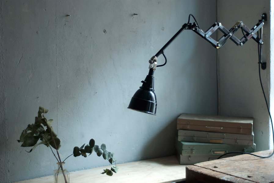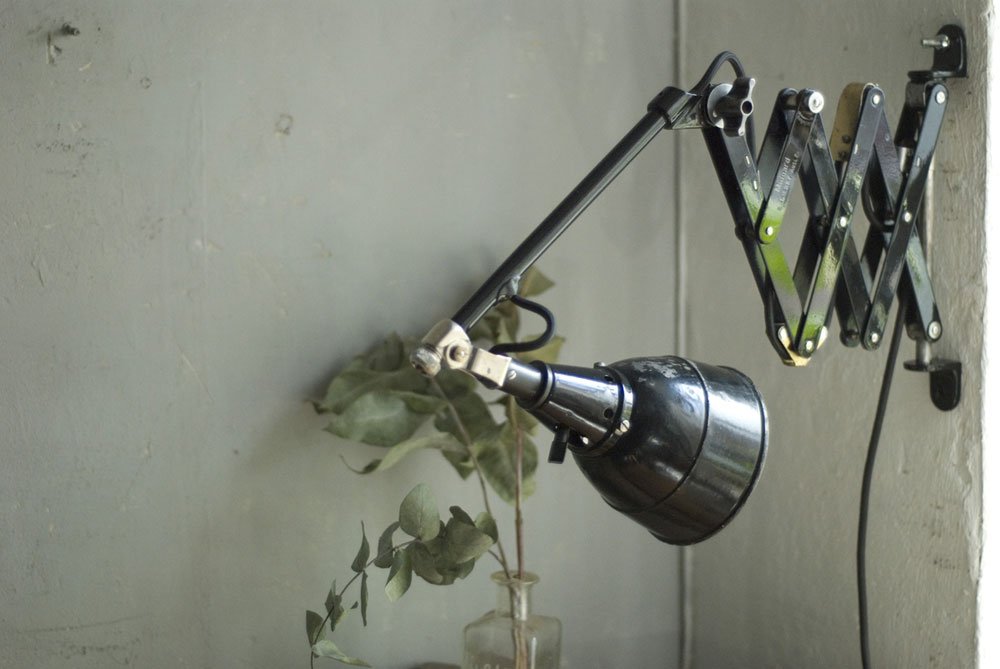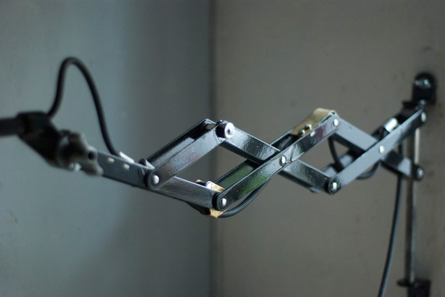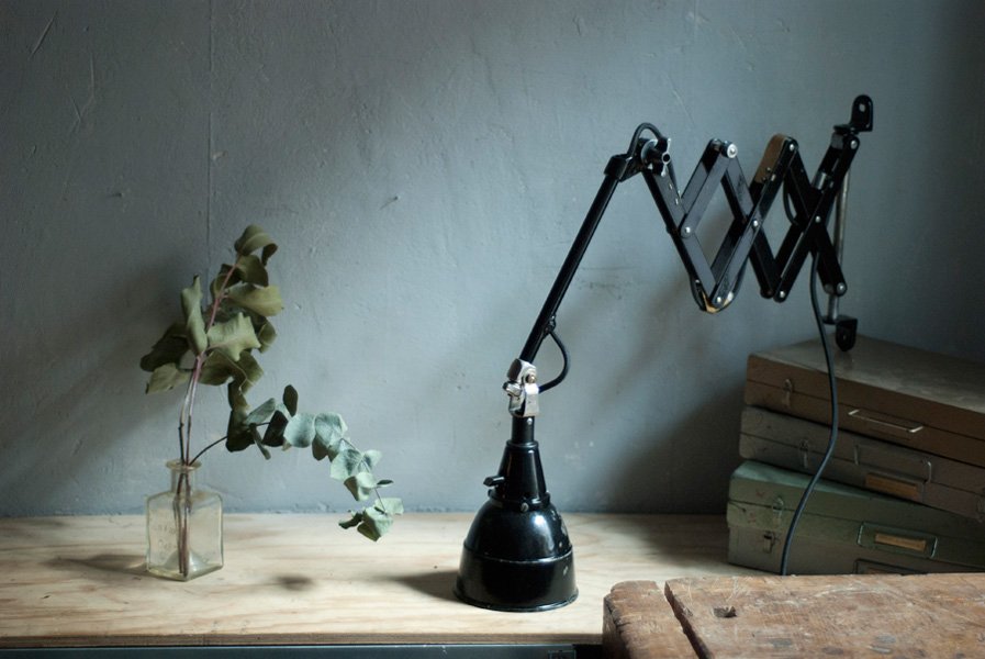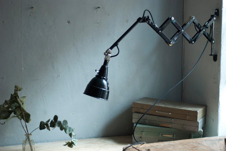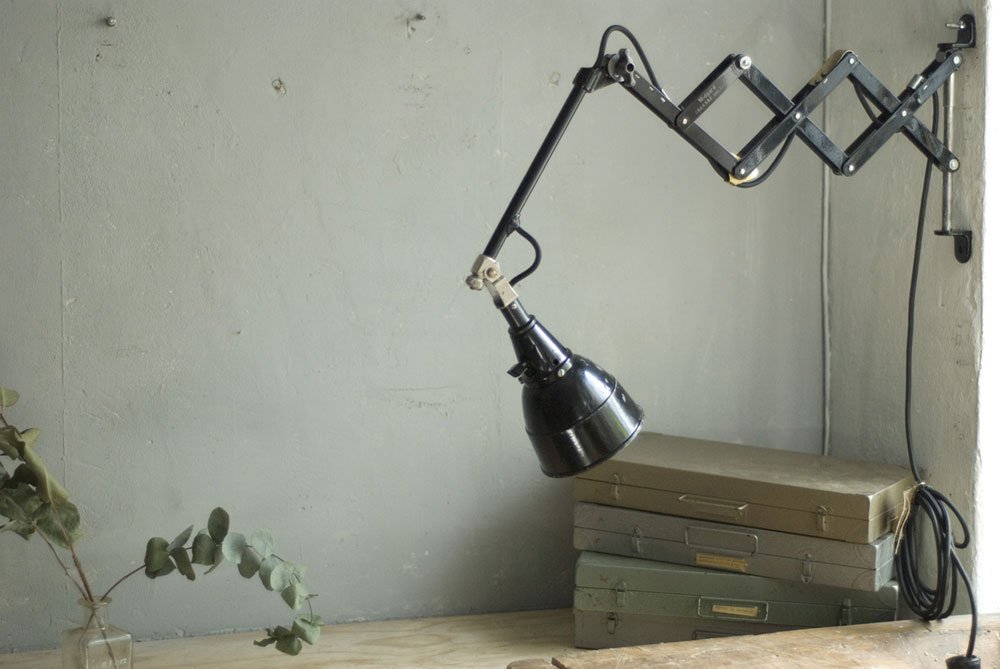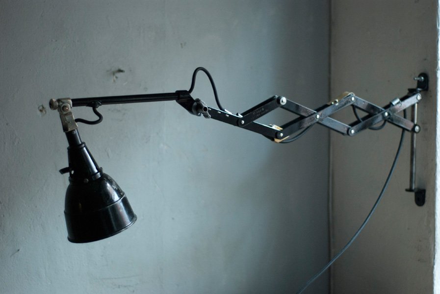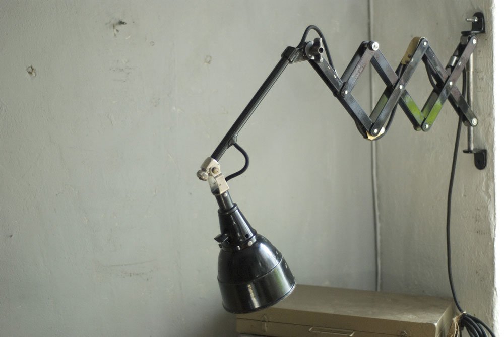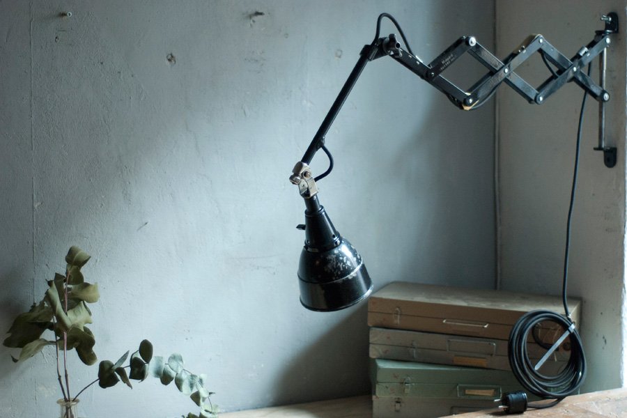 The design of this vintage scissor lamp was developed by Curt Fischer, who worked on the idea of the ‘steerable light’ from approx. 1920 on. Even before the well known designs by Christian Dell or Marianne Brandt, Curt Fischer realized the idea of the so-called ‘steerable light’ with the all-round movable work lamp. The metal workshop at the Weimar Bauhaus was lit with Midgard lights, serving as an example to Bauhaus students, and was used later in Ilse and Walter Gropius’ master house livingroom at the Dessau Bauhaus.