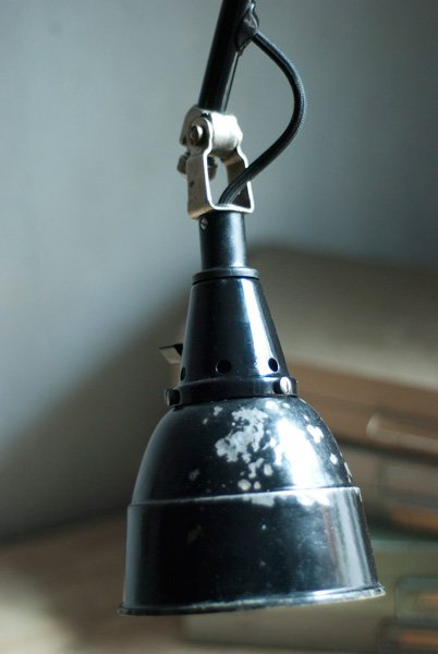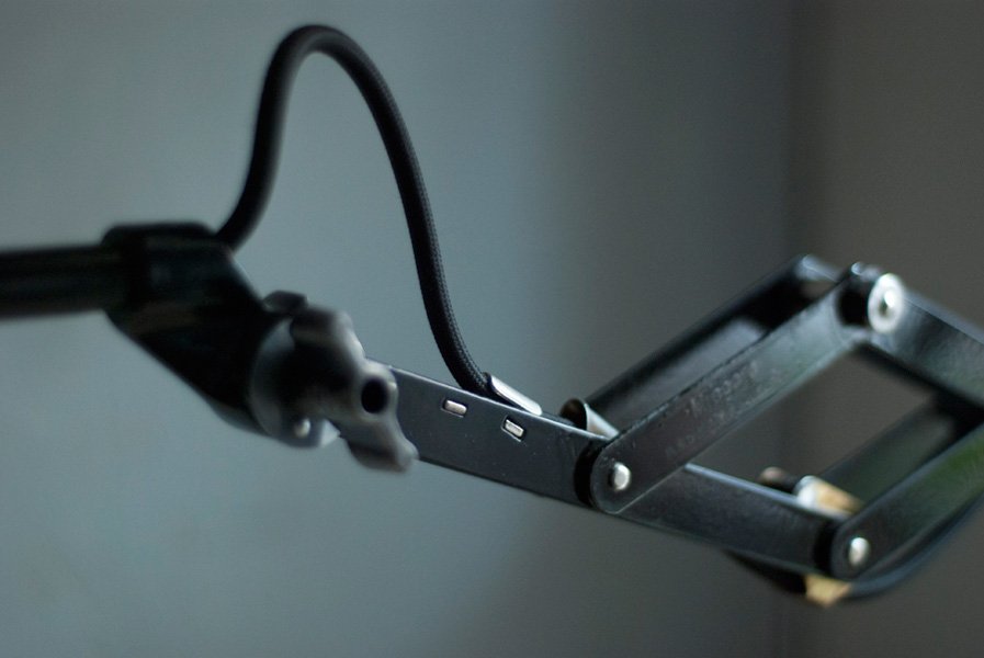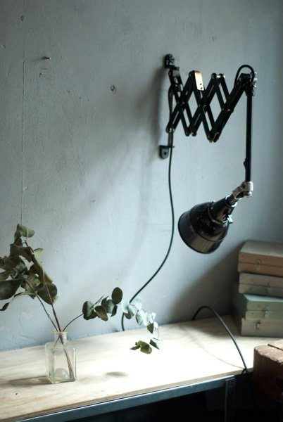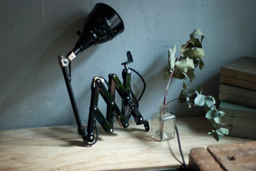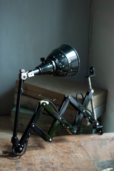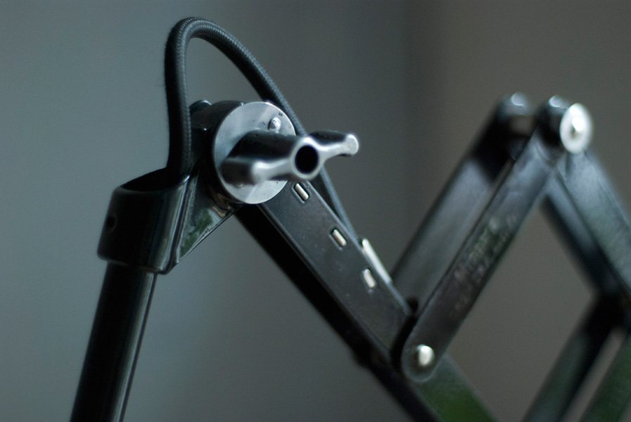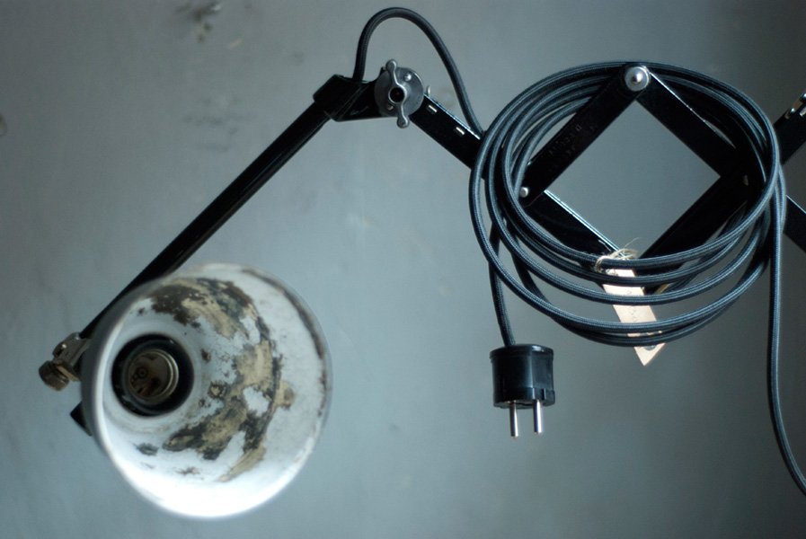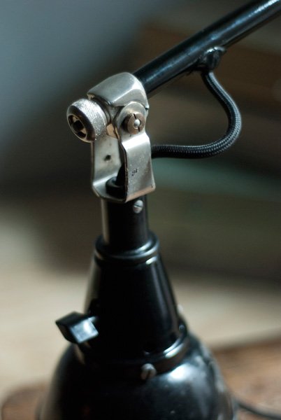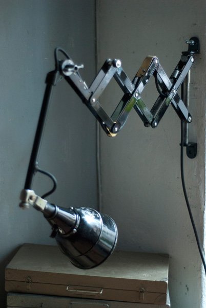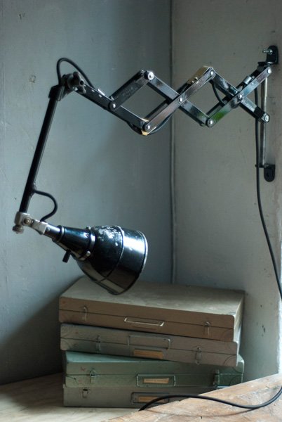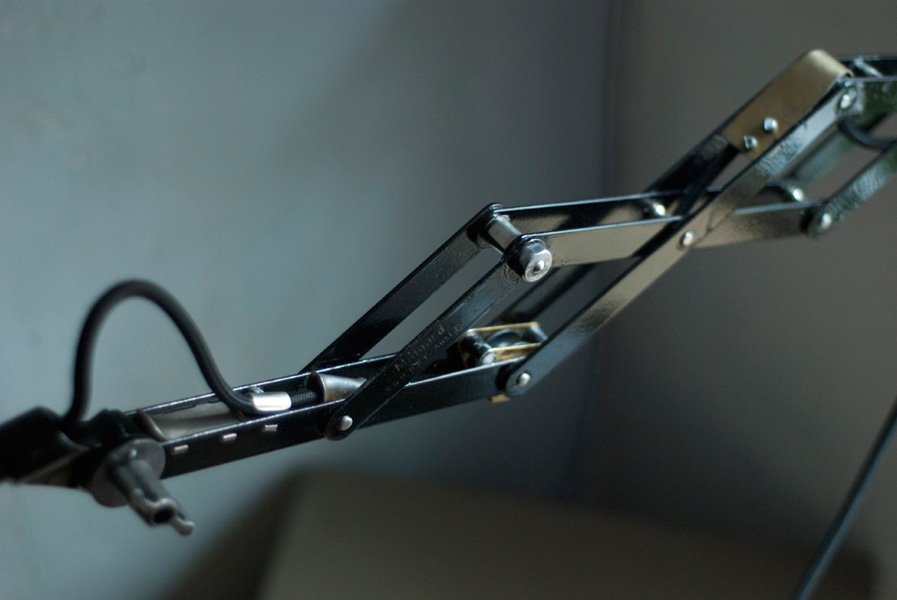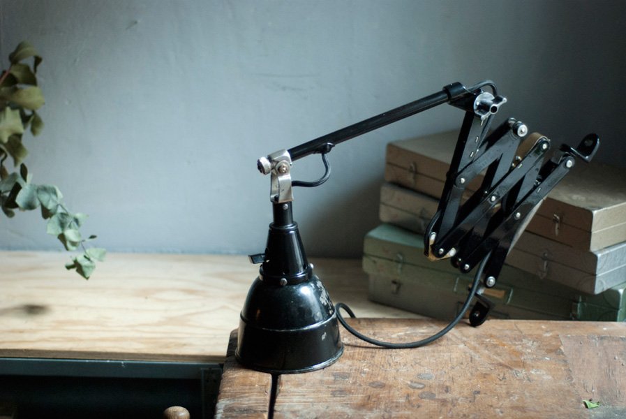 The design of this vintage scissor lamp was developed by Curt Fischer, who worked on the idea of the ‘steerable light’ from approx. 1920 on. Even before the well known designs by Christian Dell or Marianne Brandt, Curt Fischer realized the idea of the so-called ‘steerable light’ with the all-round movable work lamp. The metal workshop at the Weimar Bauhaus was lit with Midgard lights, serving as an example to Bauhaus students, and was used later in Ilse and Walter Gropius’ master house livingroom at the Dessau Bauhaus.
