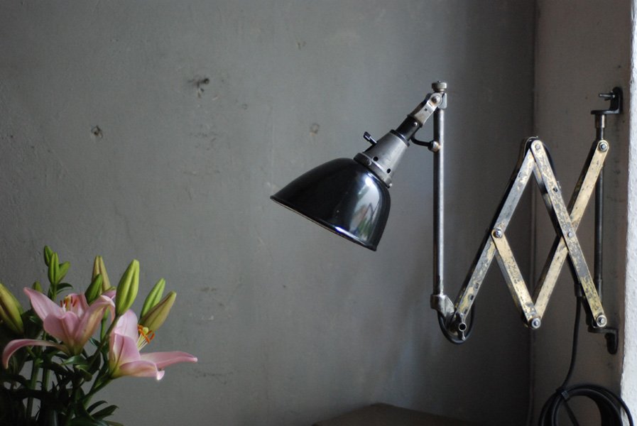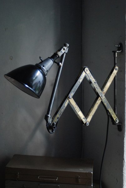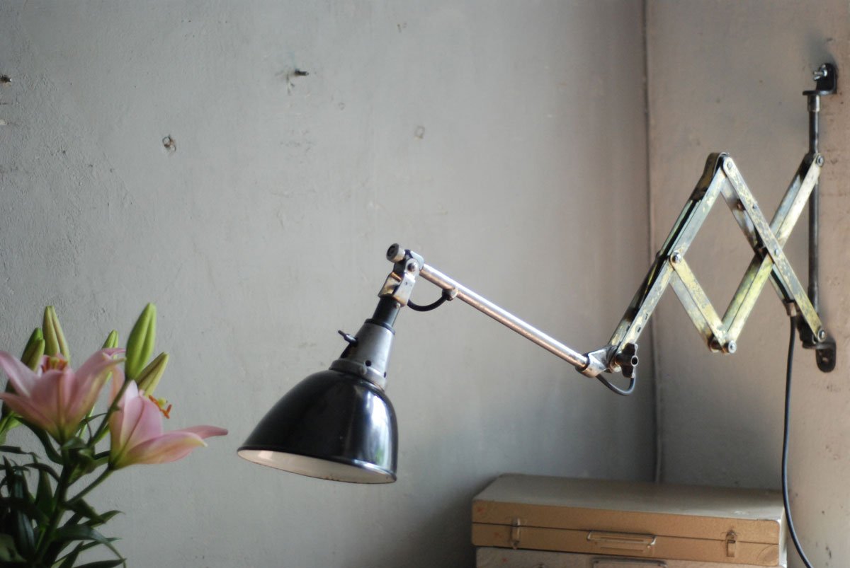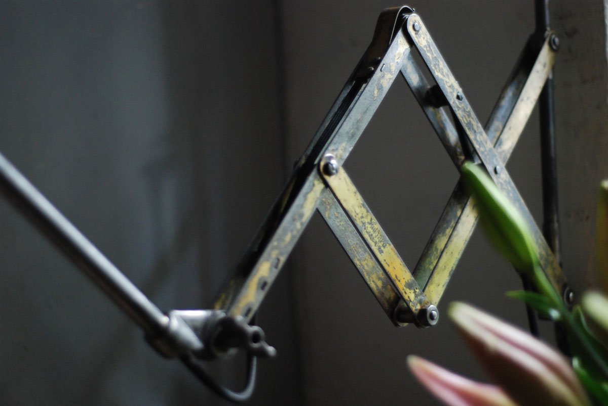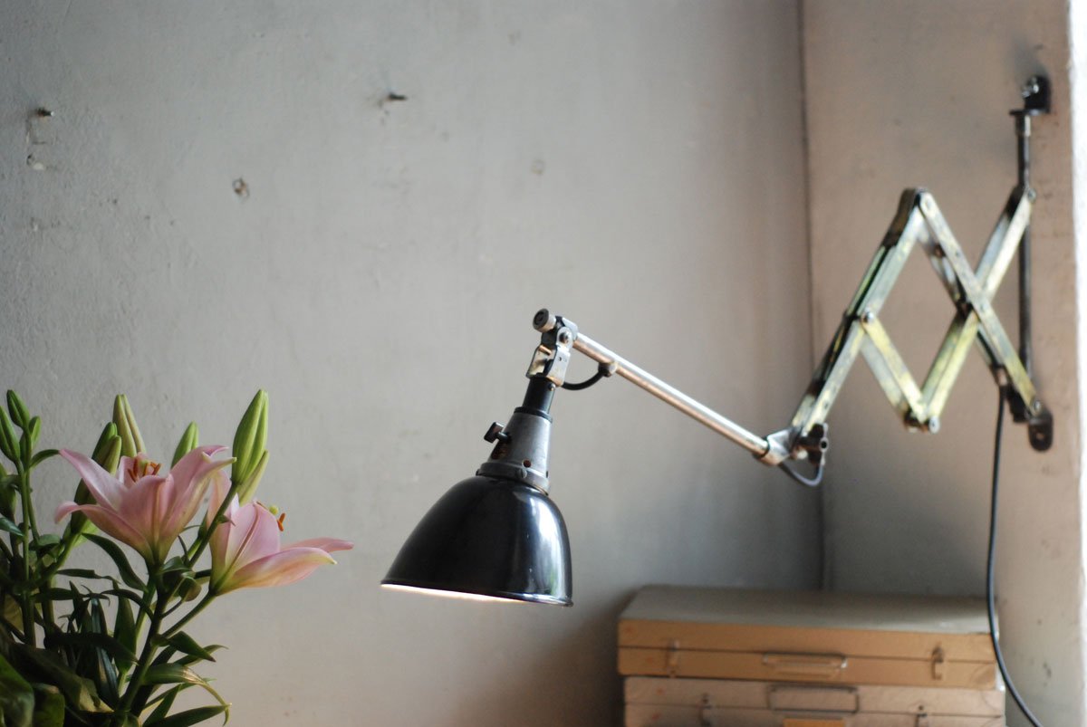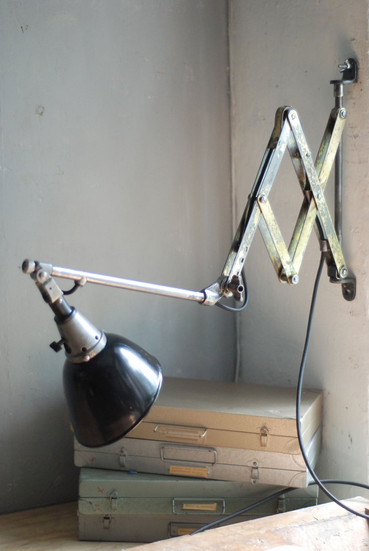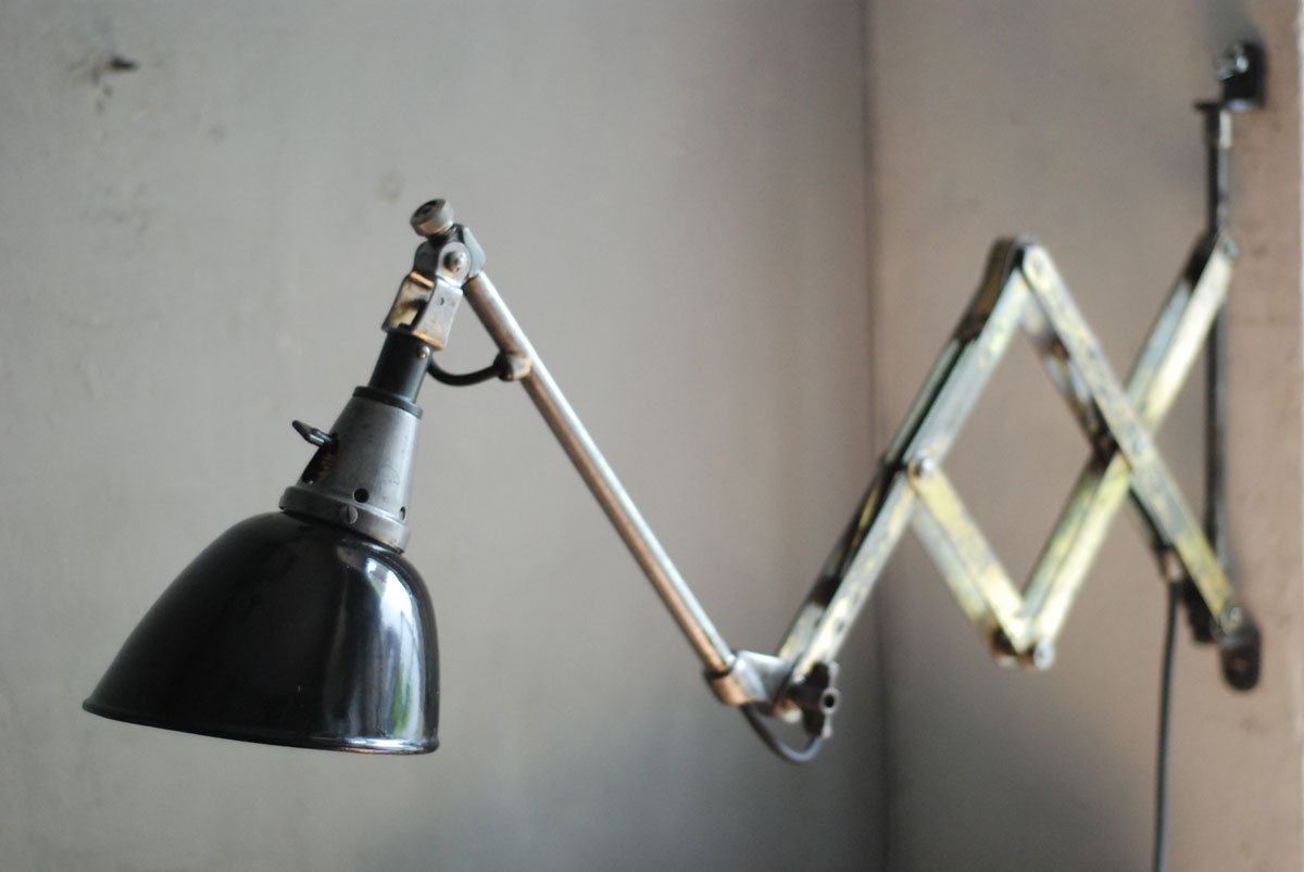 The design of this vintage scissor lamp was developed by Curt Fischer, who worked on the idea of the ‘steerable light’ from approx. 1920 on. Even before the well known designs by Christian Dell or Marianne Brandt, Curt Fischer realized the idea of the so-called ‘steerable light’ with the all-round movable work lamp. The metal workshop at the Weimar Bauhaus was lit with Midgard lights, serving as an example to Bauhaus students, and was used later in Ilse and Walter Gropius’ master house livingroom at the Dessau Bauhaus.