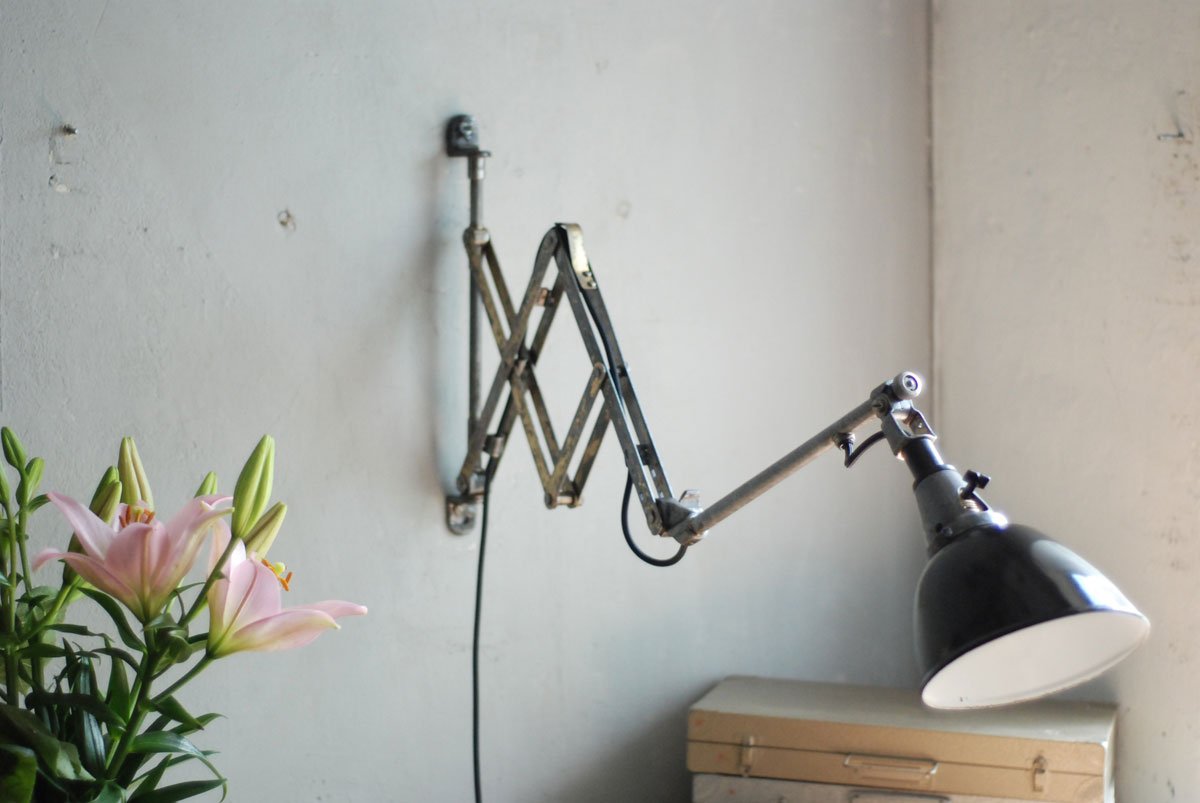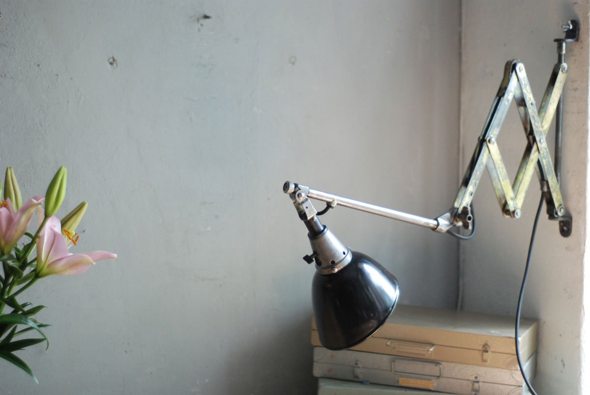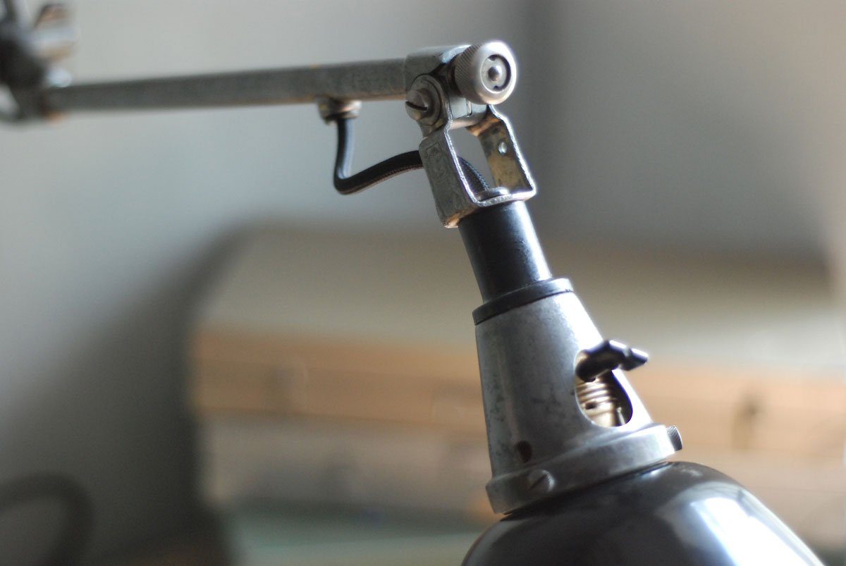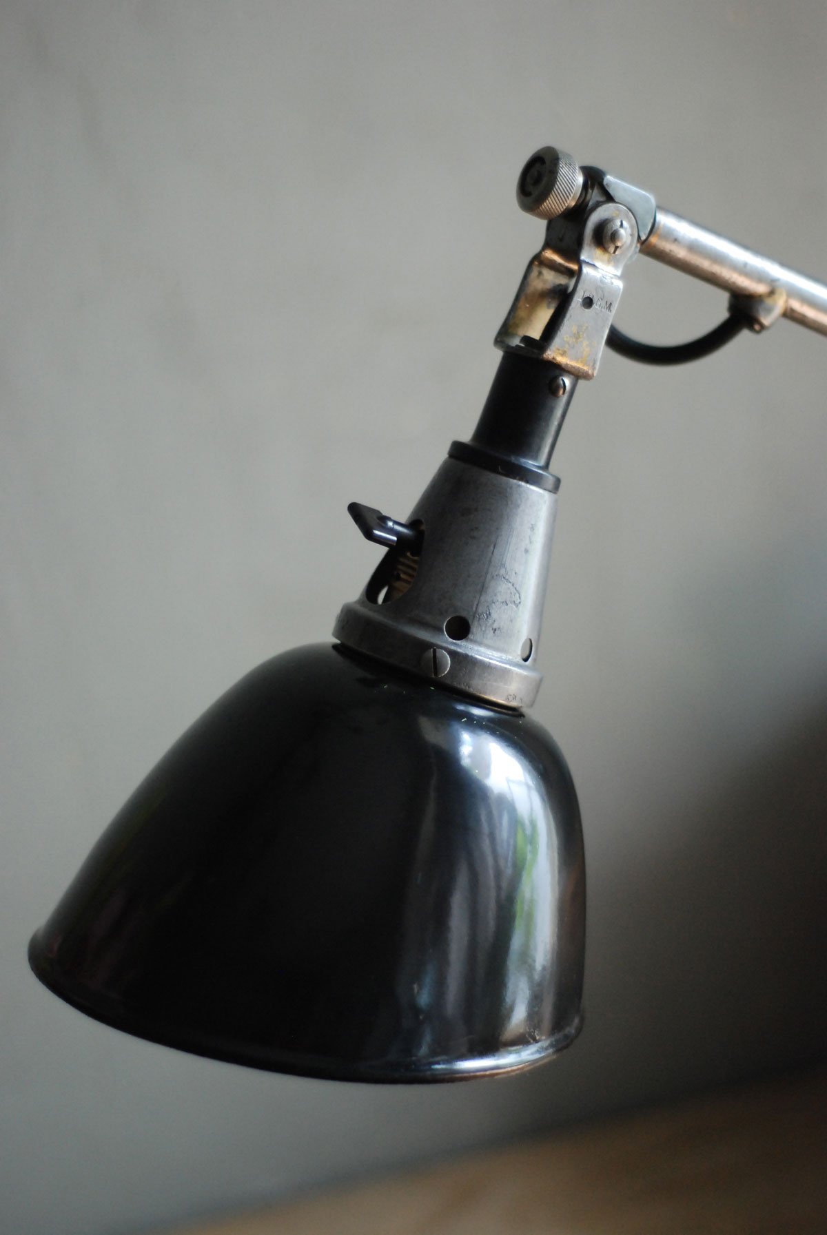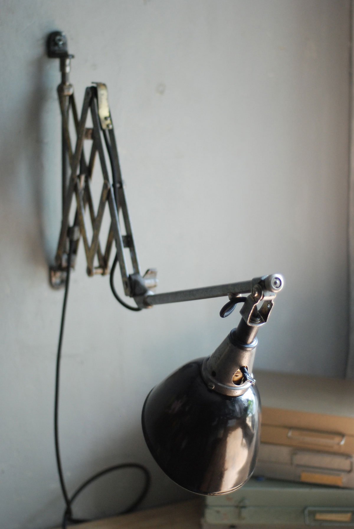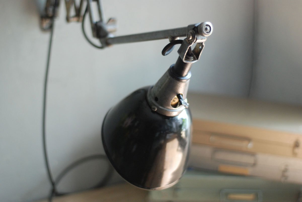 The design of this vintage scissor lamp was developed by Curt Fischer, who worked on the idea of the ‘steerable light’ from approx. 1920 on. Even before the well known designs by Christian Dell or Marianne Brandt, Curt Fischer realized the idea of the so-called ‘steerable light’ with the all-round movable work lamp. The metal workshop at the Weimar Bauhaus was lit with Midgard lights, serving as an example to Bauhaus students, and was used later in Ilse and Walter Gropius’ master house livingroom at the Dessau Bauhaus.