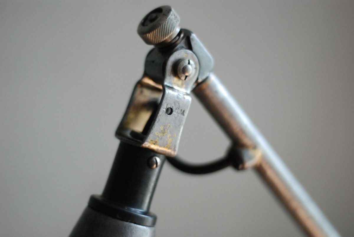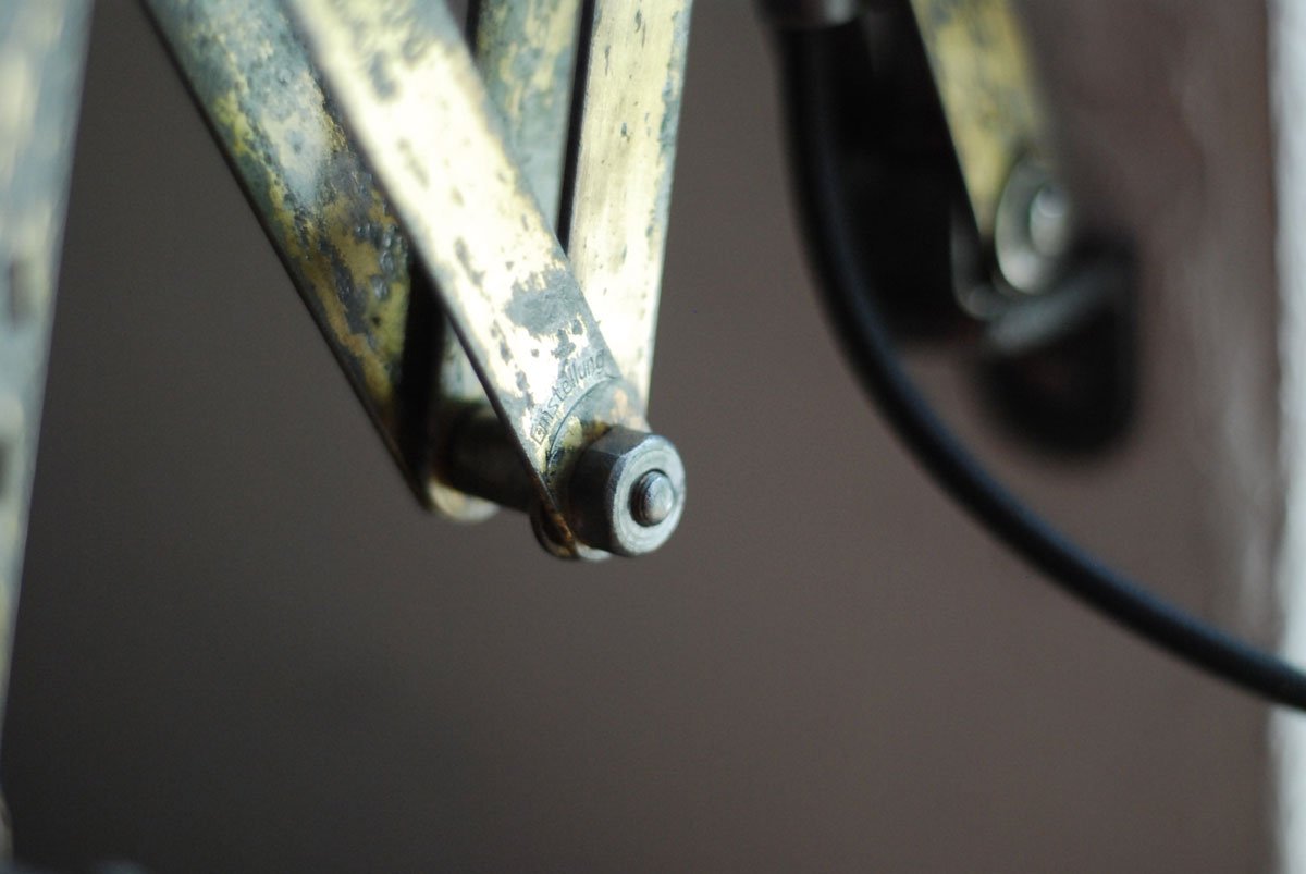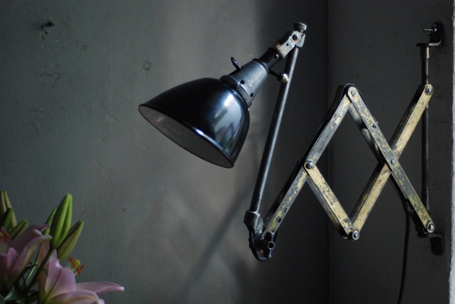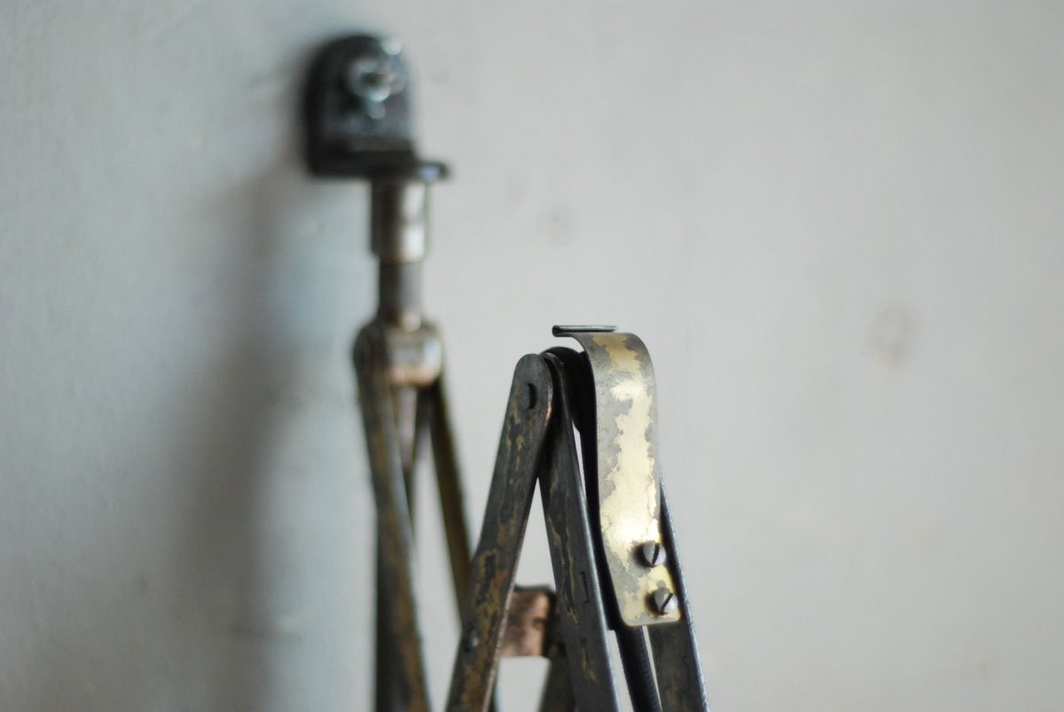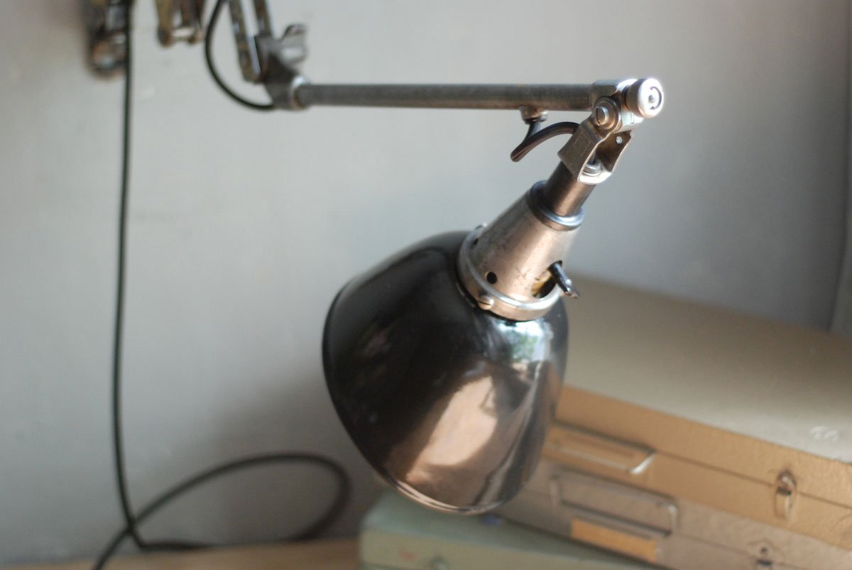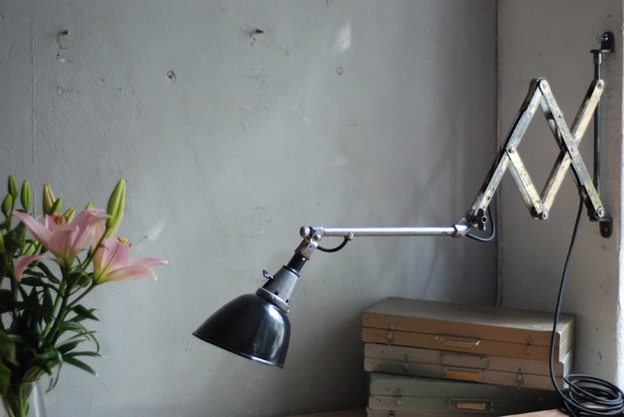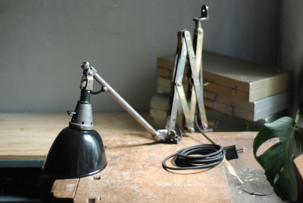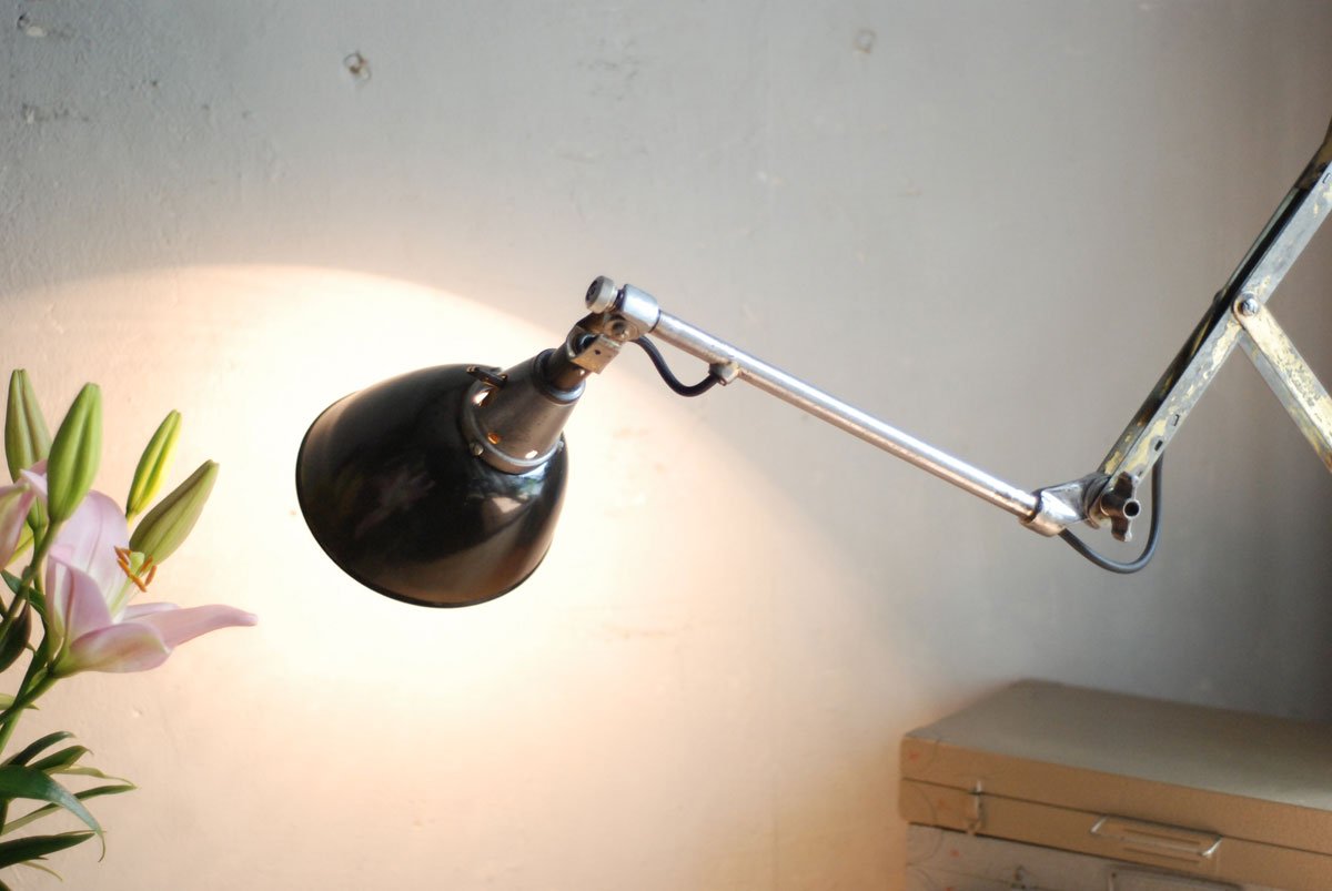 The design of this vintage scissor lamp was developed by Curt Fischer, who worked on the idea of the ‘steerable light’ from approx. 1920 on. Even before the well known designs by Christian Dell or Marianne Brandt, Curt Fischer realized the idea of the so-called ‘steerable light’ with the all-round movable work lamp. The metal workshop at the Weimar Bauhaus was lit with Midgard lights, serving as an example to Bauhaus students, and was used later in Ilse and Walter Gropius’ master house livingroom at the Dessau Bauhaus.