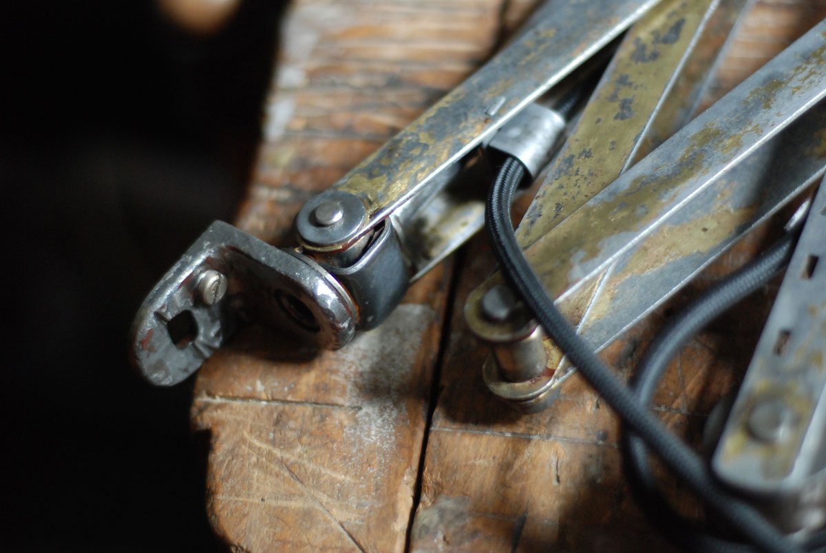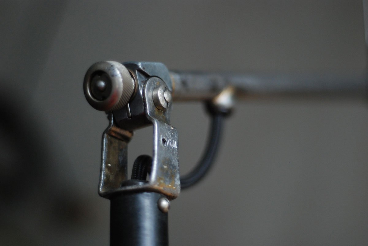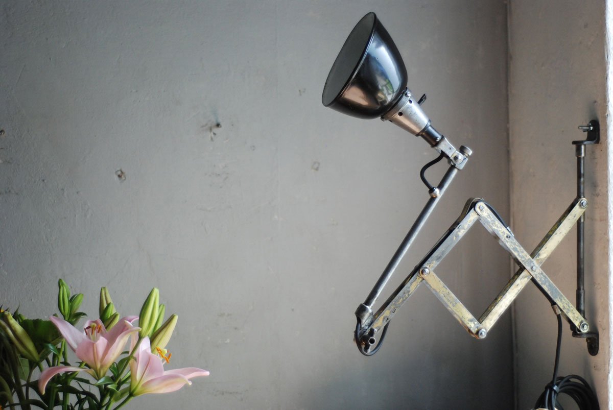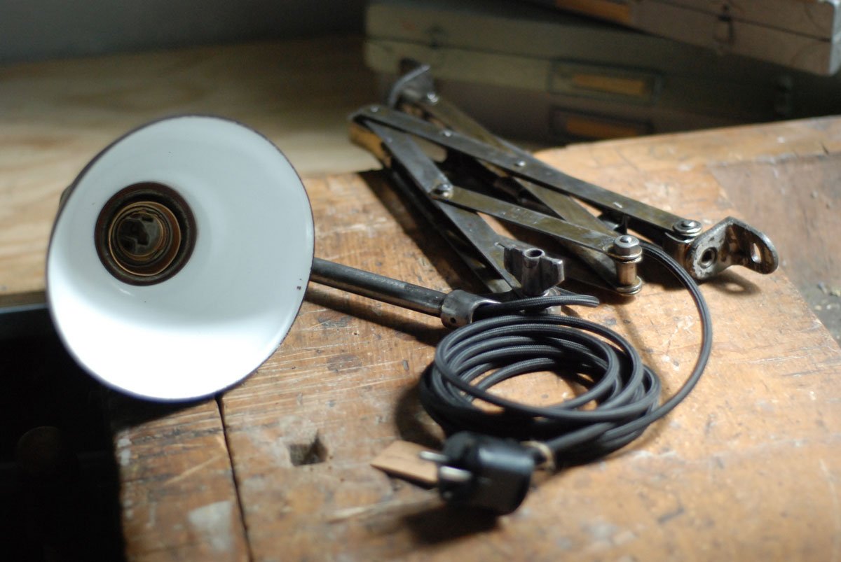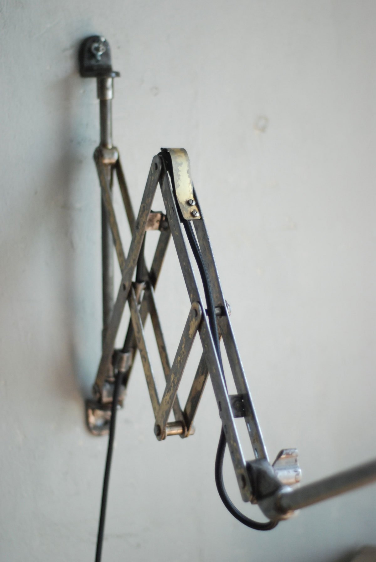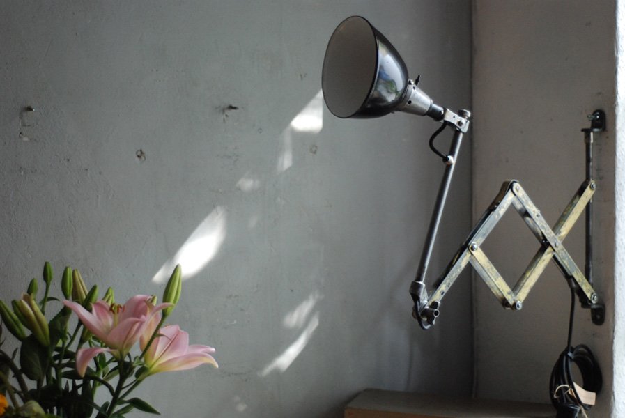 The design of this vintage scissor lamp was developed by Curt Fischer, who worked on the idea of the ‘steerable light’ from approx. 1920 on. Even before the well known designs by Christian Dell or Marianne Brandt, Curt Fischer realized the idea of the so-called ‘steerable light’ with the all-round movable work lamp. The metal workshop at the Weimar Bauhaus was lit with Midgard lights, serving as an example to Bauhaus students, and was used later in Ilse and Walter Gropius’ master house livingroom at the Dessau Bauhaus.