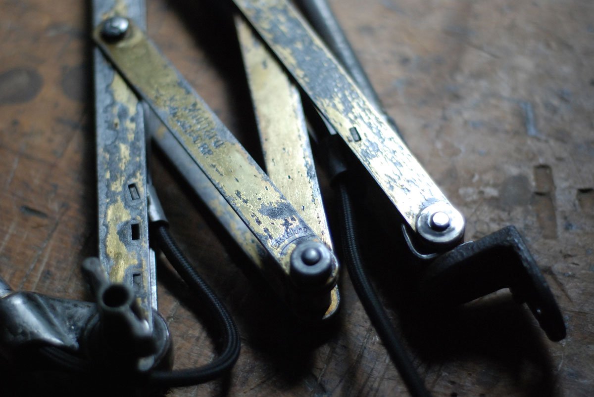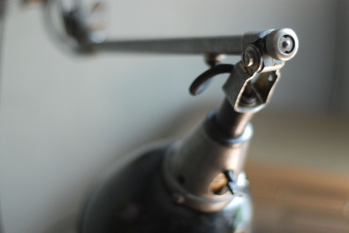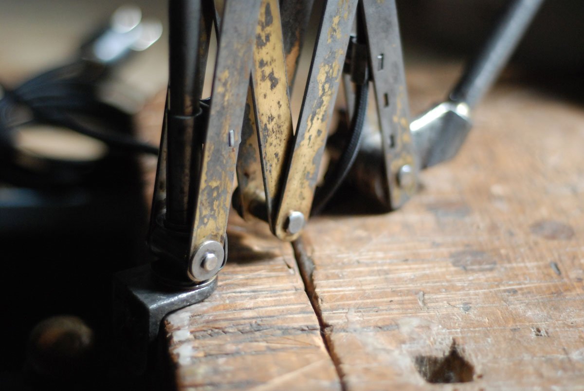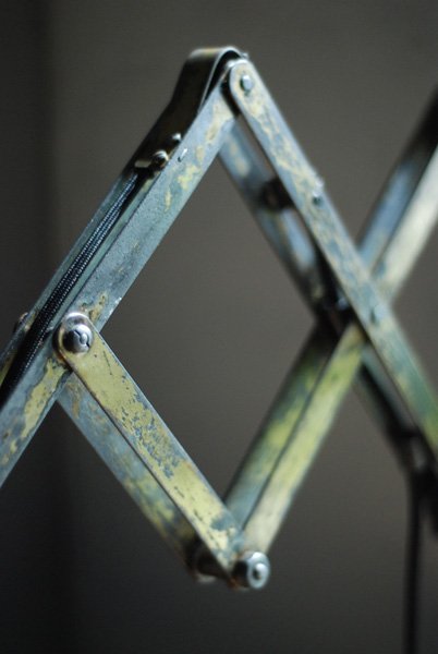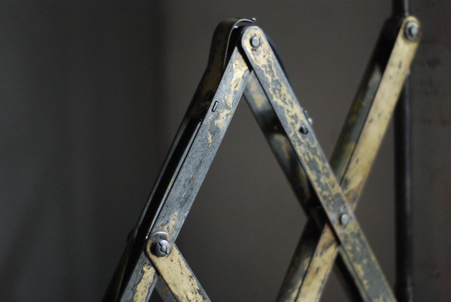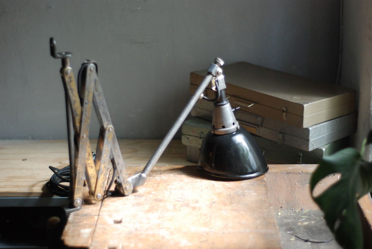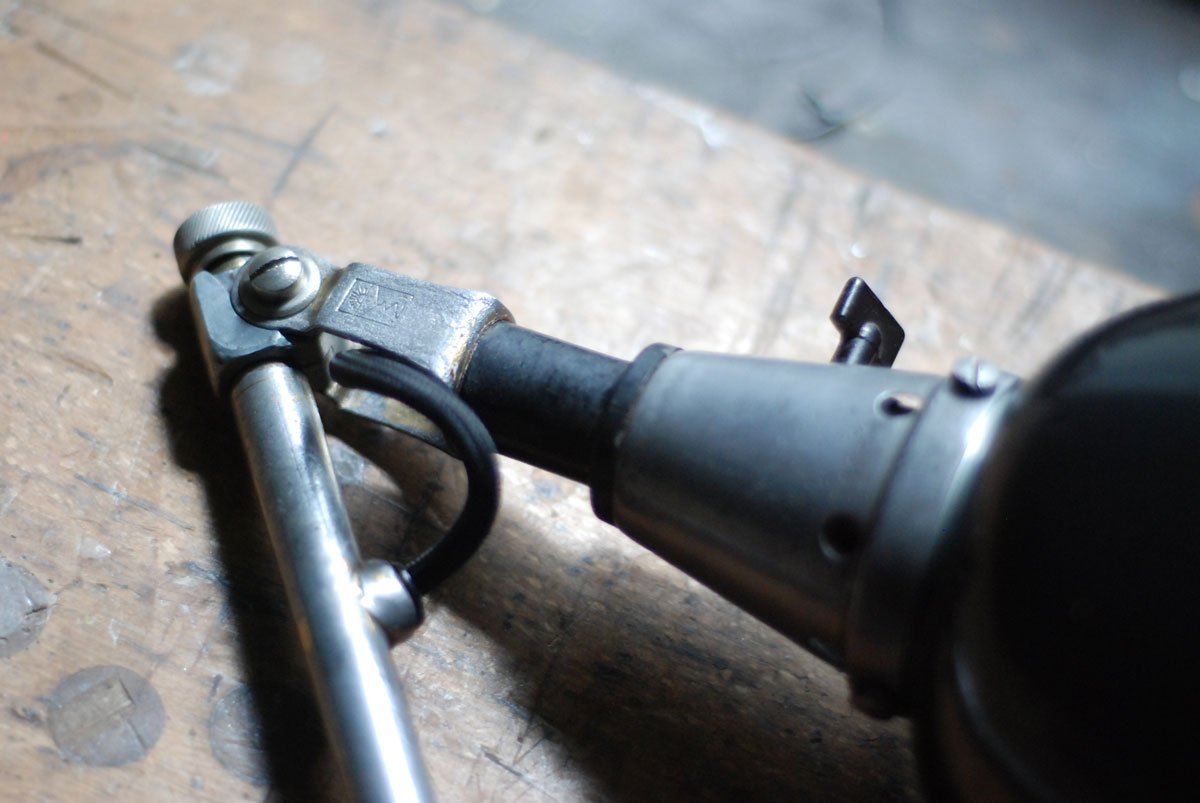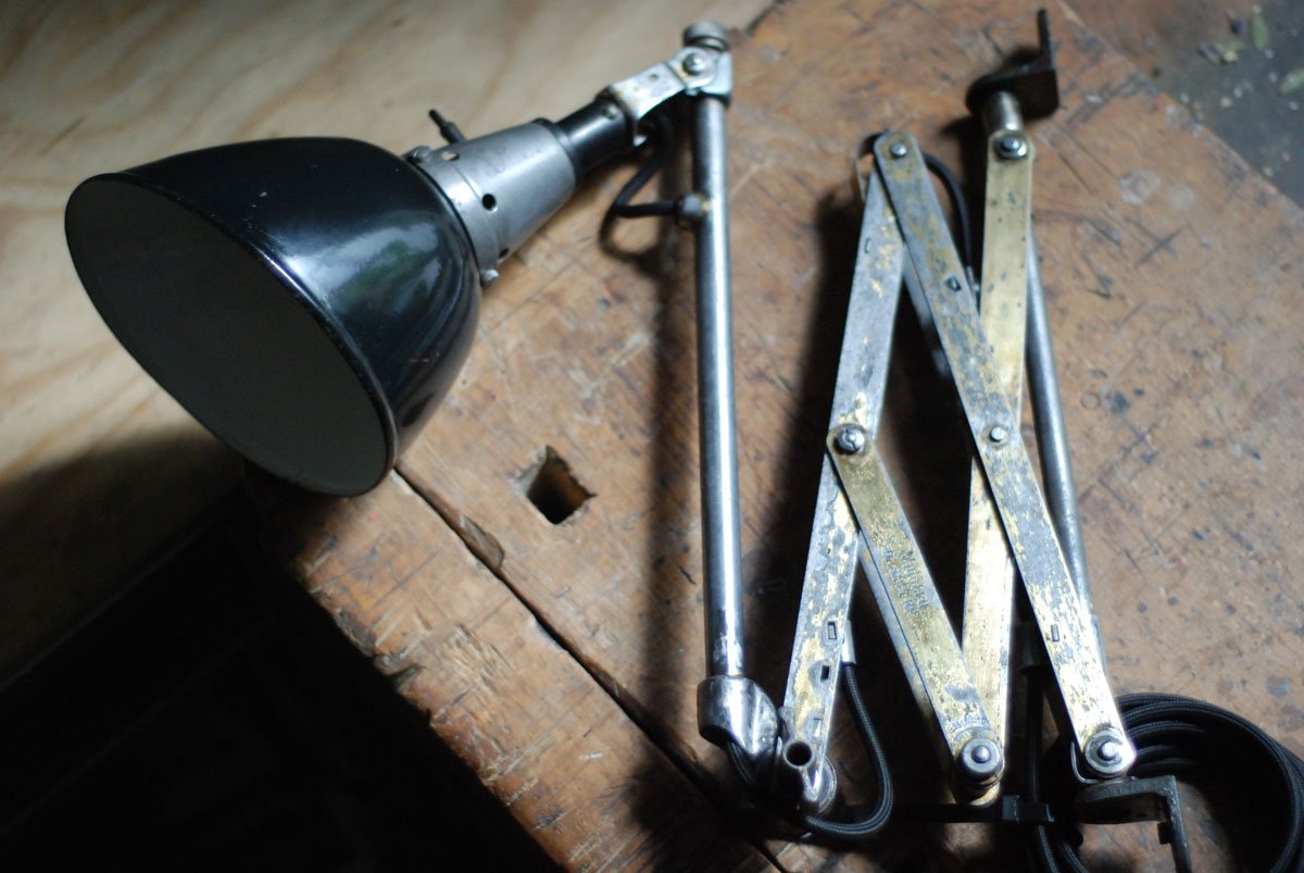 The design of this vintage scissor lamp was developed by Curt Fischer, who worked on the idea of the ‘steerable light’ from approx. 1920 on. Even before the well known designs by Christian Dell or Marianne Brandt, Curt Fischer realized the idea of the so-called ‘steerable light’ with the all-round movable work lamp. The metal workshop at the Weimar Bauhaus was lit with Midgard lights, serving as an example to Bauhaus students, and was used later in Ilse and Walter Gropius’ master house livingroom at the Dessau Bauhaus.