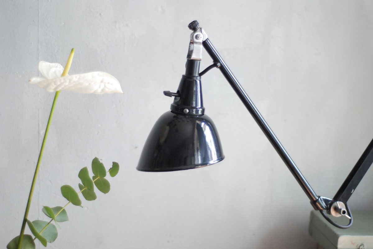 The design of this vintage scissor lamp was developed by Curt Fischer, who worked on the idea of the ‘steerable light’ from approx. 1920 on. Even before the well known designs by Christian Dell or Marianne Brandt, Curt Fischer realized the idea of the so-called ‘steerable light’ with the all-round movable work lamp. The metal workshop at the Weimar Bauhaus was lit with Midgard lights, serving as an example to Bauhaus students, and was used later in Ilse and Walter Gropius’ master house livingroom at the Dessau Bauhaus.