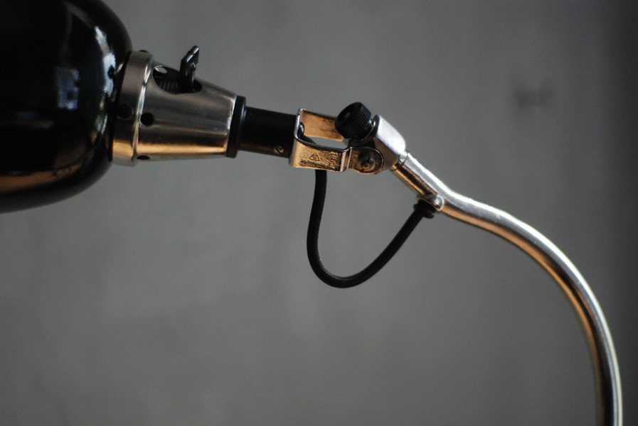The design of this rare beautiful vintage clamp lamp was developed by Curt Fischer, who worked on the idea of the ‘steerable light’ from approx. 1920 on. Even before the well known designs by Christian Dell or Marianne Brandt, Curt Fischer realized the idea of the so-called ‘steerable light’ with the all-round movable work lamp. The metal workshop at the Weimar Bauhaus was lit with Midgard lights, serving as an example to Bauhaus students, and was used later in Ilse and Walter Gropius’ master house livingroom at the Dessau Bauhaus.