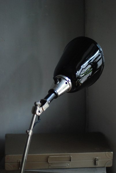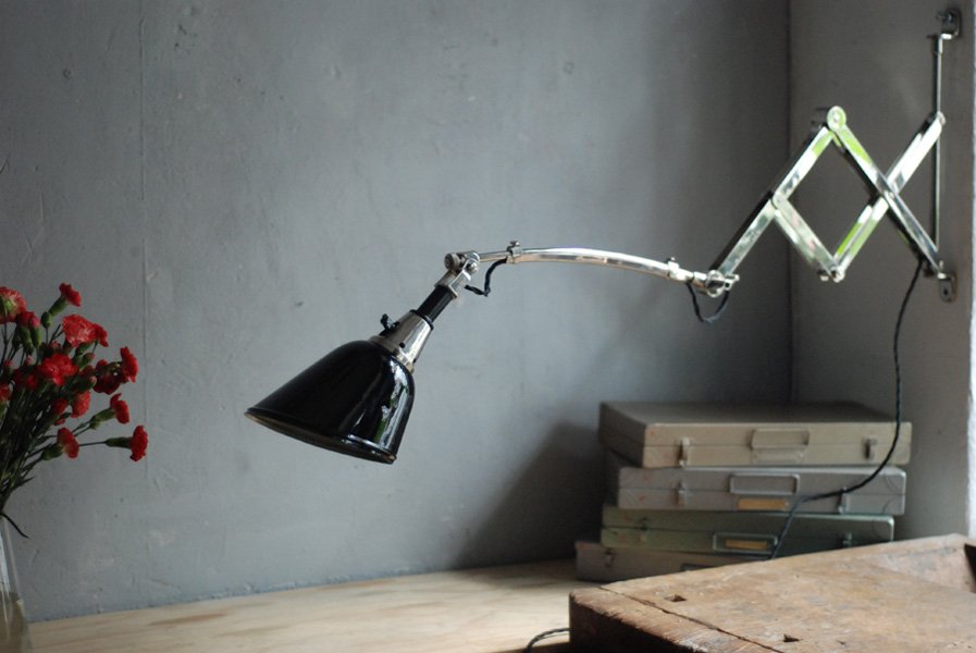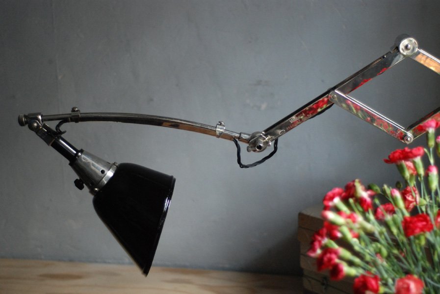 The design of this vintage scissor lamp manufactured around 1933 was developed by Curt Fischer, who worked on the idea of the ‘steerable light’ from approx. 1920 on. Even before the well known designs by Christian Dell or Marianne Brandt, Curt Fischer realized the idea of the so-called ‘steerable light’ with the all-round movable work lamp. The metal workshop at the Weimar Bauhaus was lit with Midgard lights, serving as an example to Bauhaus students, and was used later in Ilse and Walter Gropius’ master house livingroom at the Dessau Bauhaus.