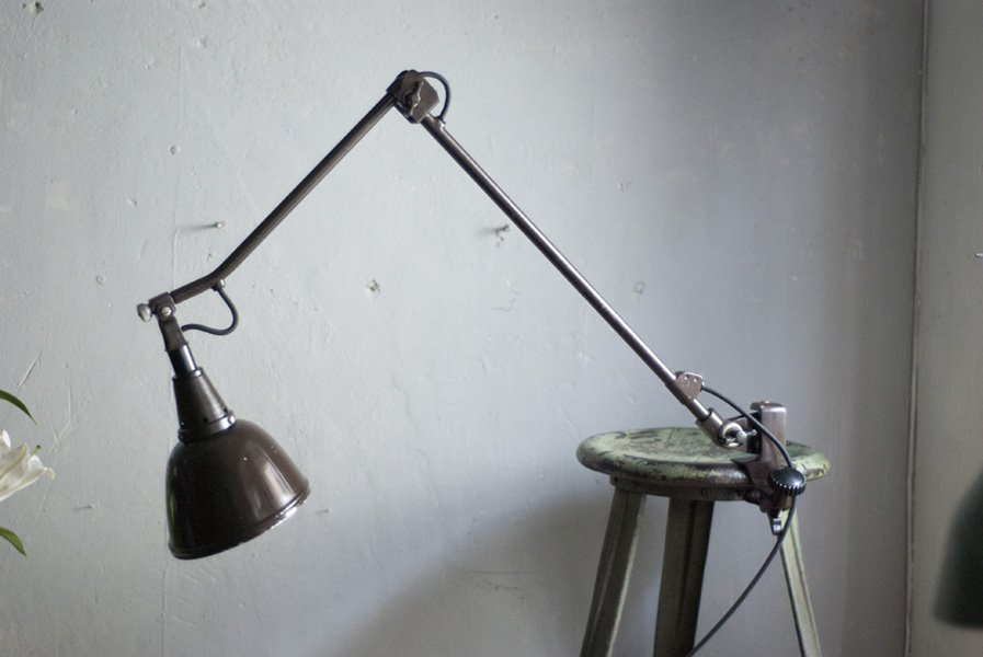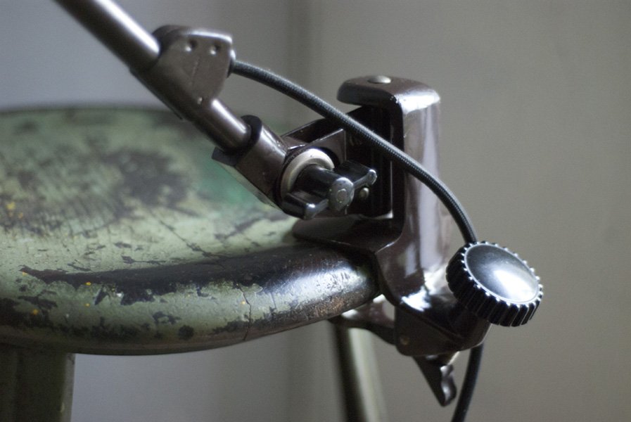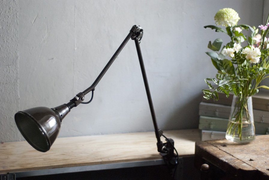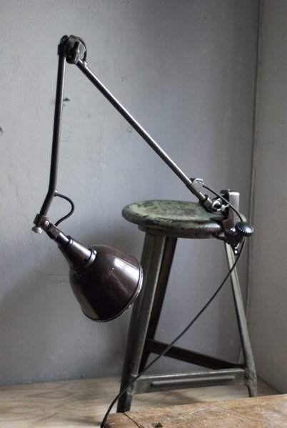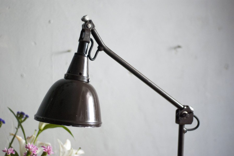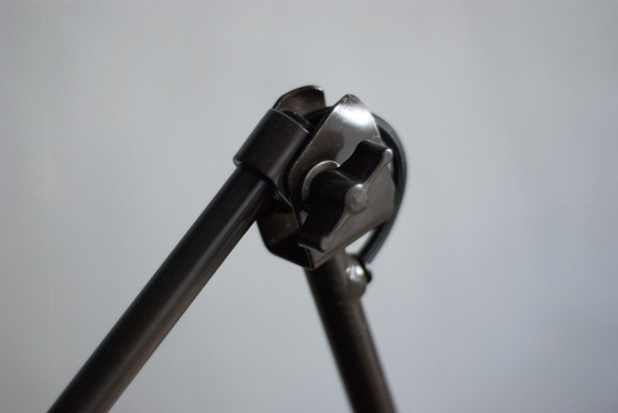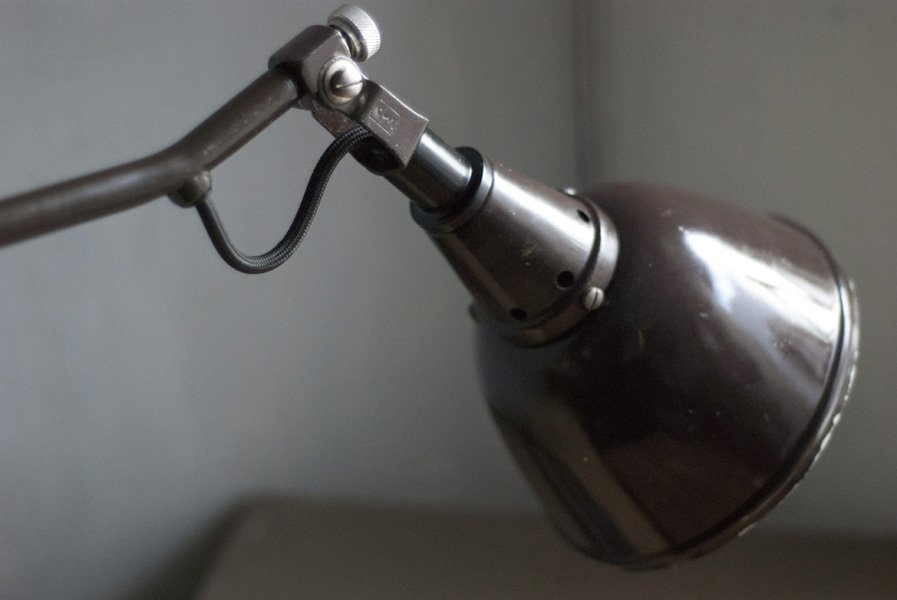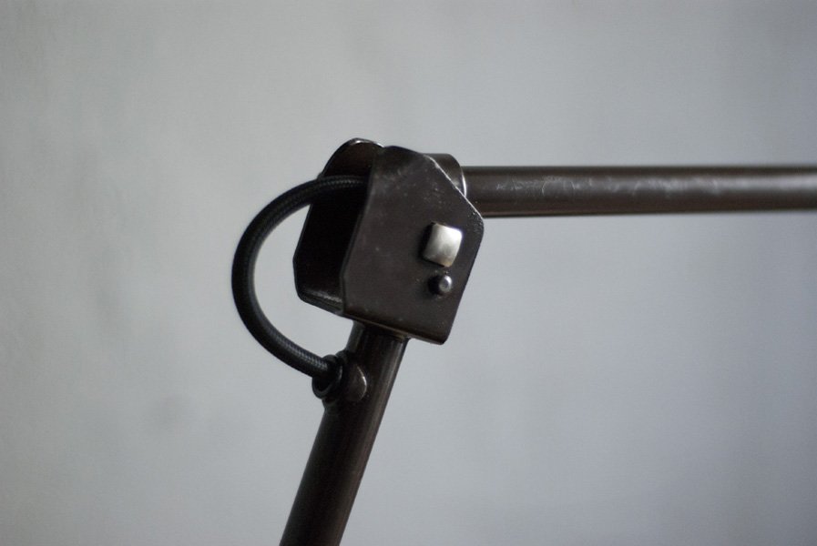 The design of this rare double-jointed lamp comes from the Curt Fischer, CA 1920 has worked on the idea of “steerable light”. Before the well-known designs by Christian Dell, or Marianne Brandt, Curt Fischer with the all-round mobile workstation lighting implemented the idea of so-called ‘steerable light’. The metal workshop at the Bauhaus in Weimar was lit with Midgard lights and the Bauhaus students and served as inspiration, and is verifiable in the living room furniture by Ilse and Walter Gropius in their house at the Dessau Bauhaus.