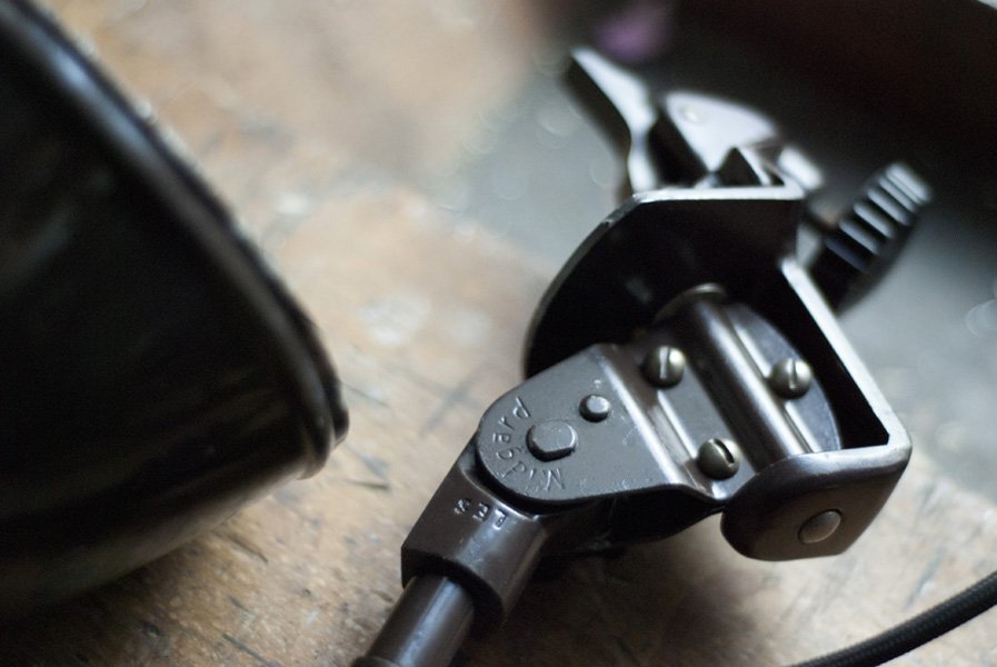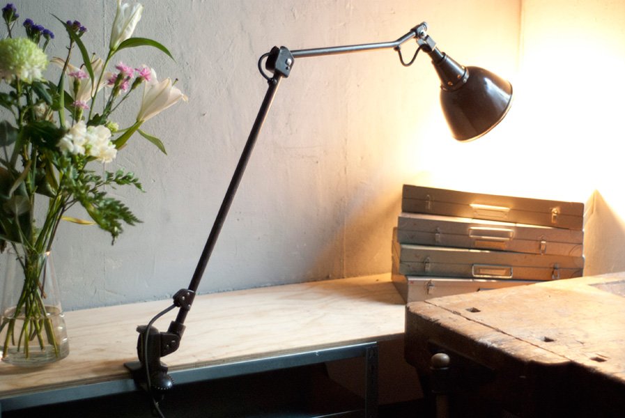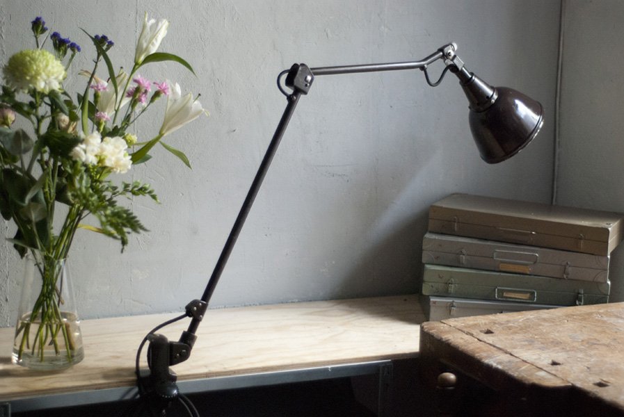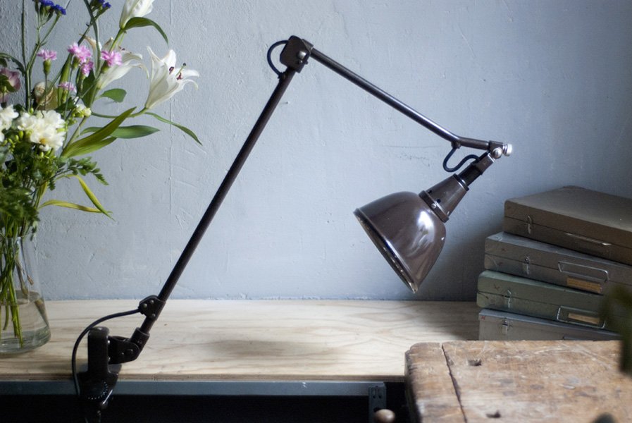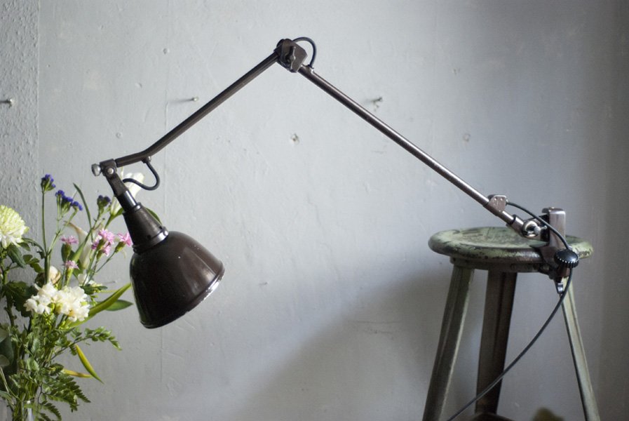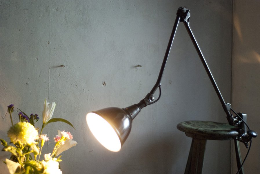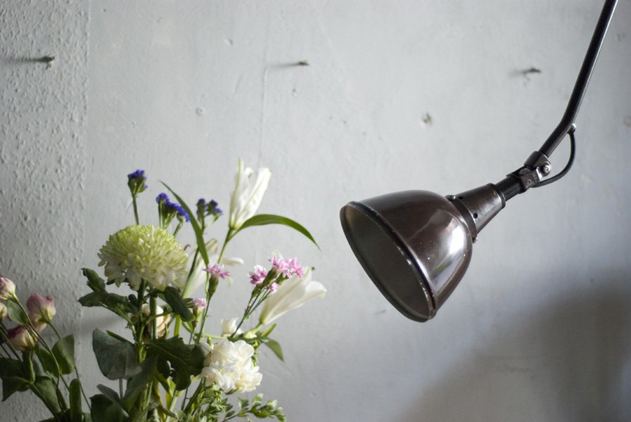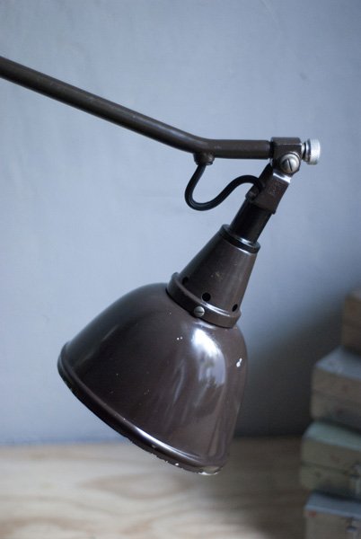 The design of this rare double-jointed lamp comes from the Curt Fischer, CA 1920 has worked on the idea of “steerable light”. Before the well-known designs by Christian Dell, or Marianne Brandt, Curt Fischer with the all-round mobile workstation lighting implemented the idea of so-called ‘steerable light’. The metal workshop at the Bauhaus in Weimar was lit with Midgard lights and the Bauhaus students and served as inspiration, and is verifiable in the living room furniture by Ilse and Walter Gropius in their house at the Dessau Bauhaus.