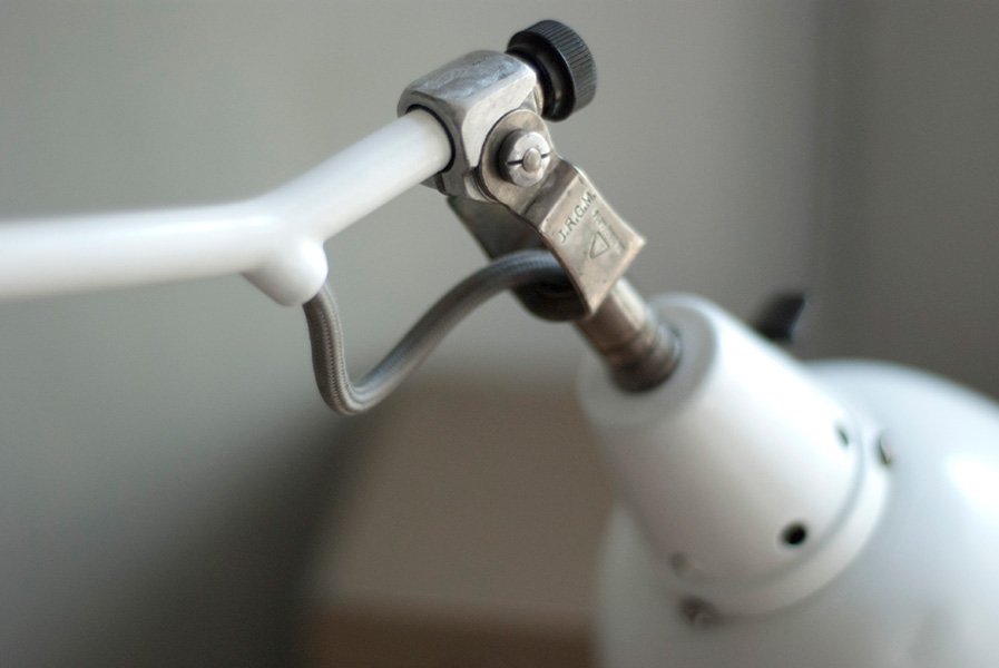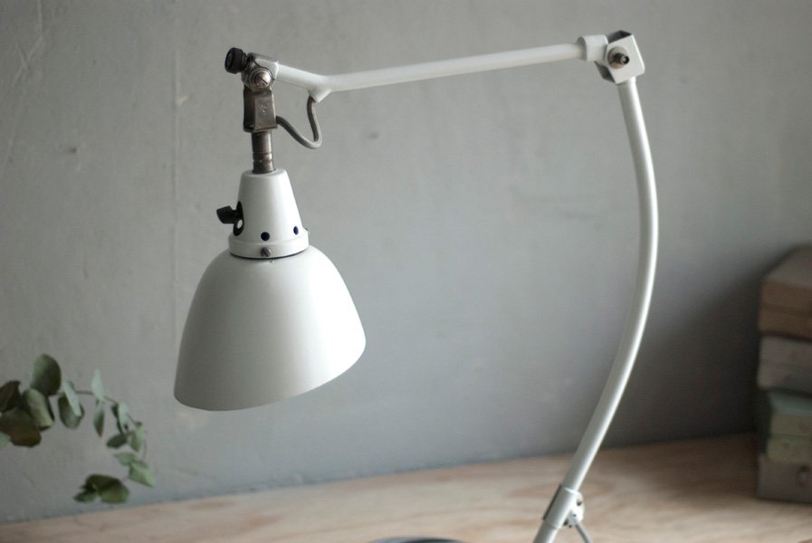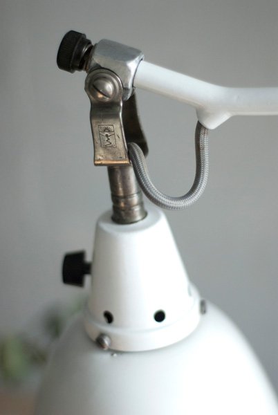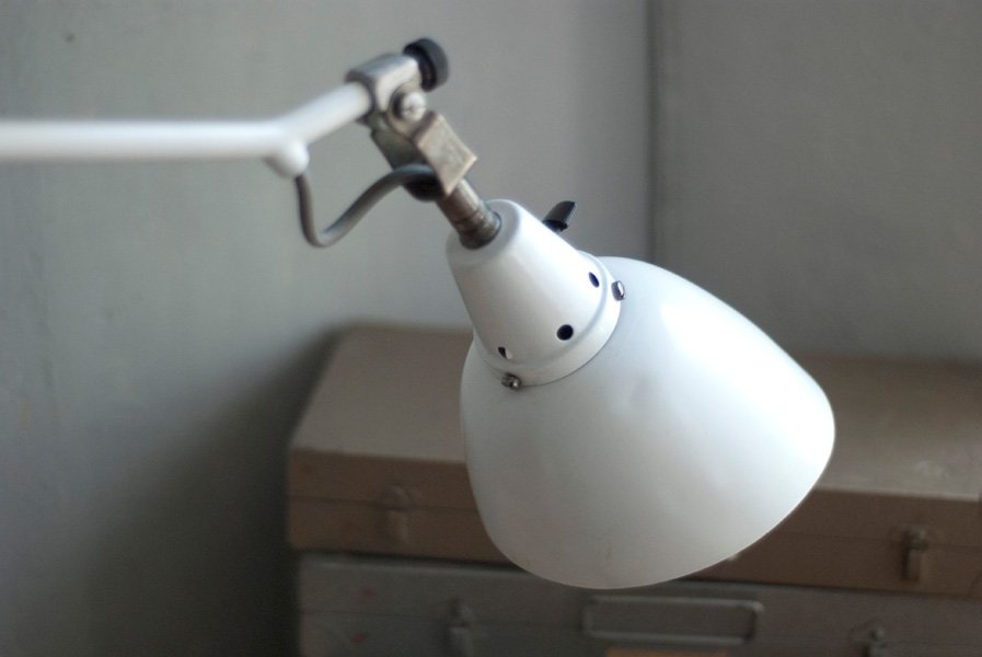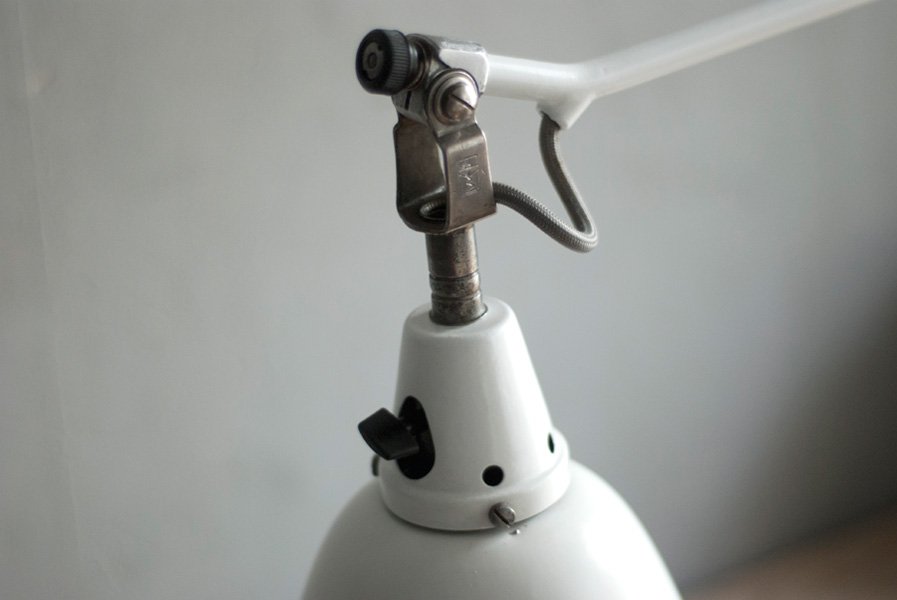 The design of this rare double-jointed lamp comes from the Curt Fischer, CA 1920 has worked on the idea of “steerable light”. Before the well-known designs by Christian Dell, or Marianne Brandt, Curt Fischer with the all-round mobile workstation lighting implemented the idea of so-called ‘steerable light’. The metal workshop at the Bauhaus in Weimar was lit with Midgard lights and the Bauhaus students and served as inspiration, and is verifiable in the living room furniture by Ilse and Walter Gropius in their house at the Dessau Bauhaus.