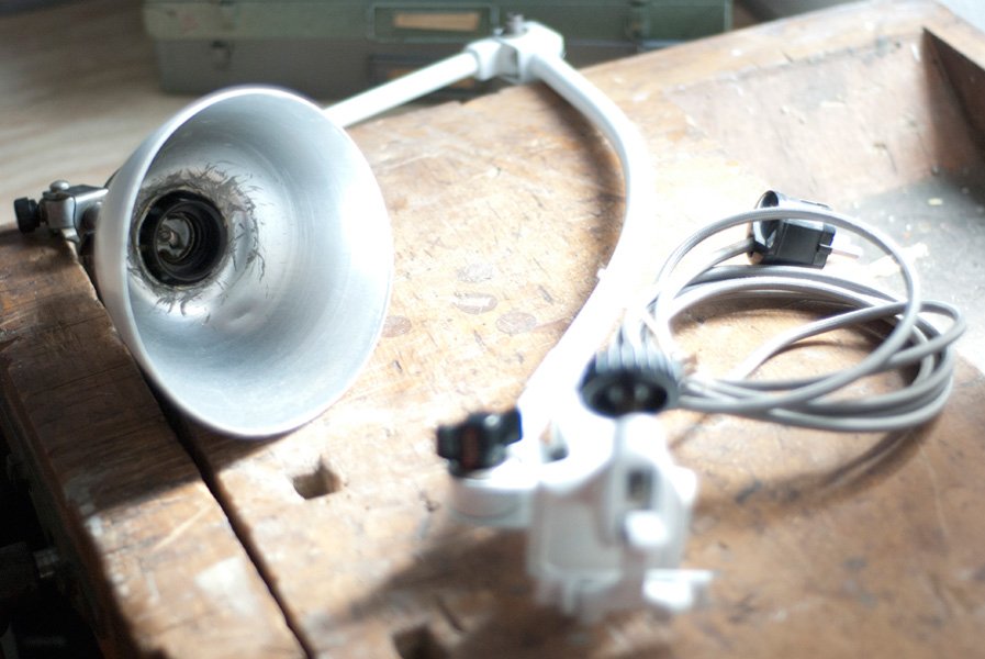 The lamp has signs of wear consistent with its age and use but is in great condition. The shade made of aluminium two small dents and a small loss of coat.