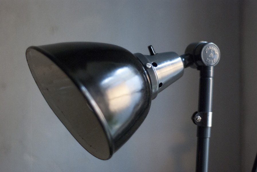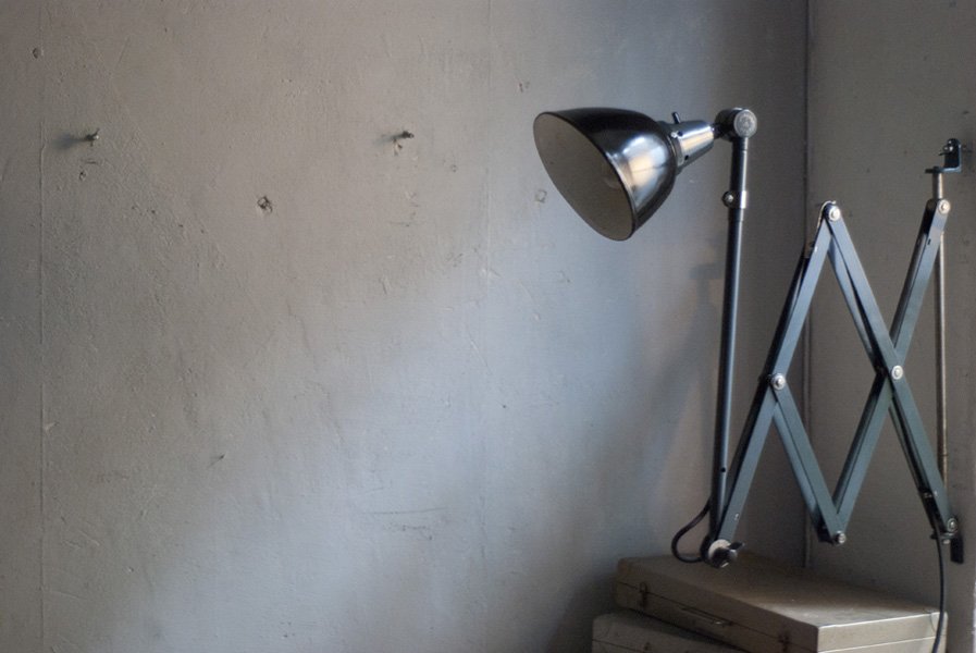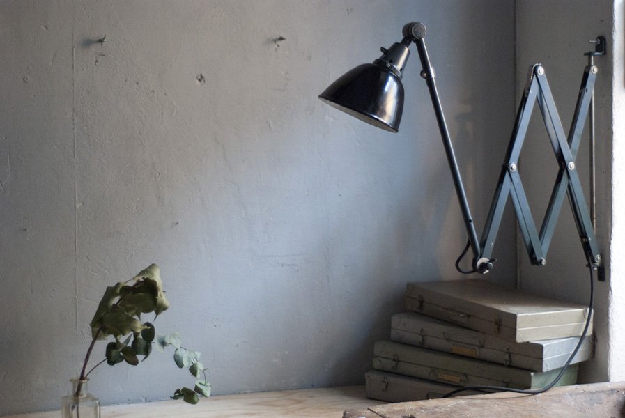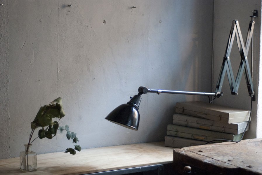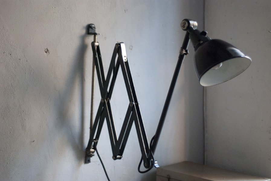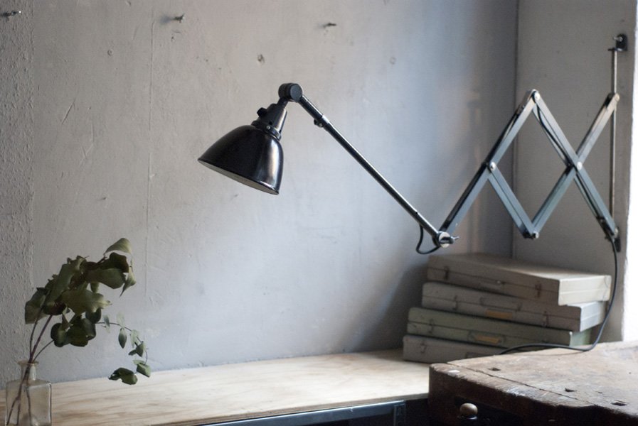 The design of this vintage scissor lamp was developed by Curt Fischer, who worked on the idea of the ‘steerable light’ from approx. 1920 on. Even before the well known designs by Christian Dell or Marianne Brandt, Curt Fischer realized the idea of the so-called ‘steerable light’ with the all-round movable work lamp. The metal workshop at the Weimar Bauhaus was lit with Midgard lights, serving as an example to Bauhaus students, and was used later in Ilse and Walter Gropius’ master house livingroom at the Dessau Bauhaus.