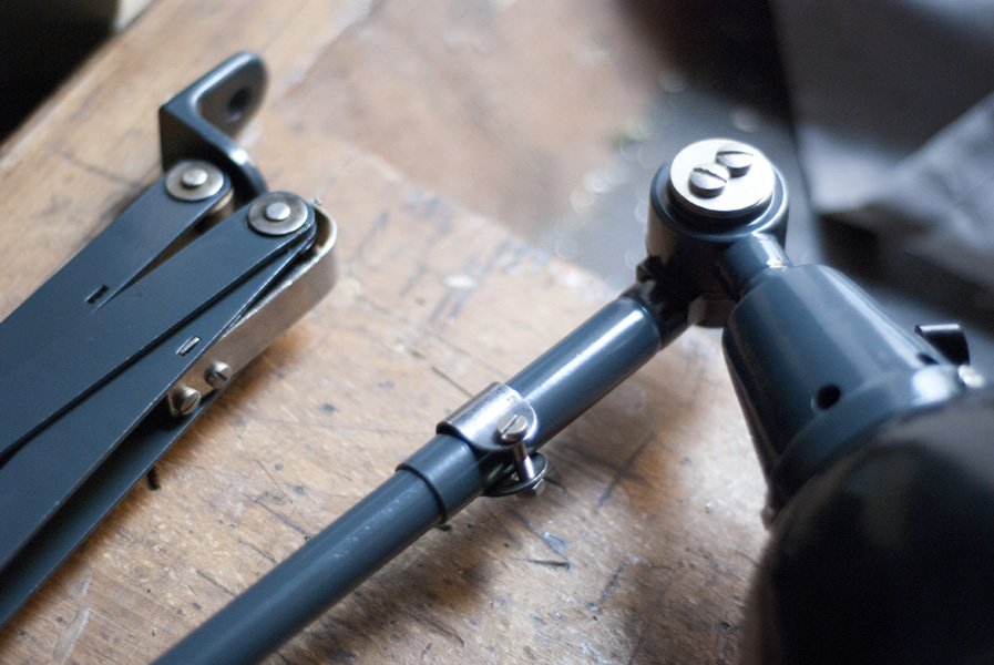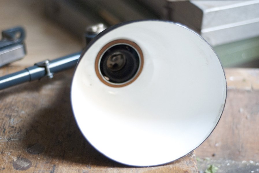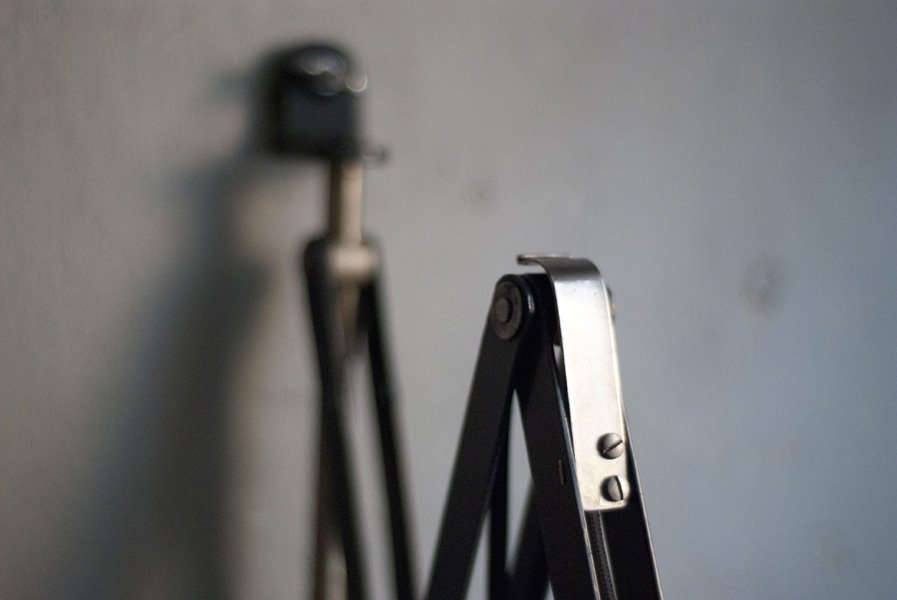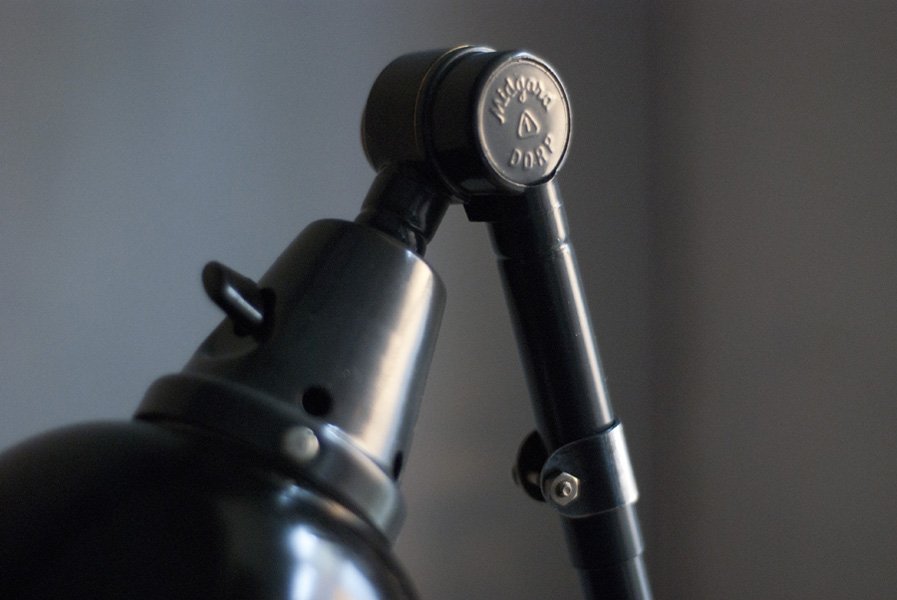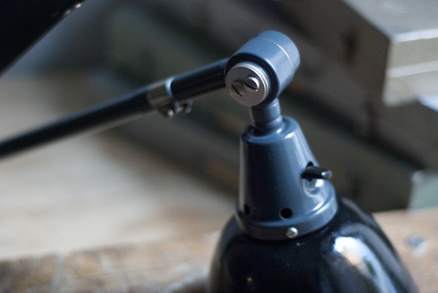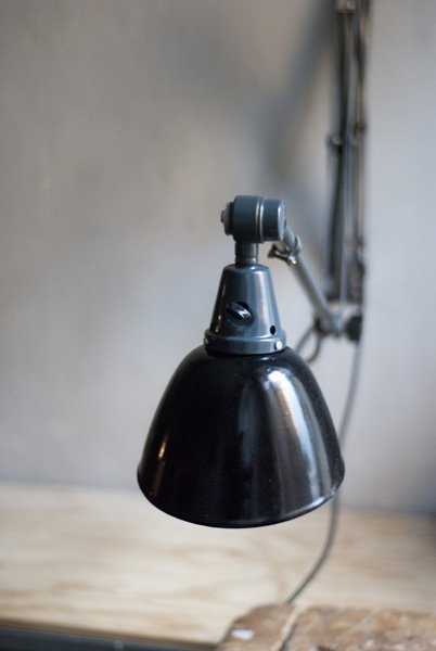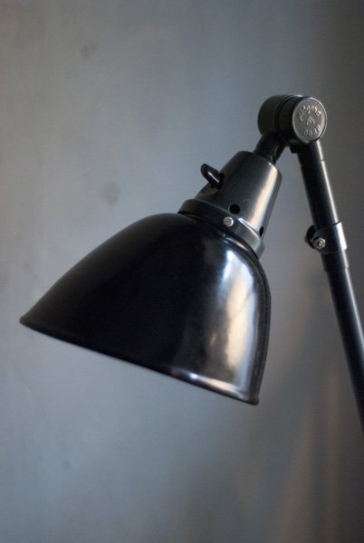 The design of this vintage scissor lamp was developed by Curt Fischer, who worked on the idea of the ‘steerable light’ from approx. 1920 on. Even before the well known designs by Christian Dell or Marianne Brandt, Curt Fischer realized the idea of the so-called ‘steerable light’ with the all-round movable work lamp. The metal workshop at the Weimar Bauhaus was lit with Midgard lights, serving as an example to Bauhaus students, and was used later in Ilse and Walter Gropius’ master house livingroom at the Dessau Bauhaus.