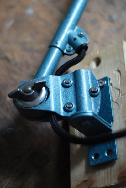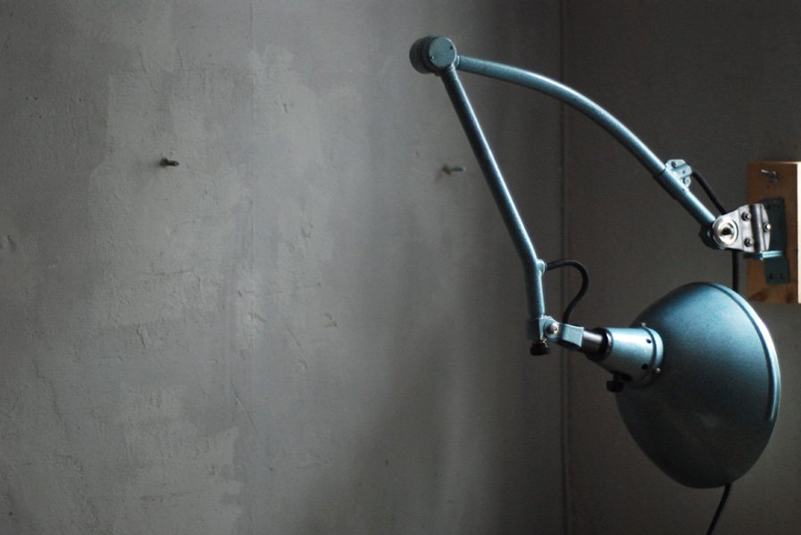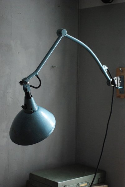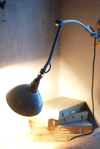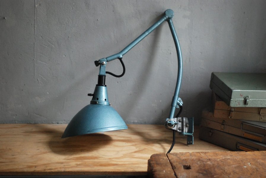 The design of this vintage hinged double-jointed lamp was developed by Curt Fischer, who worked on the idea of the ‘steerable light’ from approx. 1920 on. Even before the well known designs by Christian Dell or Marianne Brandt, Curt Fischer realized the idea of the so-called ‘steerable light’ with the all-round movable work lamp. The metal workshop at the Weimar Bauhaus was lit with Midgard lights, serving as an example to Bauhaus students, and was used later in Ilse and Walter Gropius’ master house livingroom at the Dessau Bauhaus.