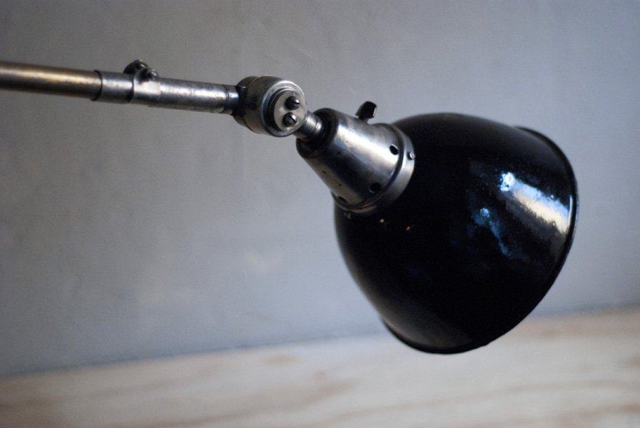 The design of this vintage hinged double-jointed lamp was developed by Curt Fischer, who worked on the idea of the ‘steerable light’ from approx. 1920 on. Even before the well known designs by Christian Dell or Marianne Brandt, Curt Fischer realized the idea of the so-called ‘steerable light’ with the all-round movable work lamp. The metal workshop at the Weimar Bauhaus was lit with Midgard lights, serving as an example to Bauhaus students, and was used later in Ilse and Walter Gropius’ master house livingroom at the Dessau Bauhaus.