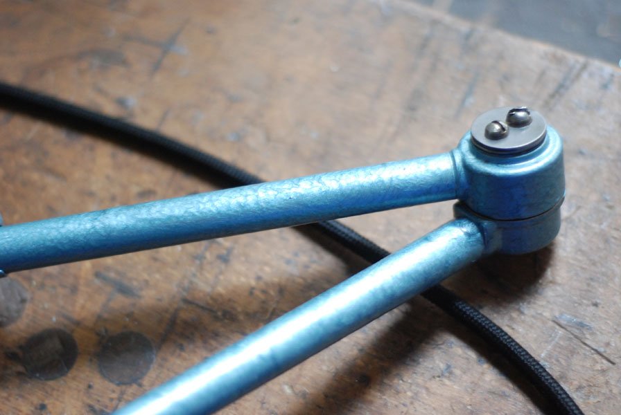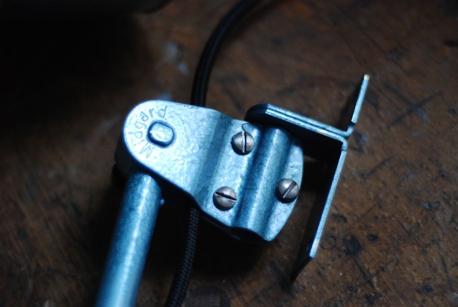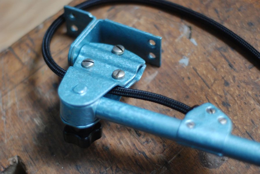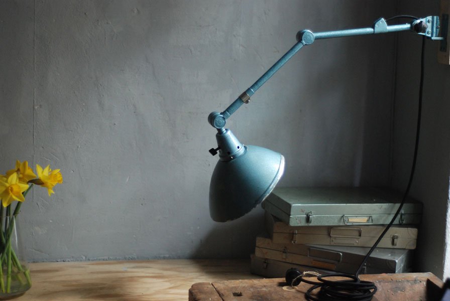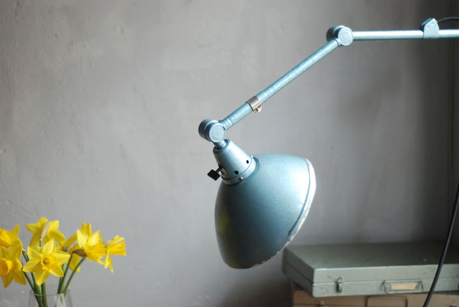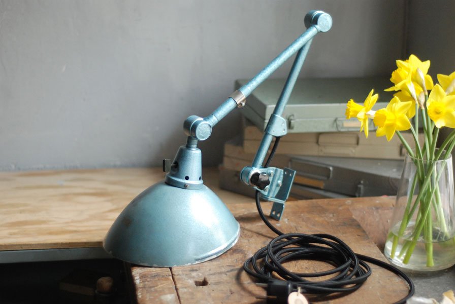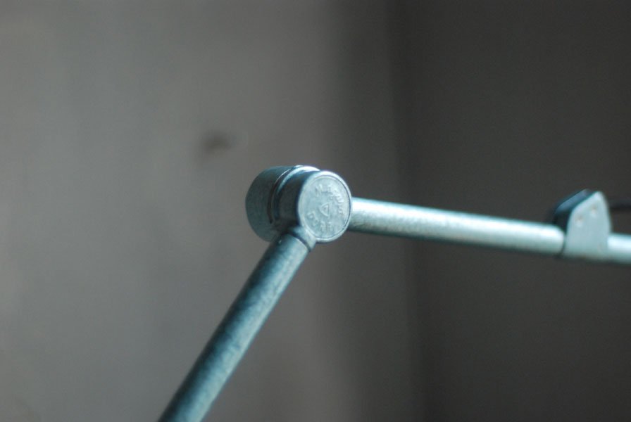 The design of this vintage hinged double-jointed lamp was developed by Curt Fischer, who worked on the idea of the ‘steerable light’ from approx. 1920 on. Even before the well known designs by Christian Dell or Marianne Brandt, Curt Fischer realized the idea of the so-called ‘steerable light’ with the all-round movable work lamp. The metal workshop at the Weimar Bauhaus was lit with Midgard lights, serving as an example to Bauhaus students, and was used later in Ilse and Walter Gropius’ master house livingroom at the Dessau Bauhaus.