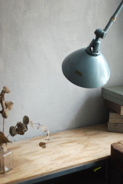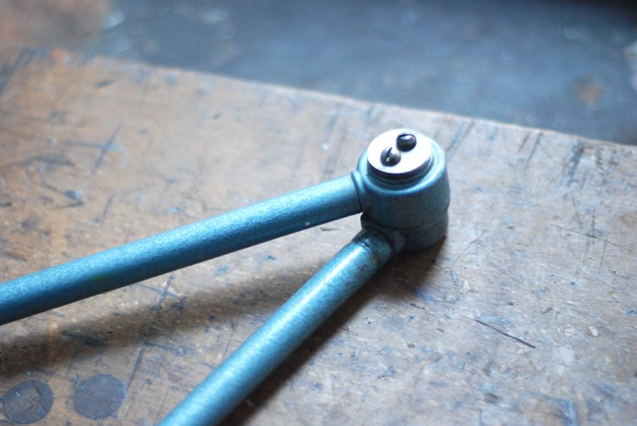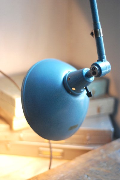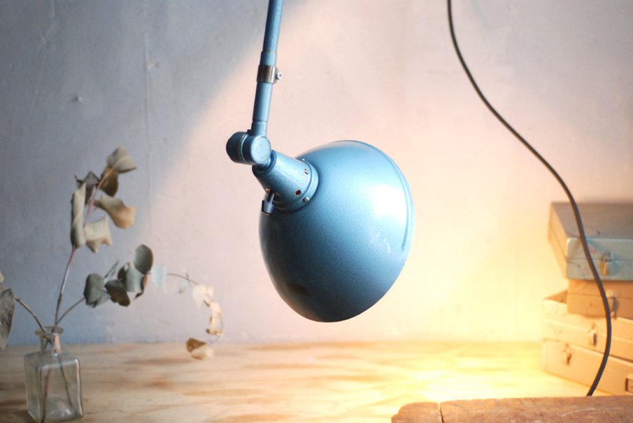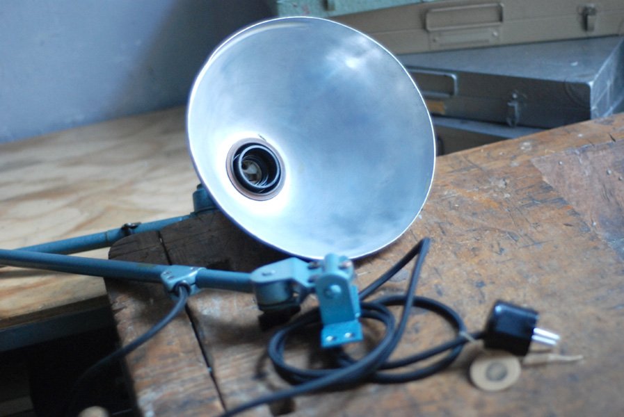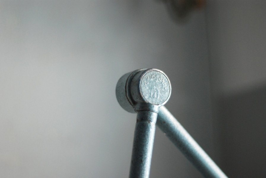 The design of this vintage hinged double-jointed lamp was developed by Curt Fischer, who worked on the idea of the ‘steerable light’ from approx. 1920 on. Even before the well known designs by Christian Dell or Marianne Brandt, Curt Fischer realized the idea of the so-called ‘steerable light’ with the all-round movable work lamp. The metal workshop at the Weimar Bauhaus was lit with Midgard lights, serving as an example to Bauhaus students, and was used later in Ilse and Walter Gropius’ master house livingroom at the Dessau Bauhaus.