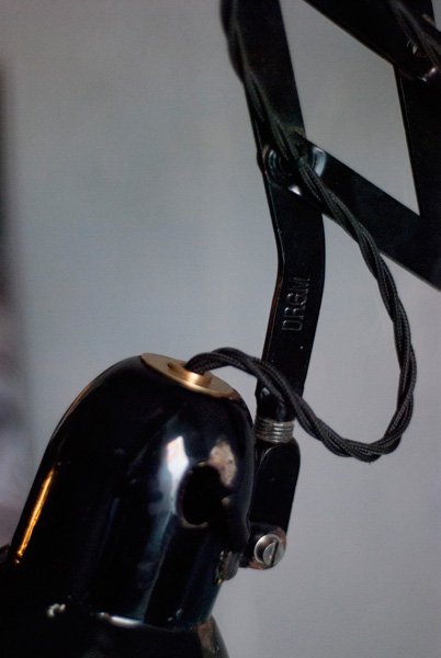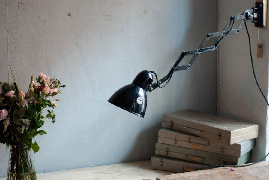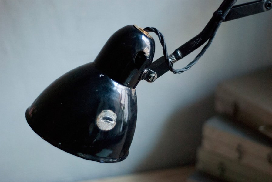 Old PeHaWa DRGM scissor lamp with enameled shade.