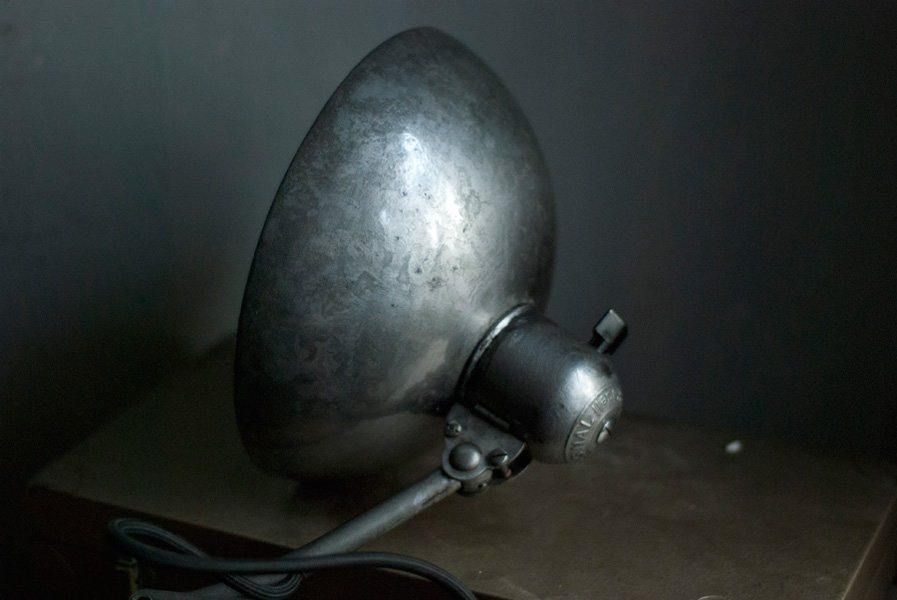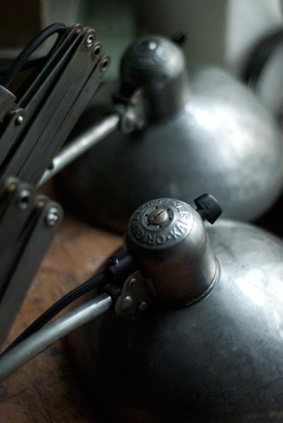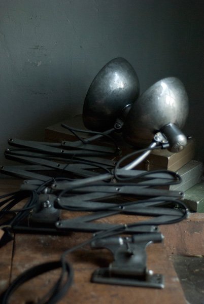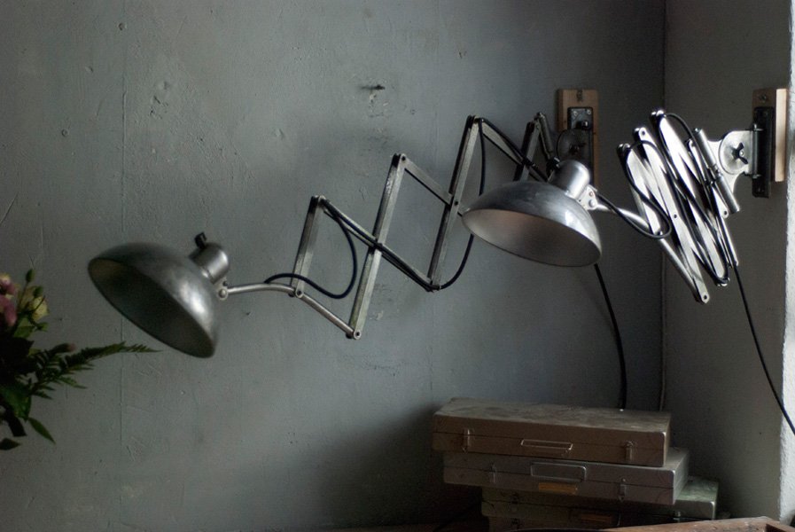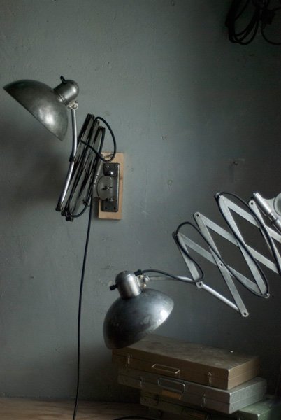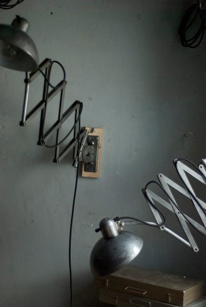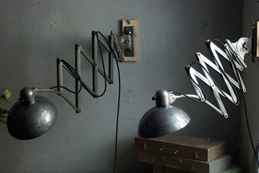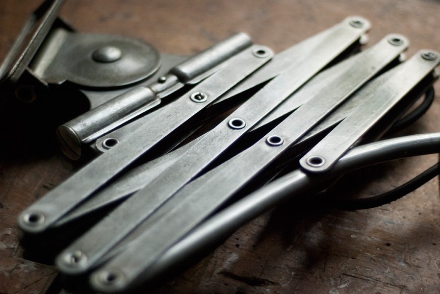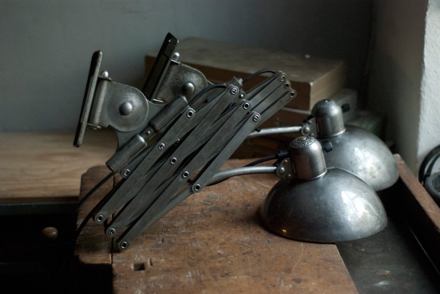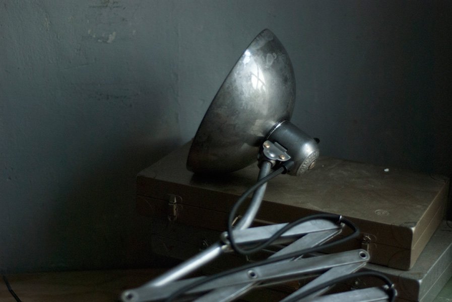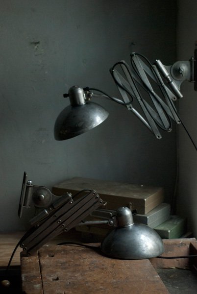 The lamps have signs of wear consistent with its age and use. The scissors and the shade have a very nice patina.