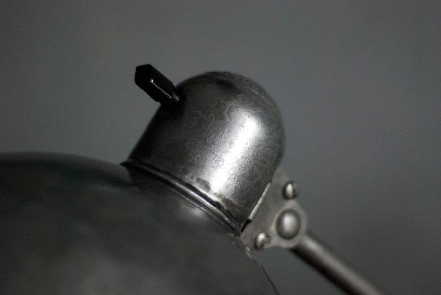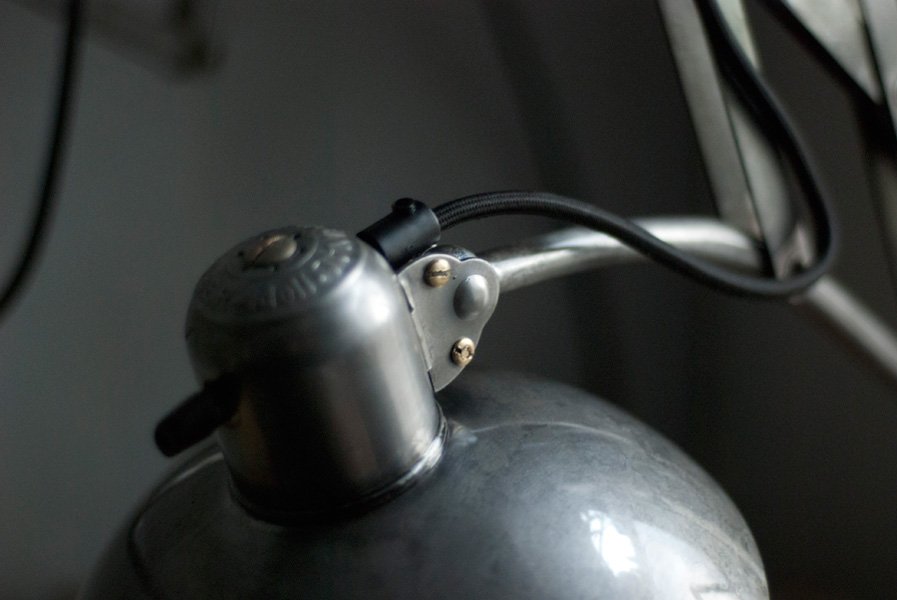 After the thorough dismantling cleaning rust removal of all elements, the lamp was polished brushed clear coated and built again.