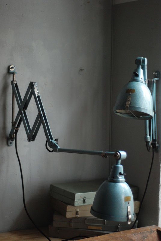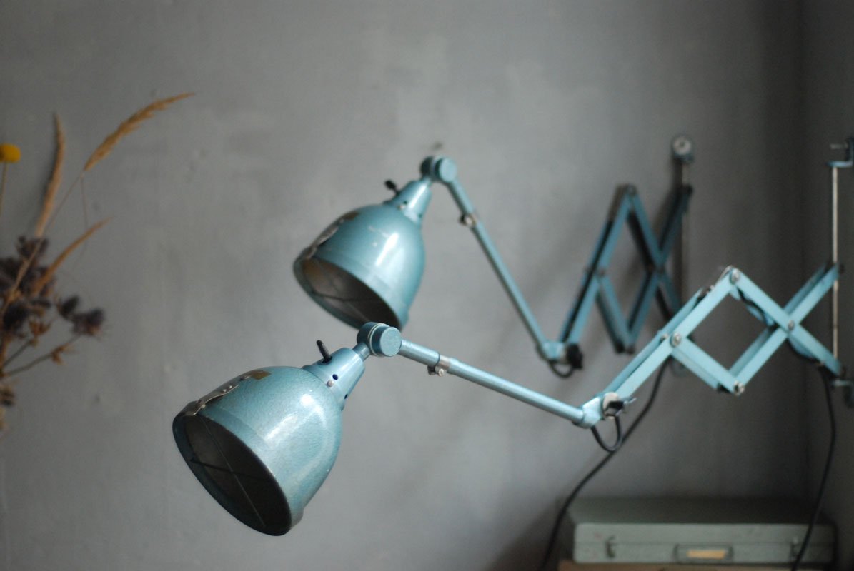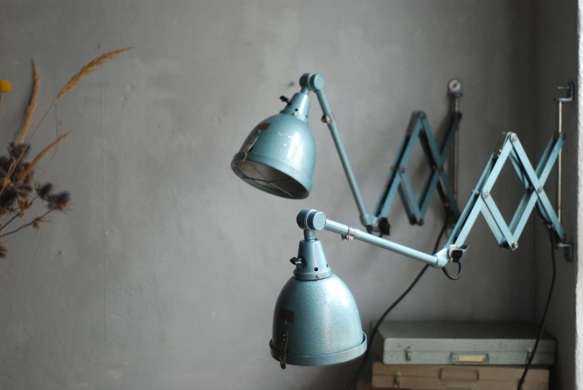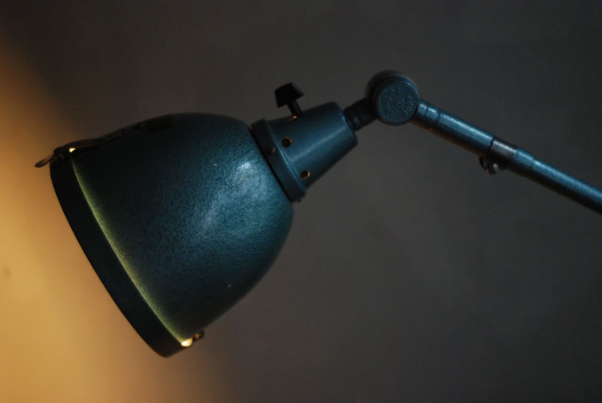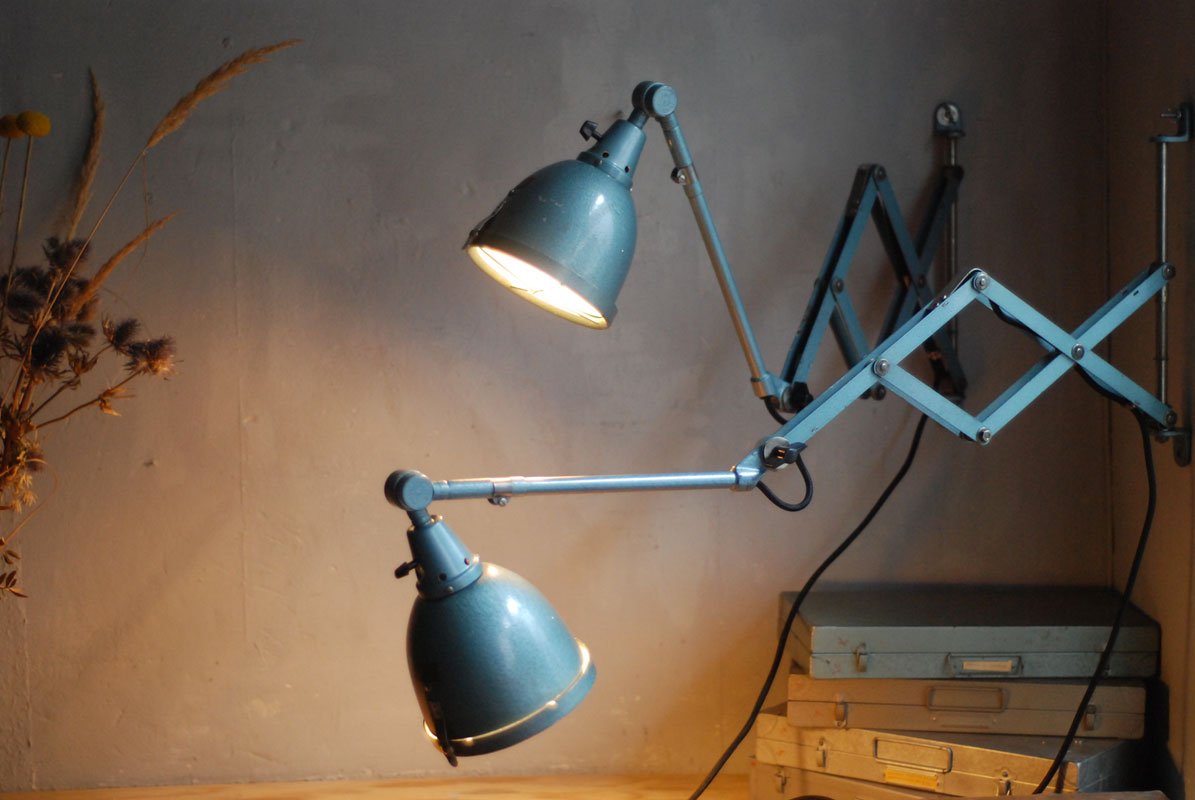 The design of those vintage hinged double-jointed lamps from the DDR time was developed by Curt Fischer, who worked on the idea of the ‘steerable light’ from approx. 1920 on. Even before the well known designs by Christian Dell or Marianne Brandt, Curt Fischer realized the idea of the so-called ‘steerable light’ with the all-round movable work lamp. The metal workshop at the Weimar Bauhaus was lit with Midgard lights, serving as an example to Bauhaus students, and was used later in Ilse and Walter Gropius’ master house livingroom at the Dessau Bauhaus.