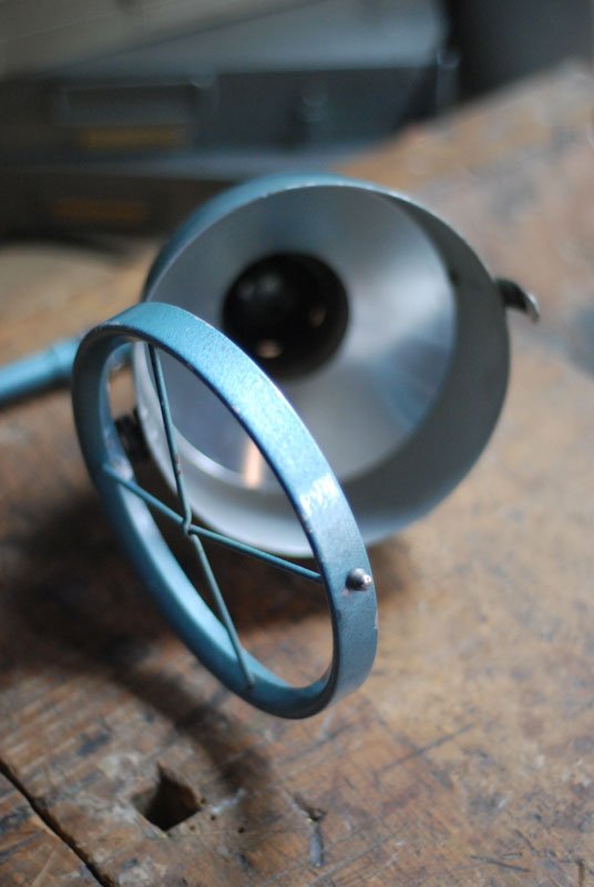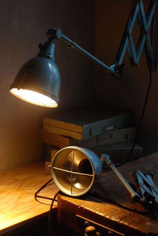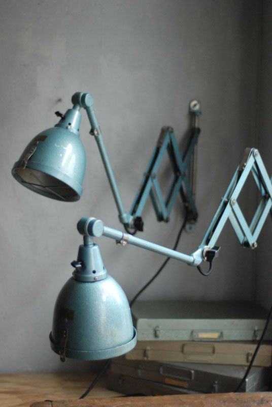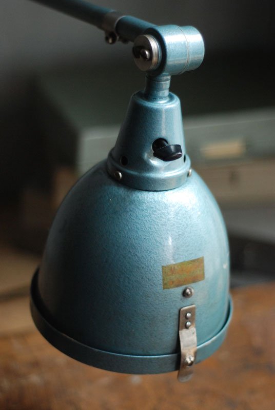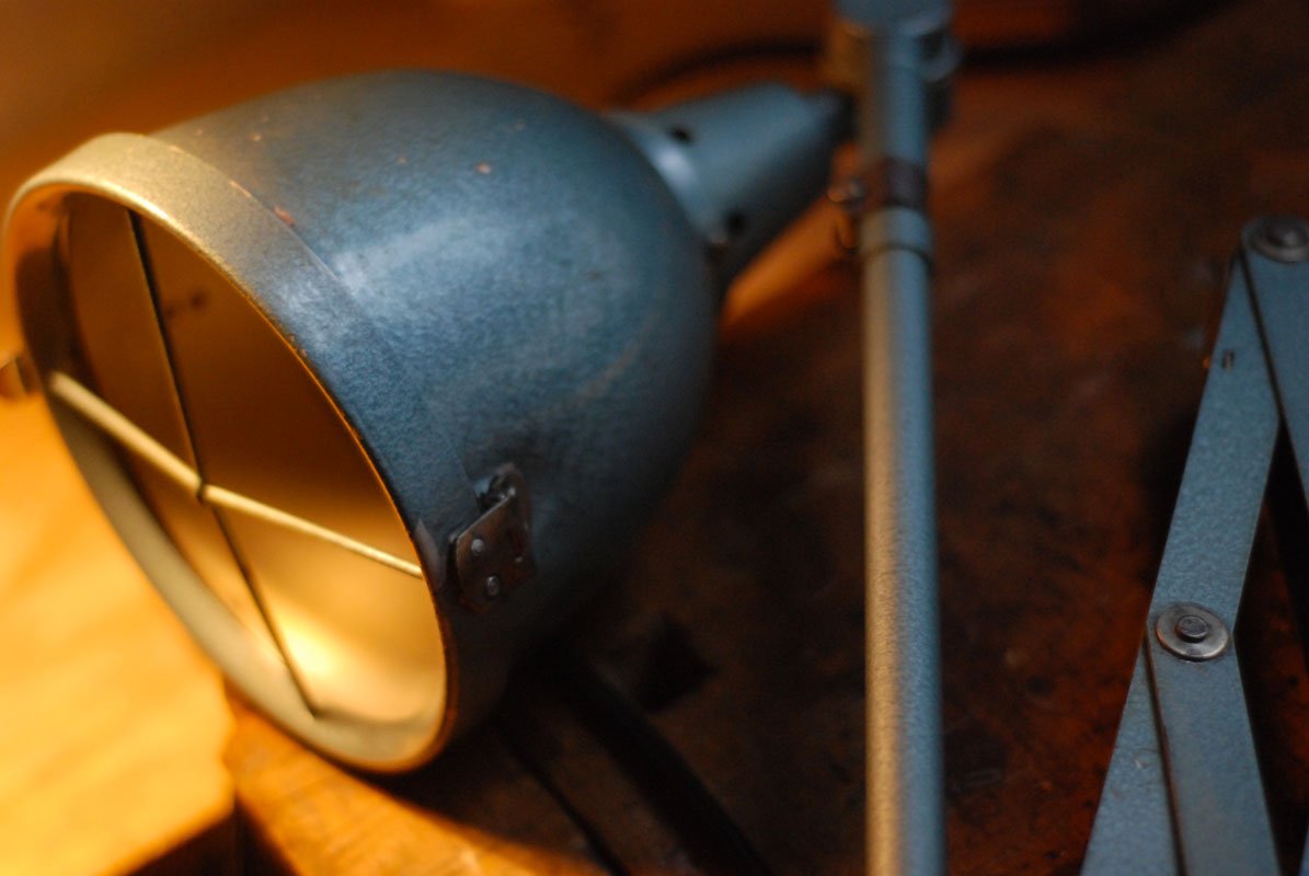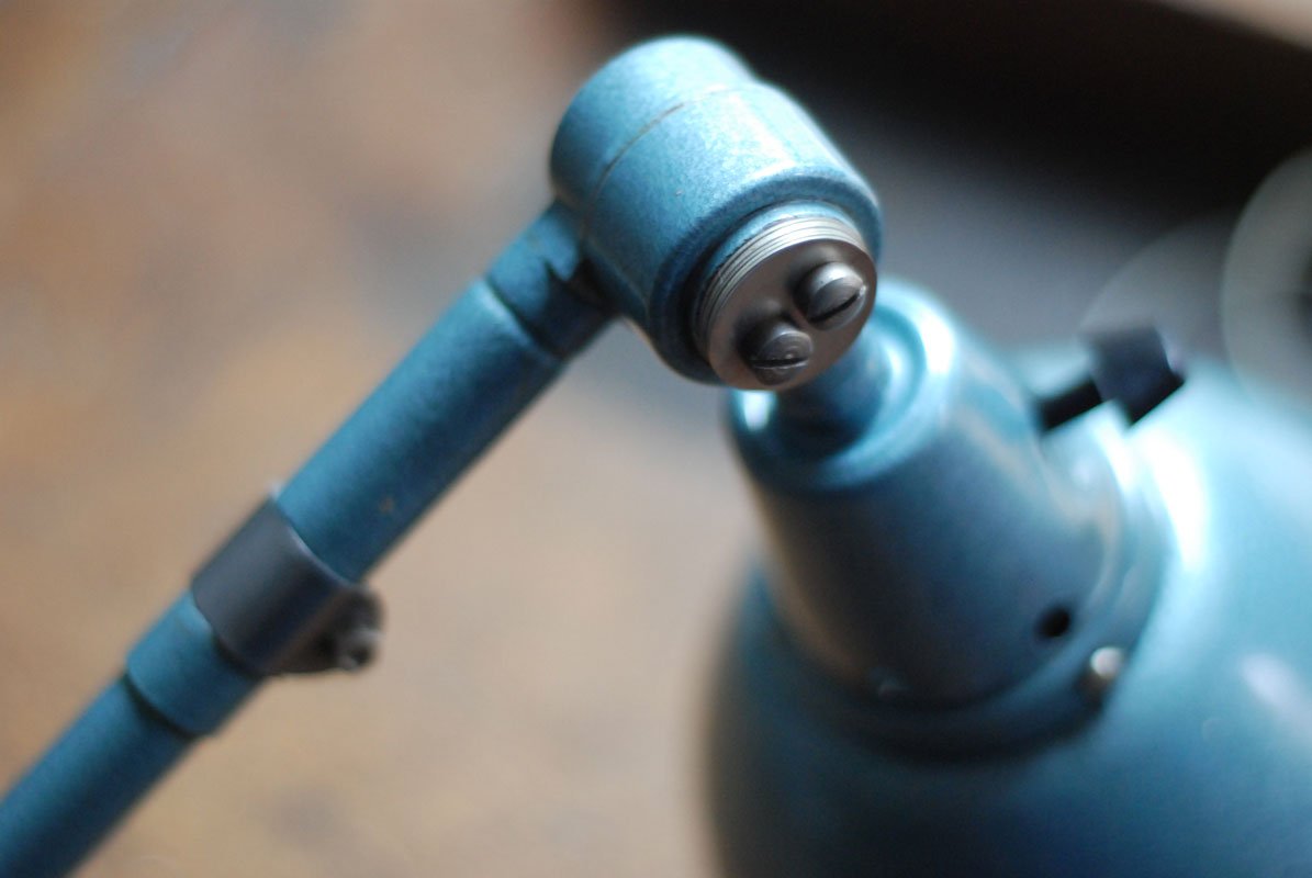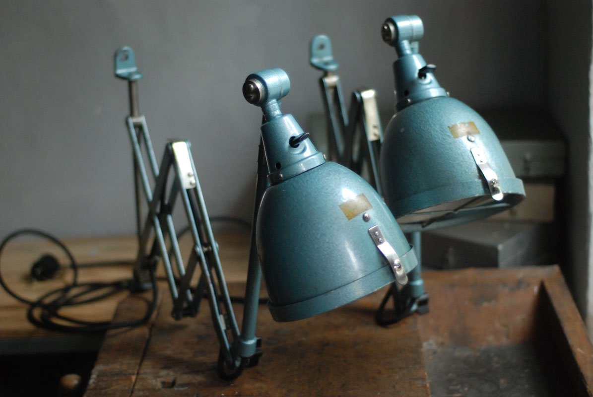The design of those vintage hinged double-jointed lamps from the DDR time was developed by Curt Fischer, who worked on the idea of the ‘steerable light’ from approx. 1920 on. Even before the well known designs by Christian Dell or Marianne Brandt, Curt Fischer realized the idea of the so-called ‘steerable light’ with the all-round movable work lamp. The metal workshop at the Weimar Bauhaus was lit with Midgard lights, serving as an example to Bauhaus students, and was used later in Ilse and Walter Gropius’ master house livingroom at the Dessau Bauhaus.