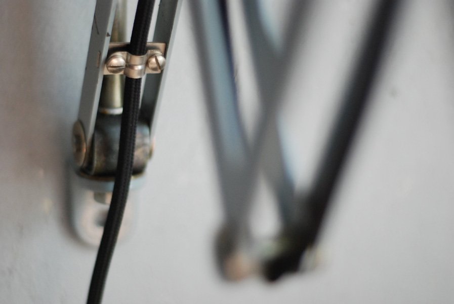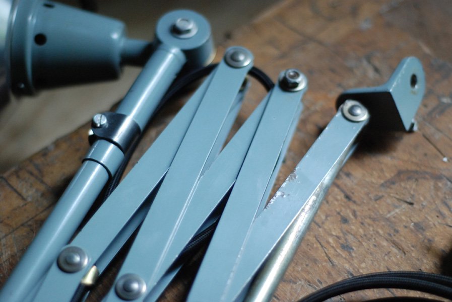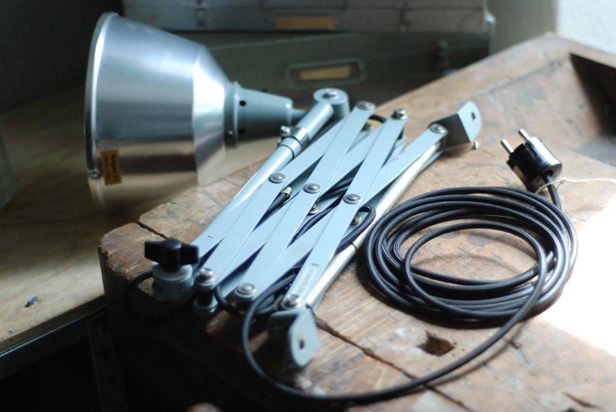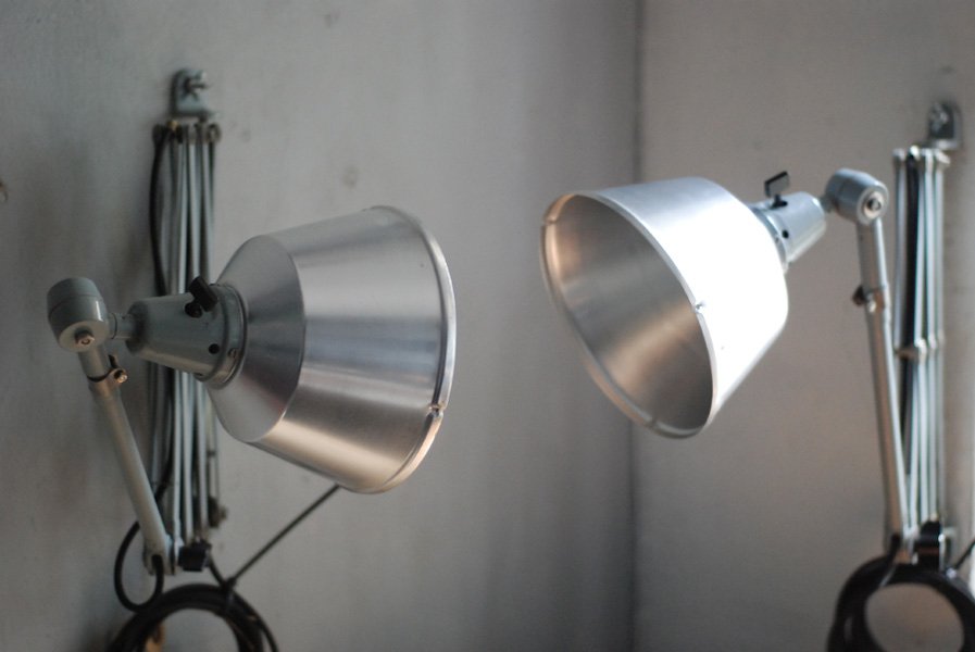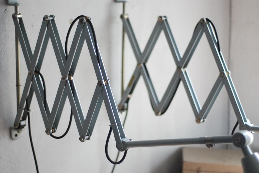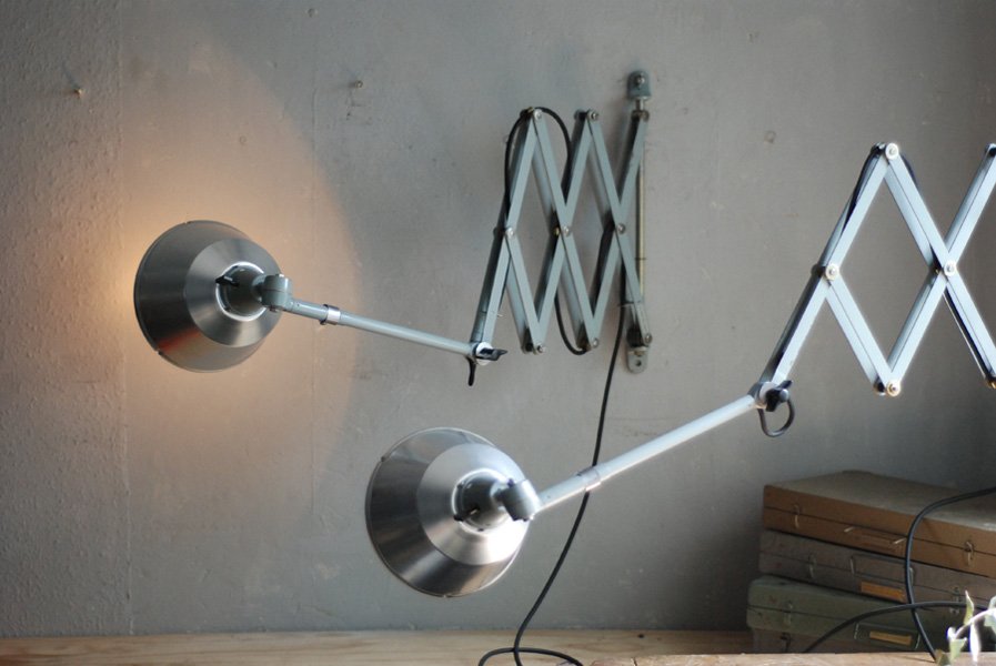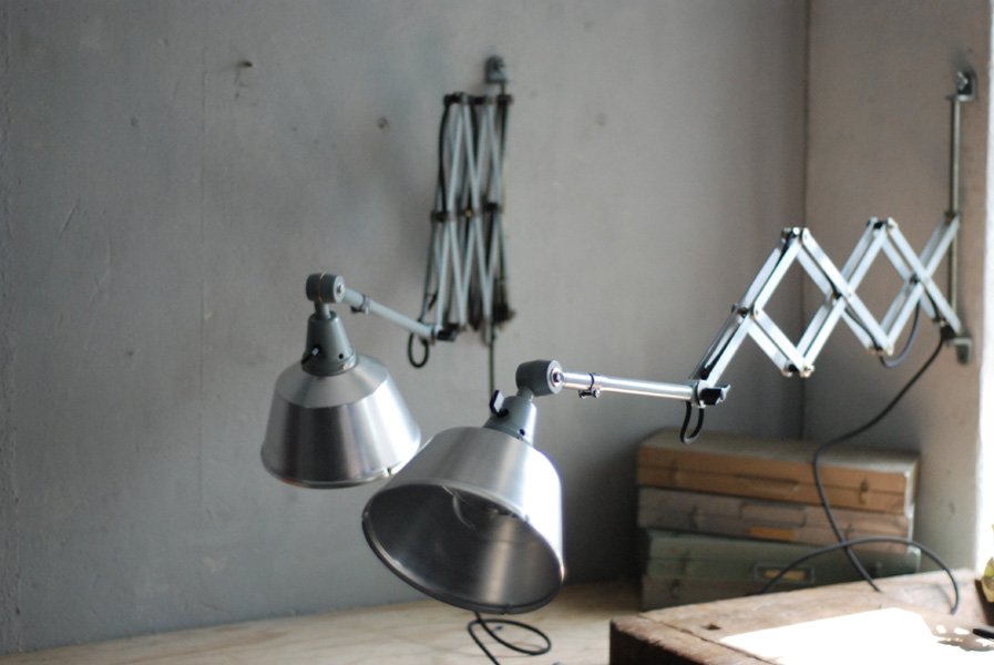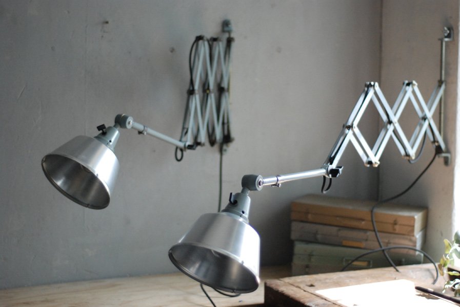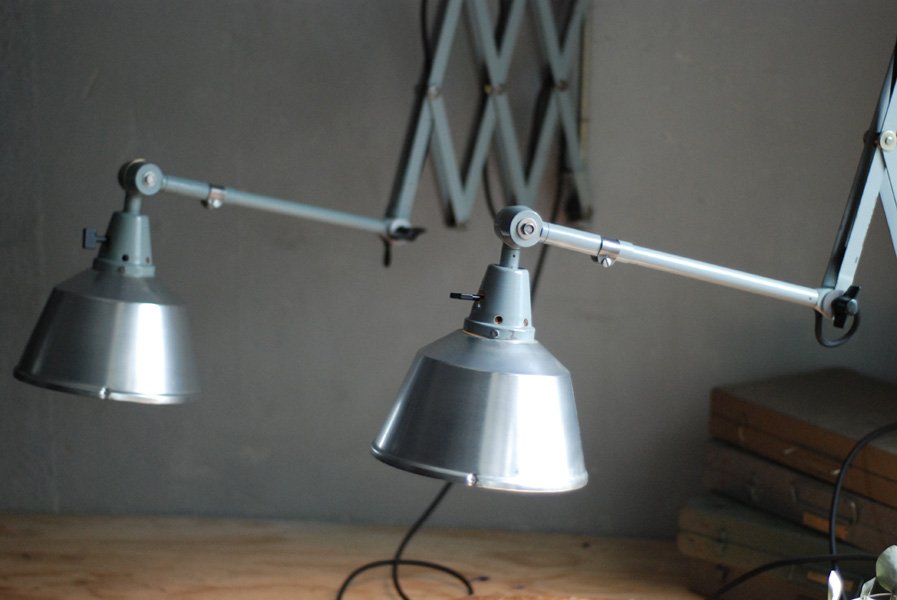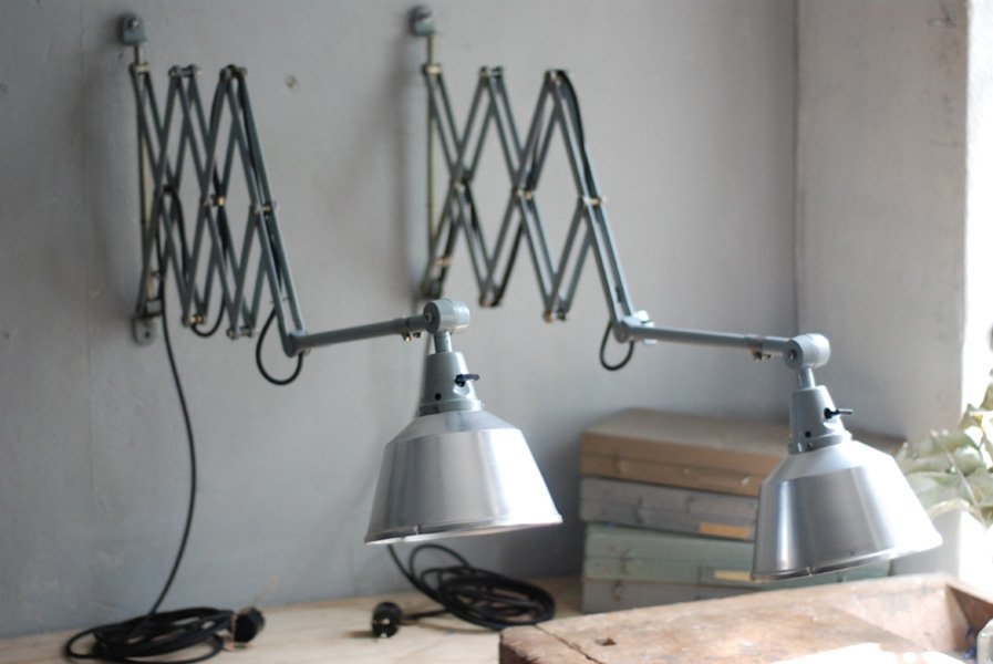 The lamps are in a used nice condition. The scissors have the original paint and only few losses of paint. The shades made of aluminium are in a perfect condition.