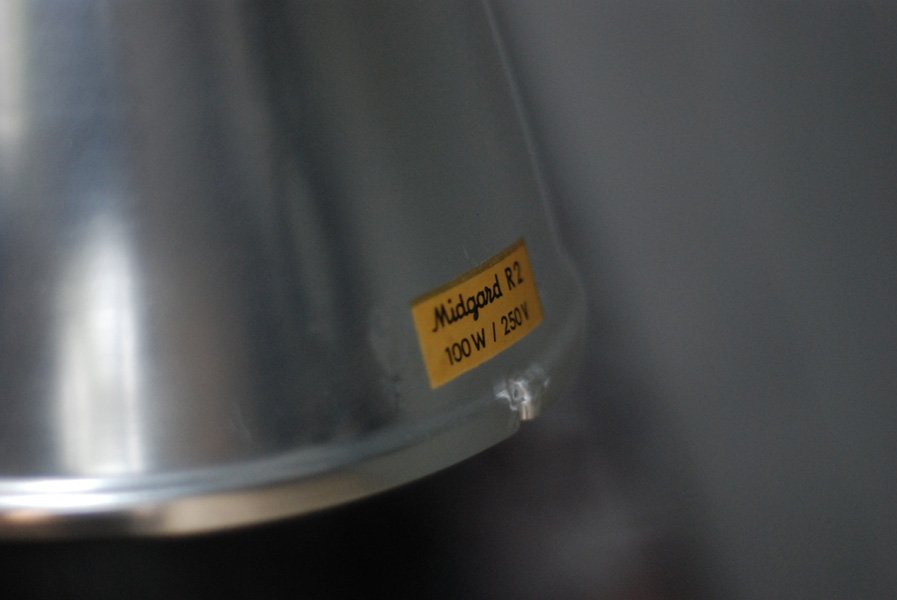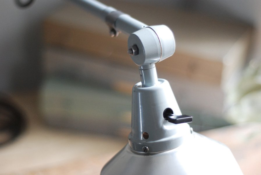 The design of this vintage hinged double-jointed lamp was developed by Curt Fischer, who worked on the idea of the ‘steerable light’ from approx. 1920 on. Even before the well known designs by Christian Dell or Marianne Brandt, Curt Fischer realized the idea of the so-called ‘steerable light’ with the all-round movable work lamp. The metal workshop at the Weimar Bauhaus was lit with Midgard lights, serving as an example to Bauhaus students, and was used later in Ilse and Walter Gropius’ master house livingroom at the Dessau Bauhaus.