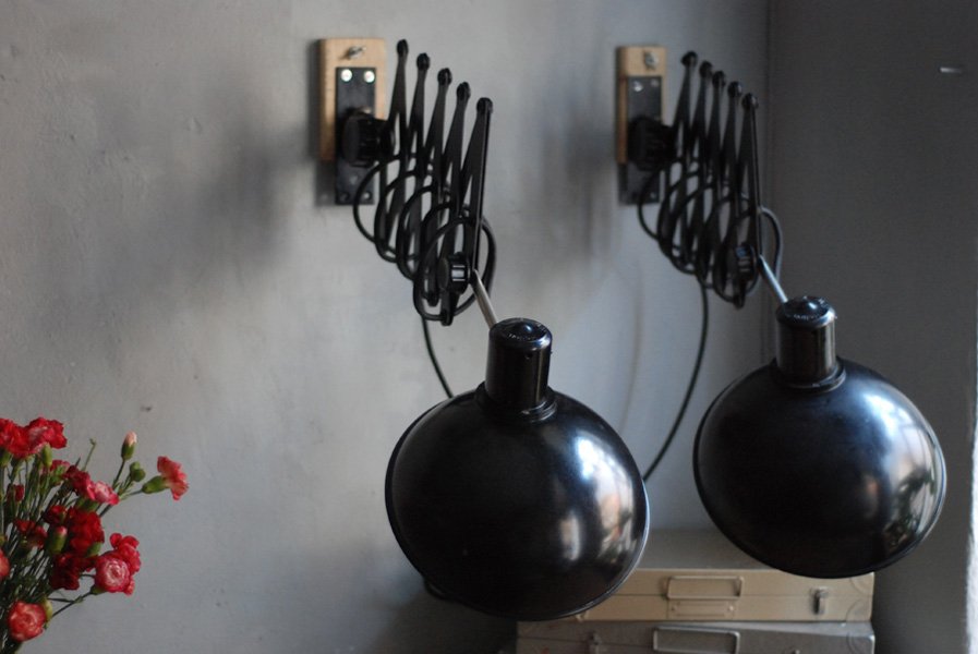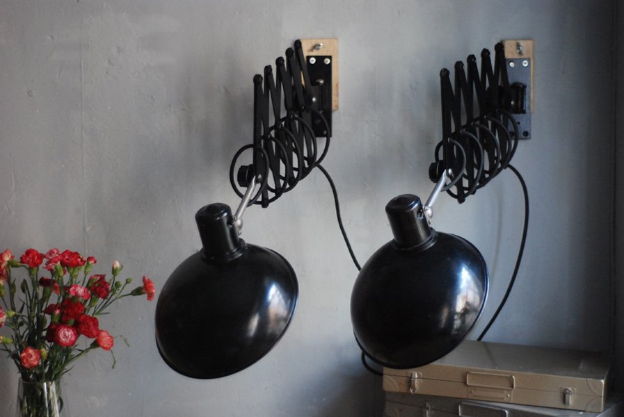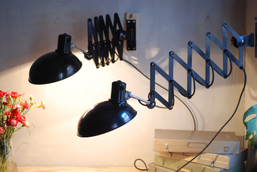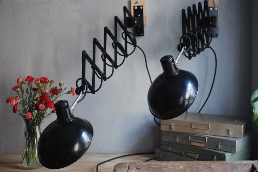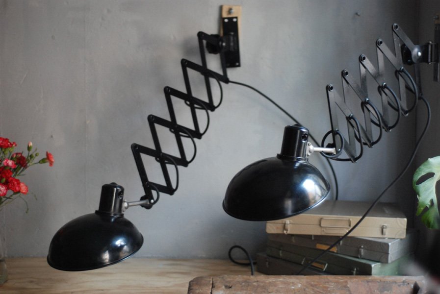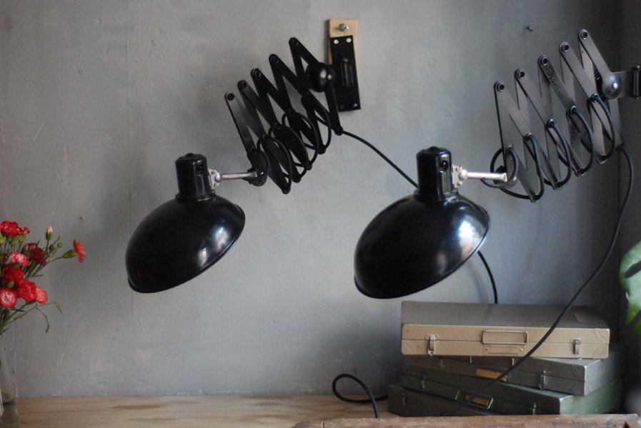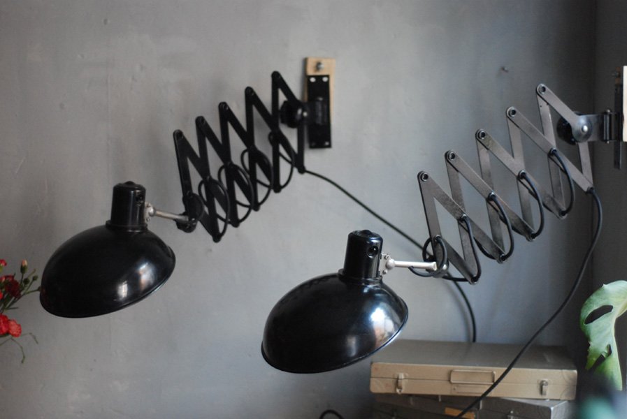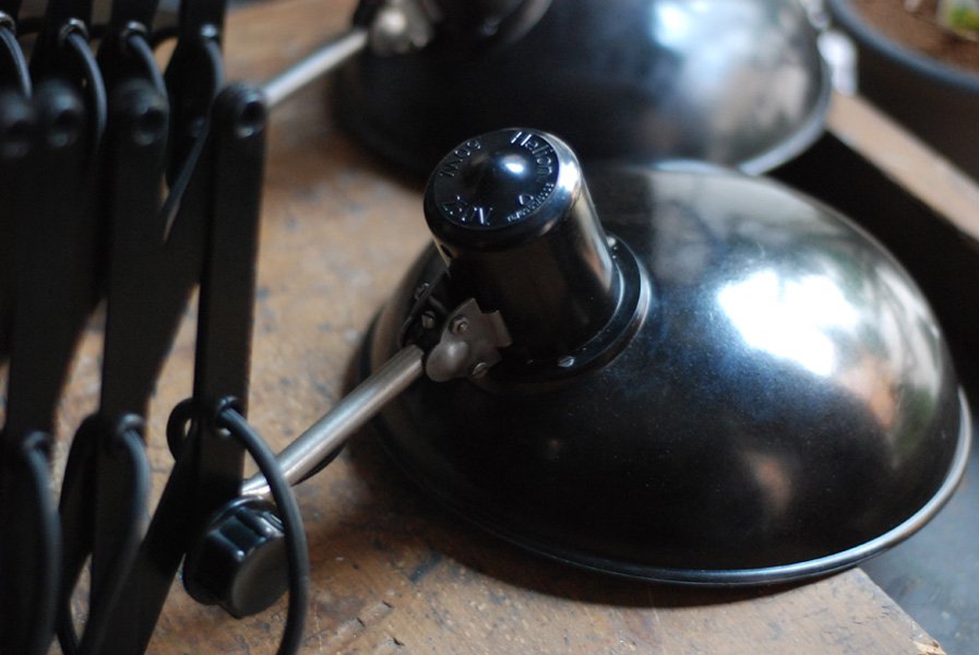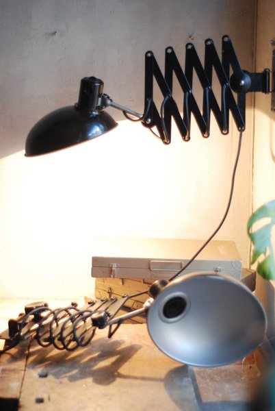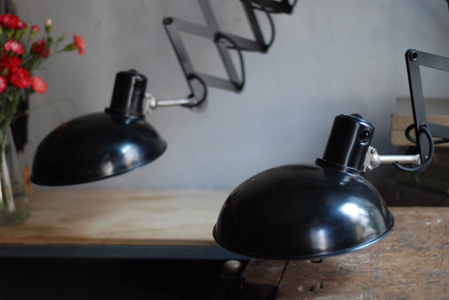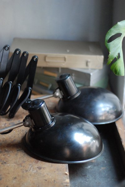 The lamps has few signs of wear consistent with their age and use. The scissors have a nice patina. The shade has no fissure and all the parts made of bakelite were kempt with a old home remedy.