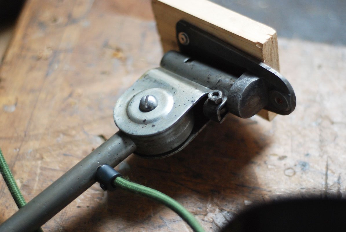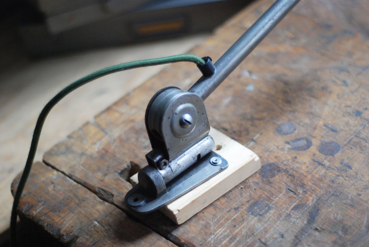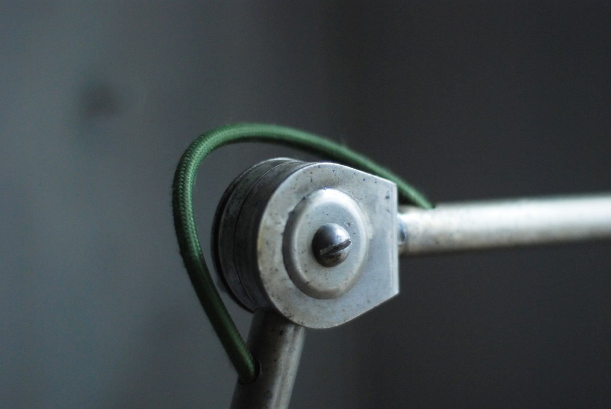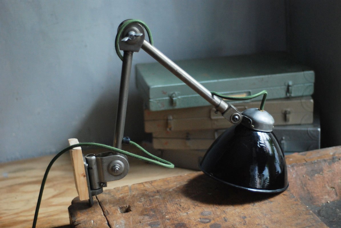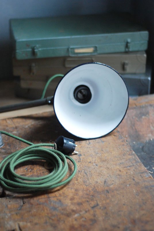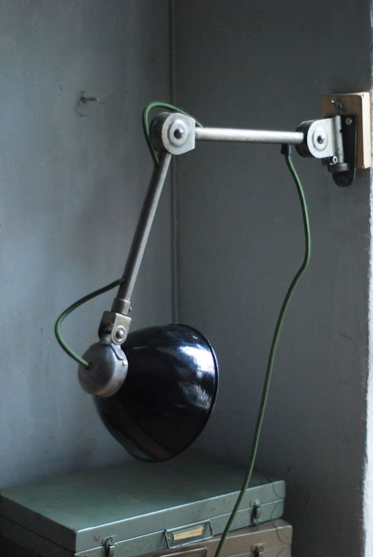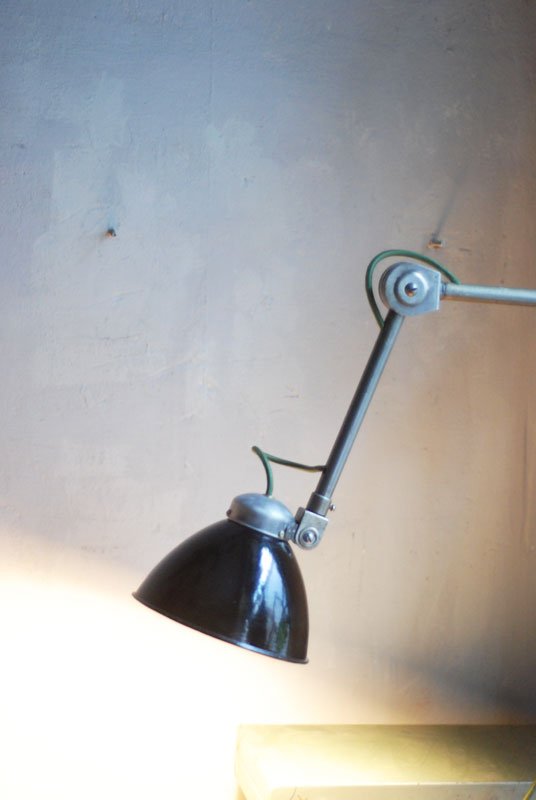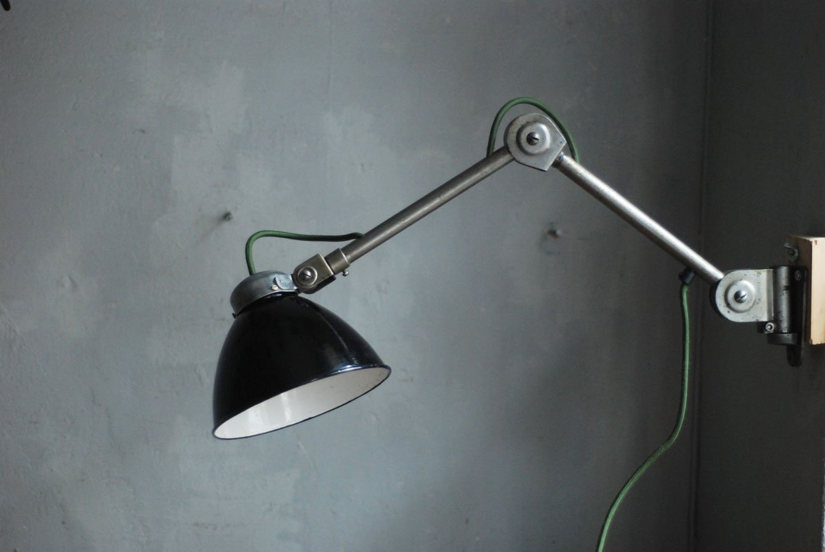 Upcycled Hala wall lamp with enameled shade from another manufacturerThe work and use lights Hala are atypical and easy thanks to its mechanism, which allows a perfect mobility without setting. They are quite rare, produced by late 1920 until 1950 by the German society of Defense Kamp – judge & co under the name of Hala, initials of Hanoverian lamp works.