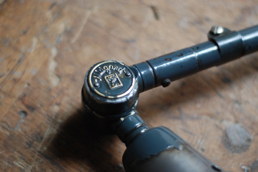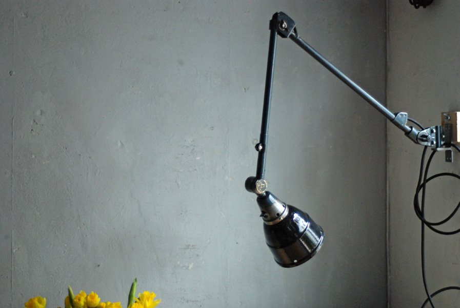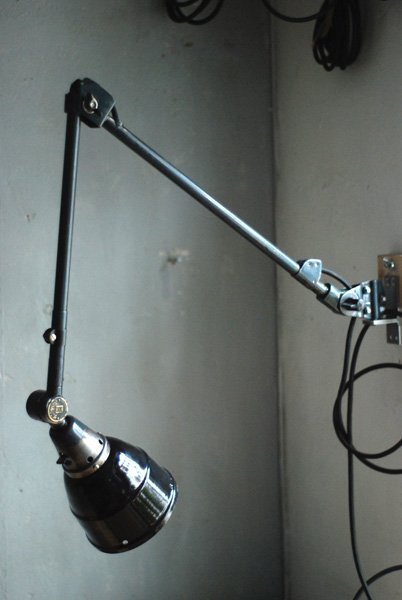 Alte Gelenkleuchte Midgard Mod.66 mit einzigartiger Patina mit emailliertem Reflektor.