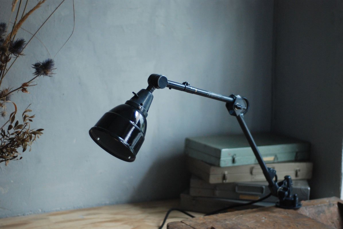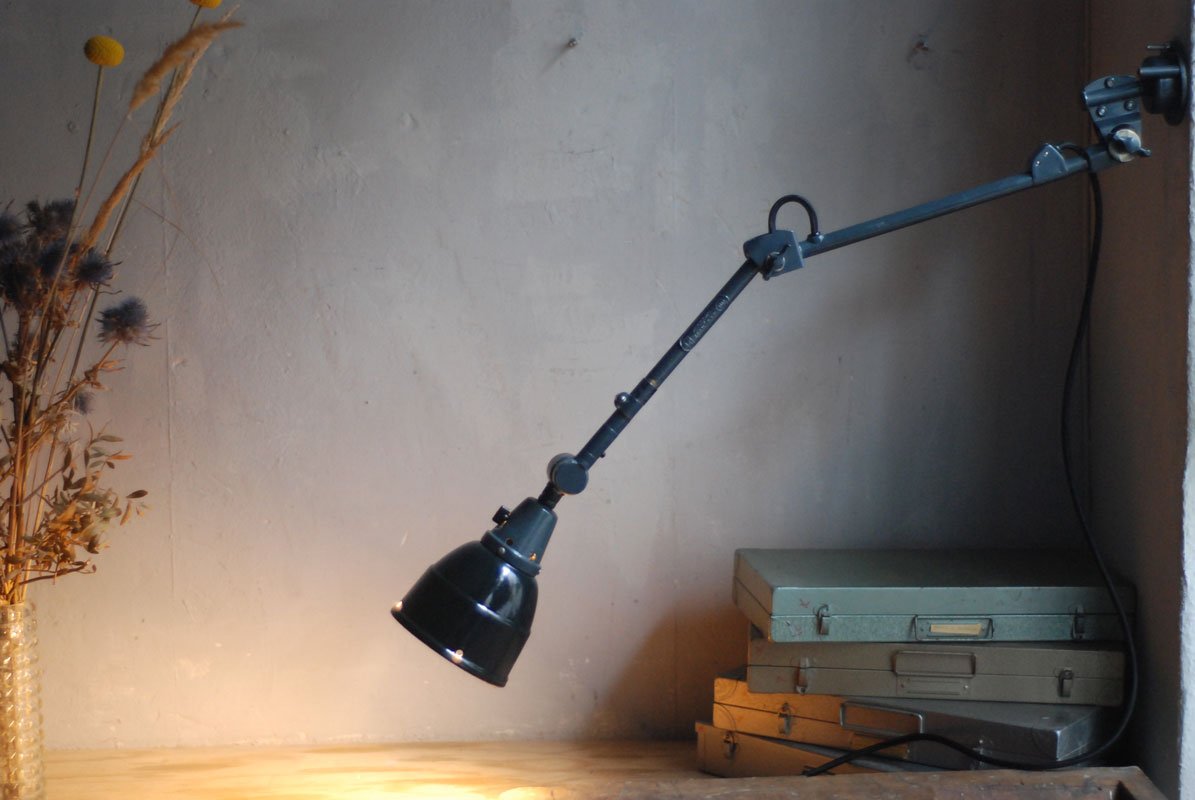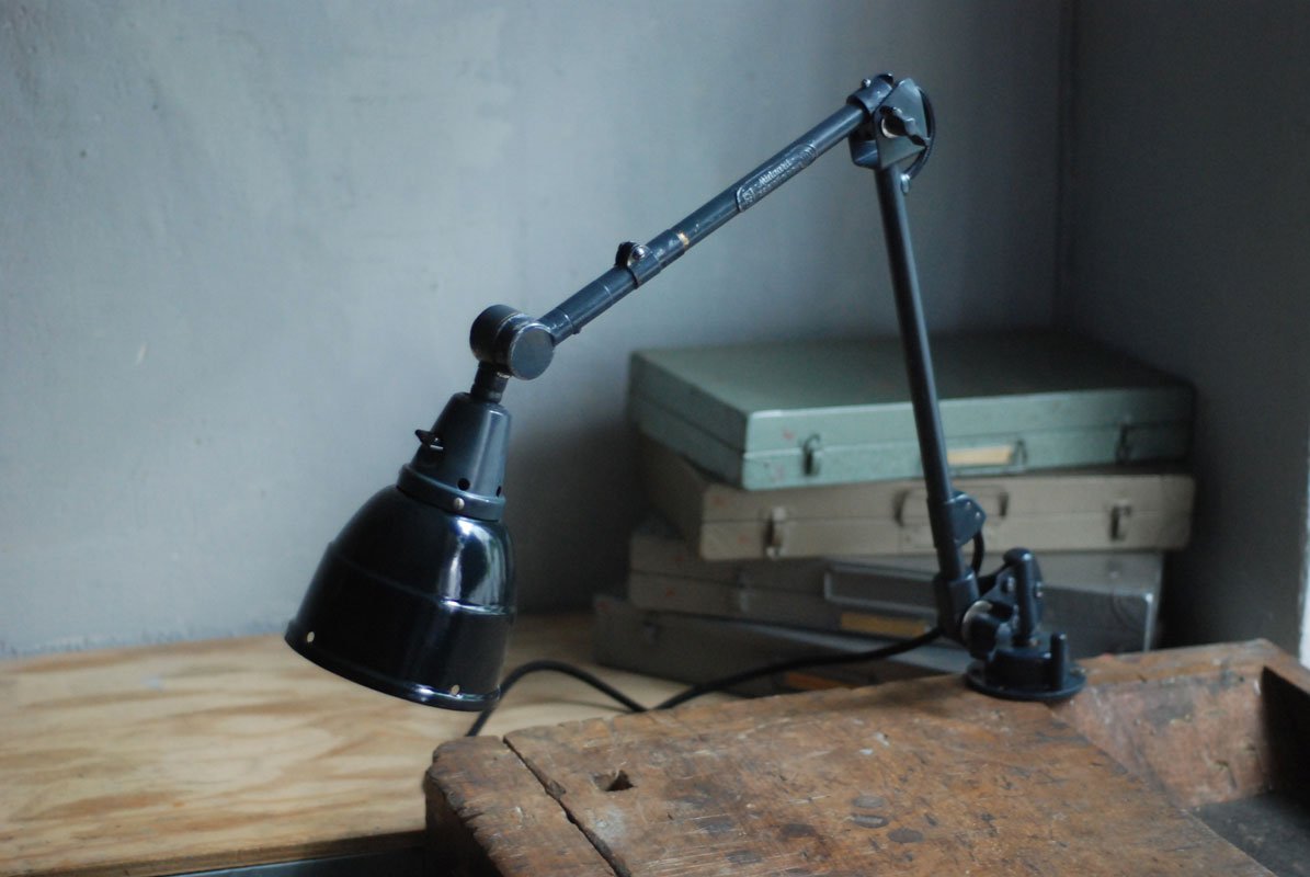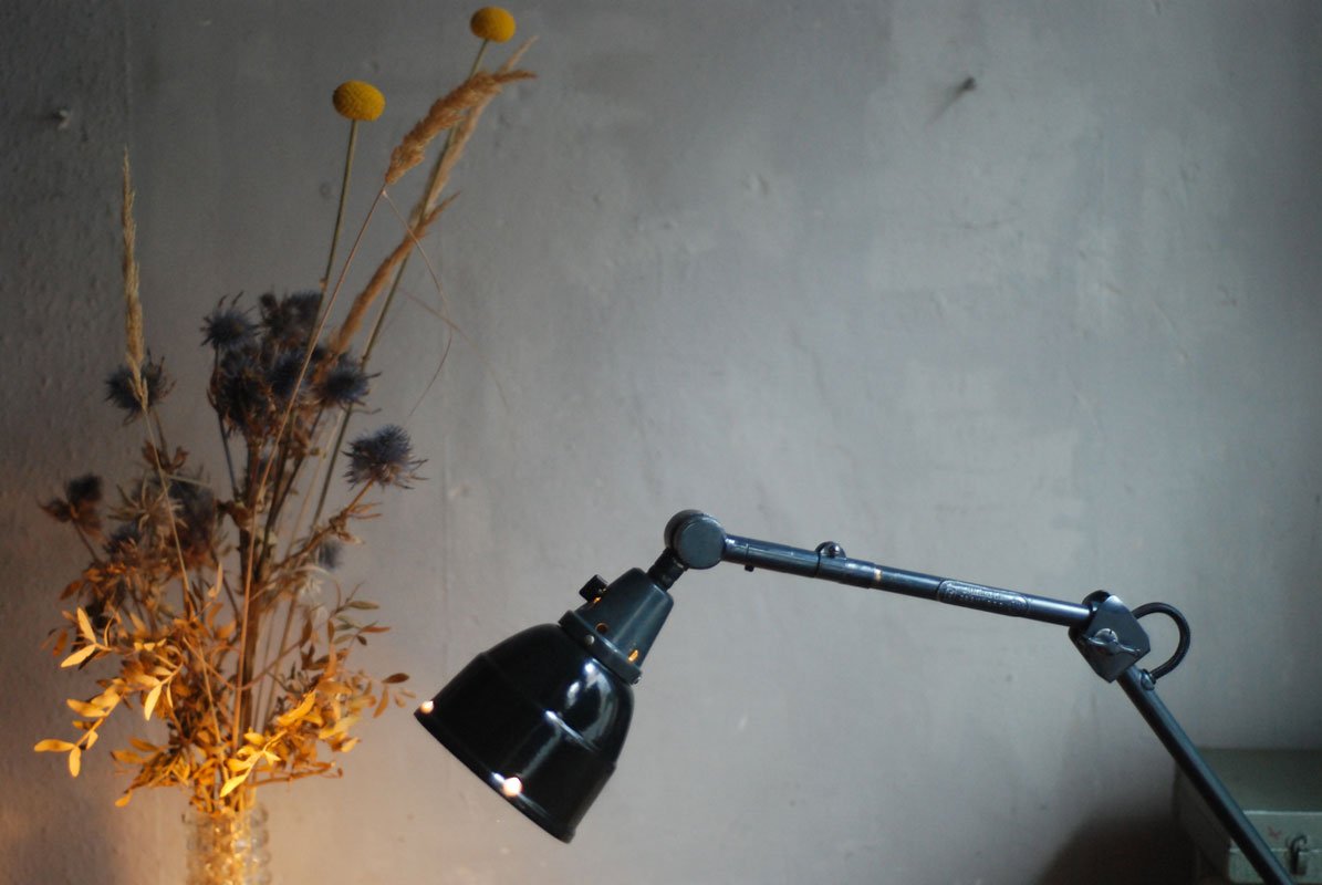 Alte Gelenklampe Midgard mit hübscher Patina und Emailleschirm.