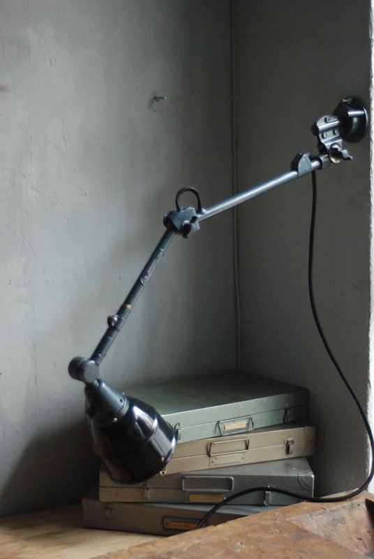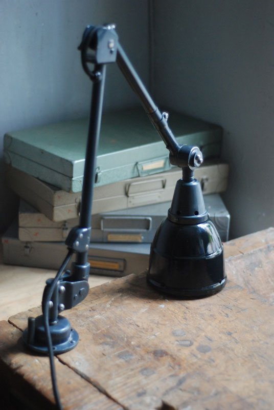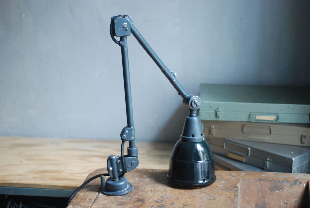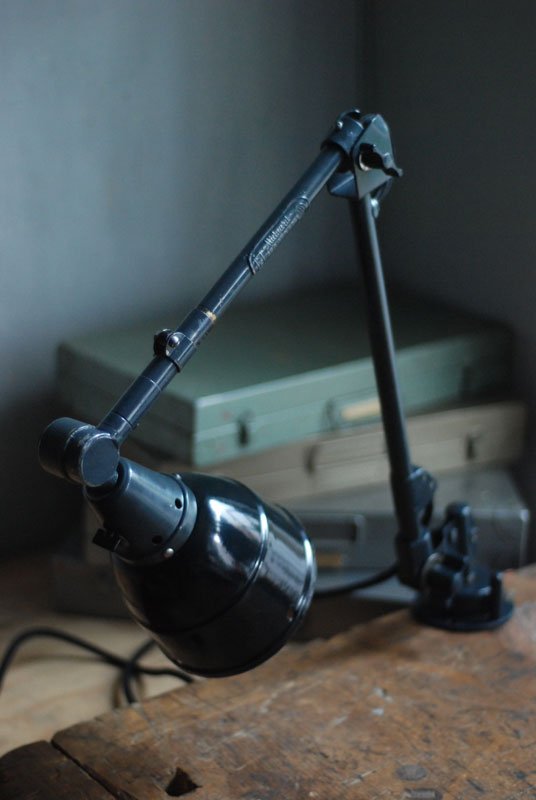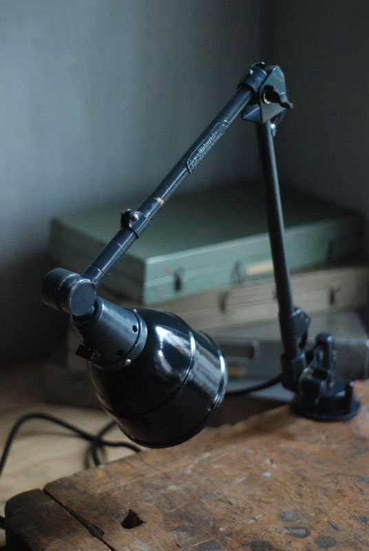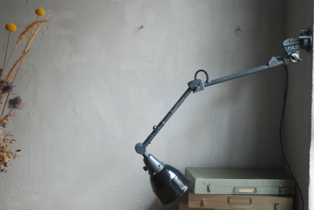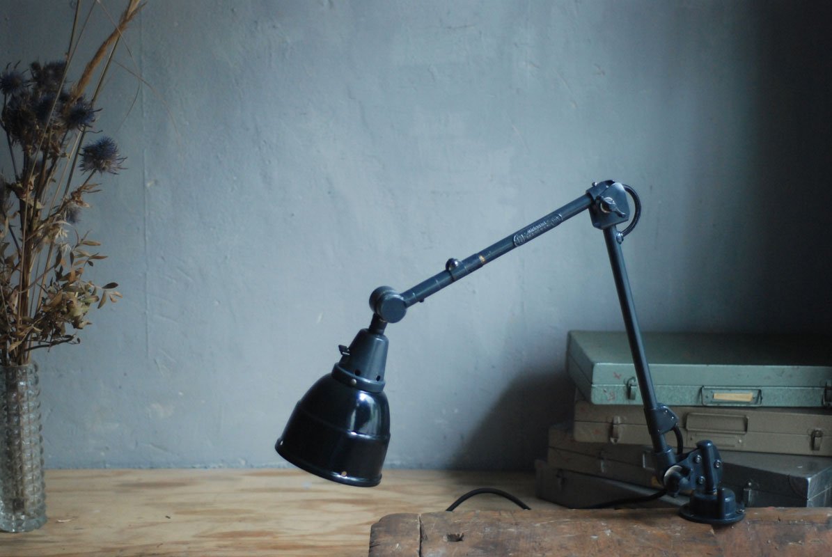 Alte Gelenklampe Midgard mit hübscher Patina und Emailleschirm.