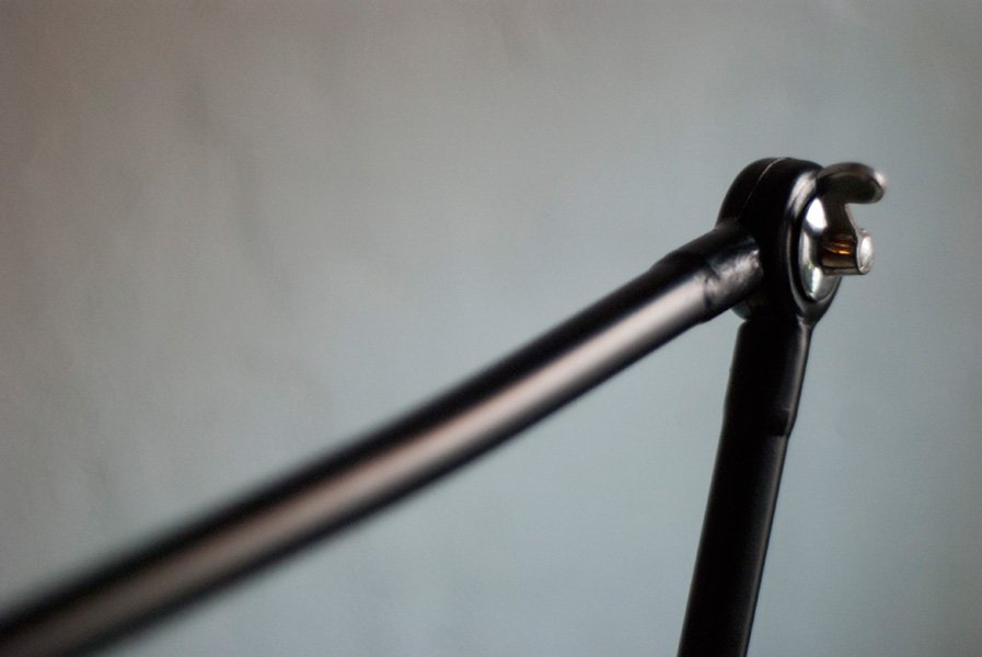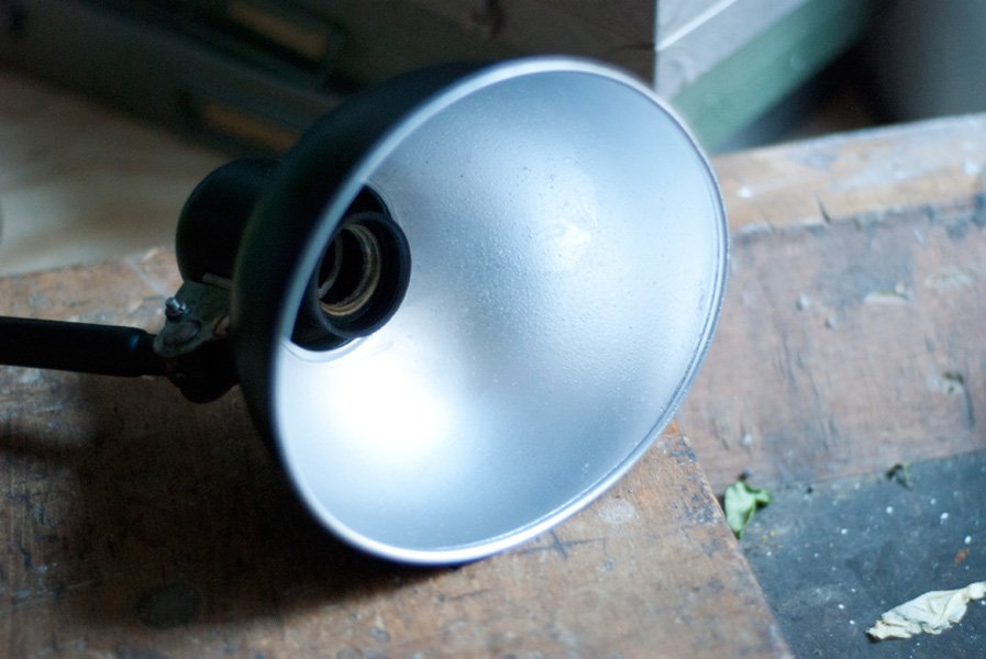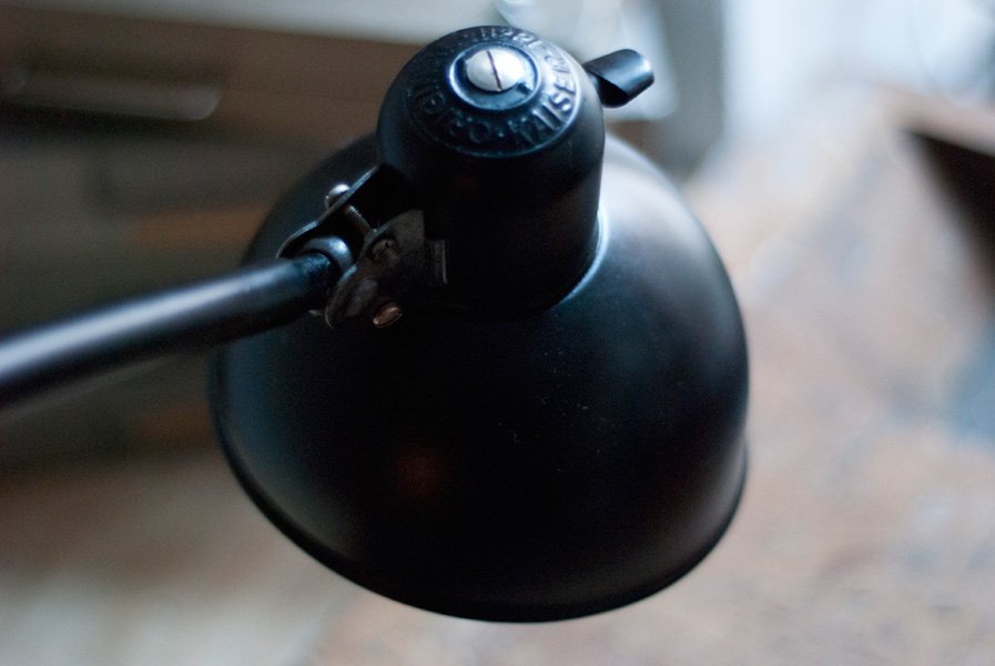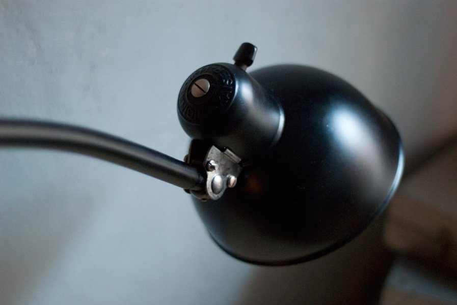 Die Elektrik wurde dreiadrig erneuert und generalüberholt. Es wurde ein schwarzes, stoffummanteltes Kabel verwendet.Die Leuchte wird mittels des original Drehschalters aus Bakelit betätigt. Die Technik der Leuchte funktioniert einwandfrei. Die Lampe lässt sich dank ihren zwei Kugelgelenken stufenlos bewegen. Der gute restaurierte gebrauchte Zustand weist leichte altersbedingte Gebrauchsspuren auf.