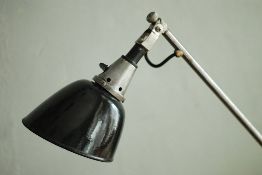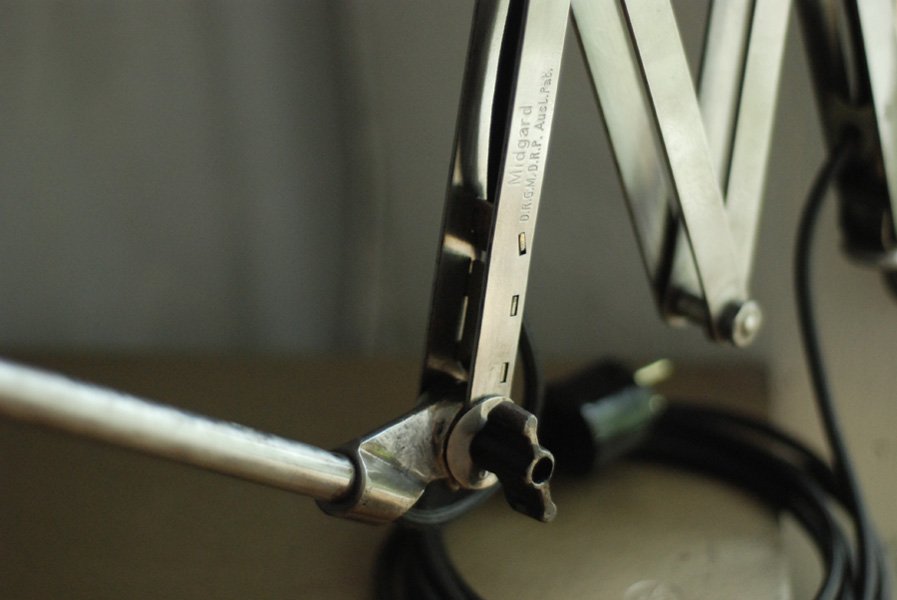Der Entwurf dieser einzigartigen Scherenlampe mit Doppelgelenk stammt von Curt Fischer, der ab ca. 1920 an der Idee des „lenkbaren Lichtes“ gearbeitet hat. Noch vor den so bekannten Entwürfen von Christian Dell oder Marianne Brandt setzte Curt Fischer mit der allseitig beweglichen Arbeitsplatzleuchte die Idee des so genannten ‚lenkbaren Lichtes‘ um. Die Metallwerkstatt im Bauhaus in Weimar wurde mit Midgard-Leuchten erhellt und diente den Bauhaus-Studenten als Vorbild und ist später auch in die Wohnzimmereinrichtung von Ilse und Walter Gropius in deren Meisterhaus am Dessauer Bauhaus belegbar.