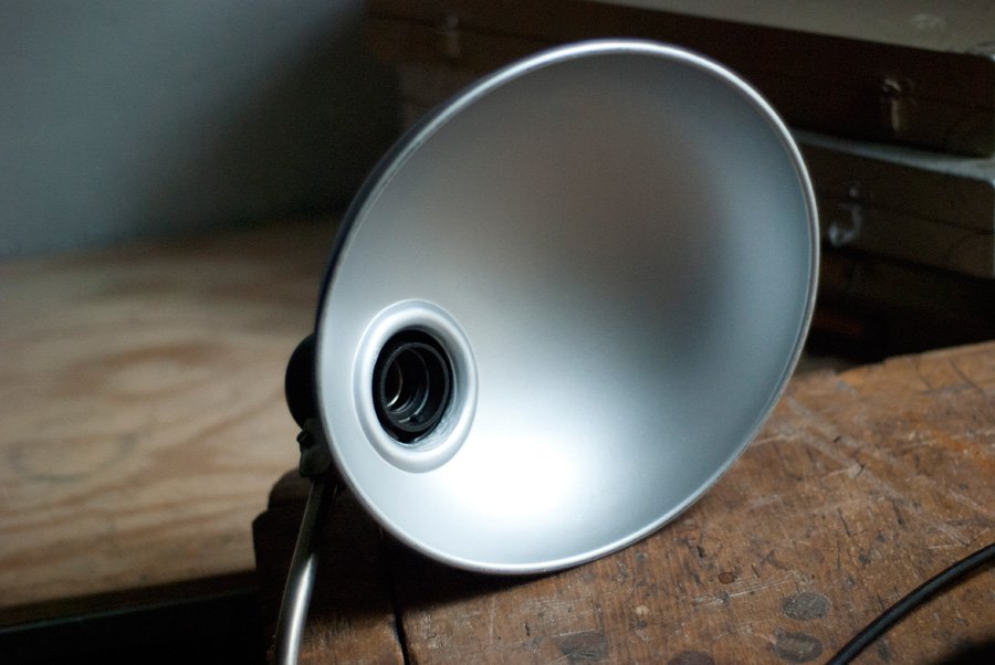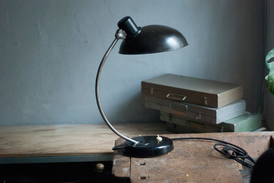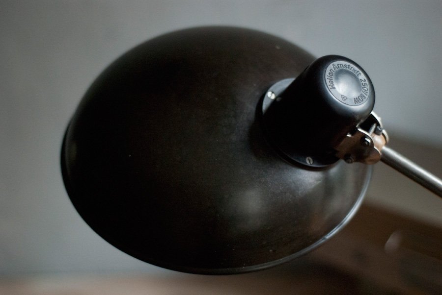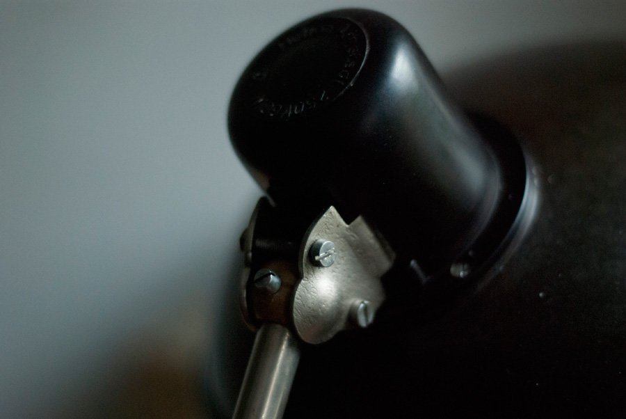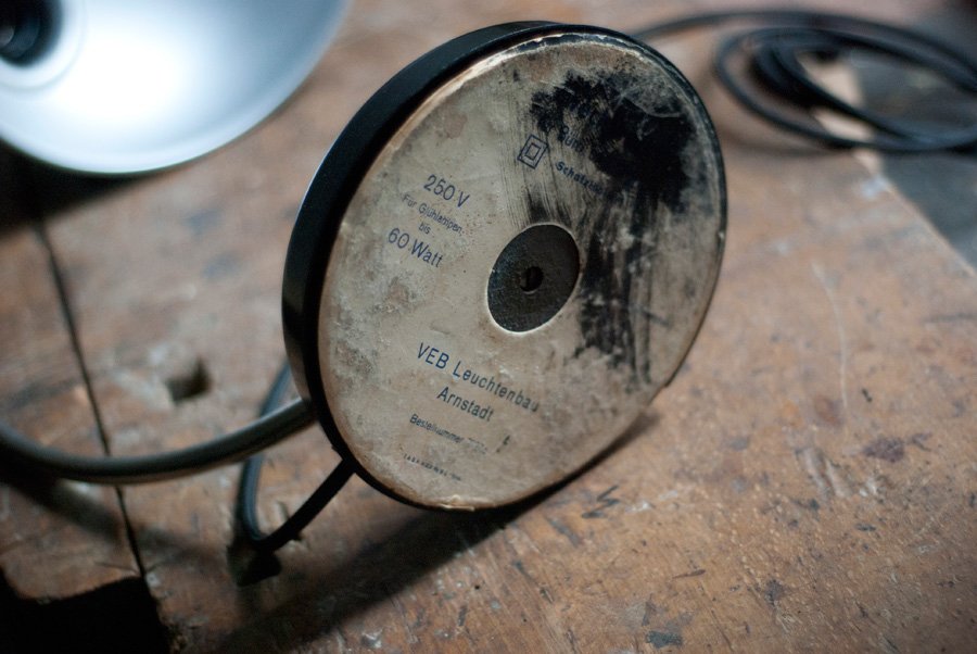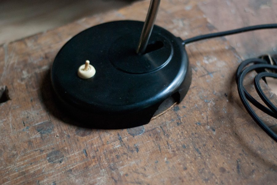 Die Elektrik wurde dreiadrig erneuert und generalüberholt. Es wurde ein schwarzes, stoffummanteltes Kabel verwendet. Die Leuchte wird mittels des original Kippschalters am Sockel betätigt.